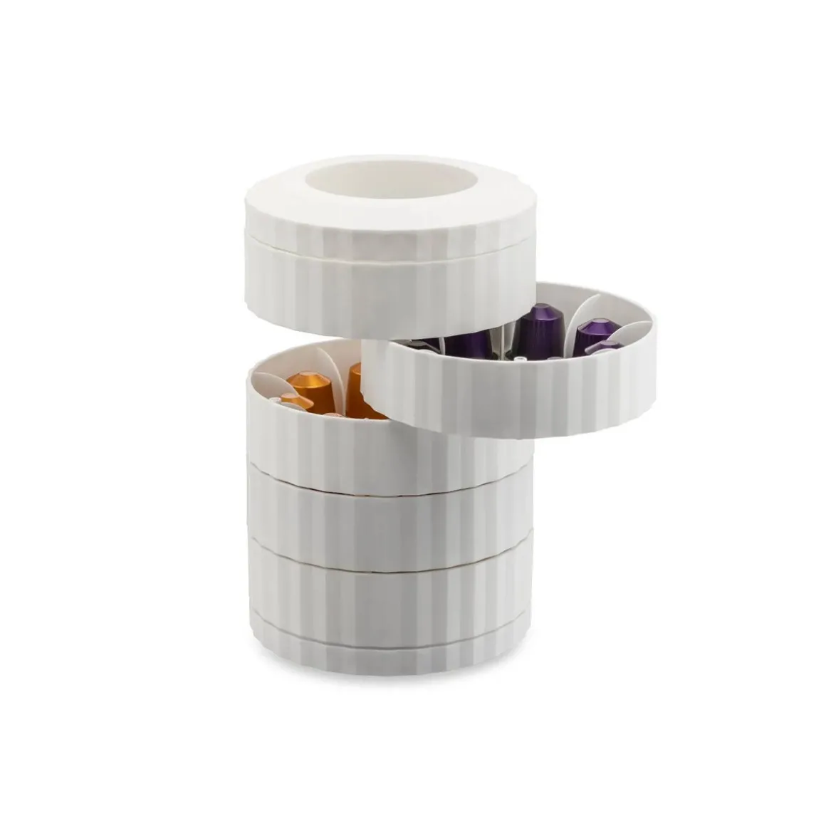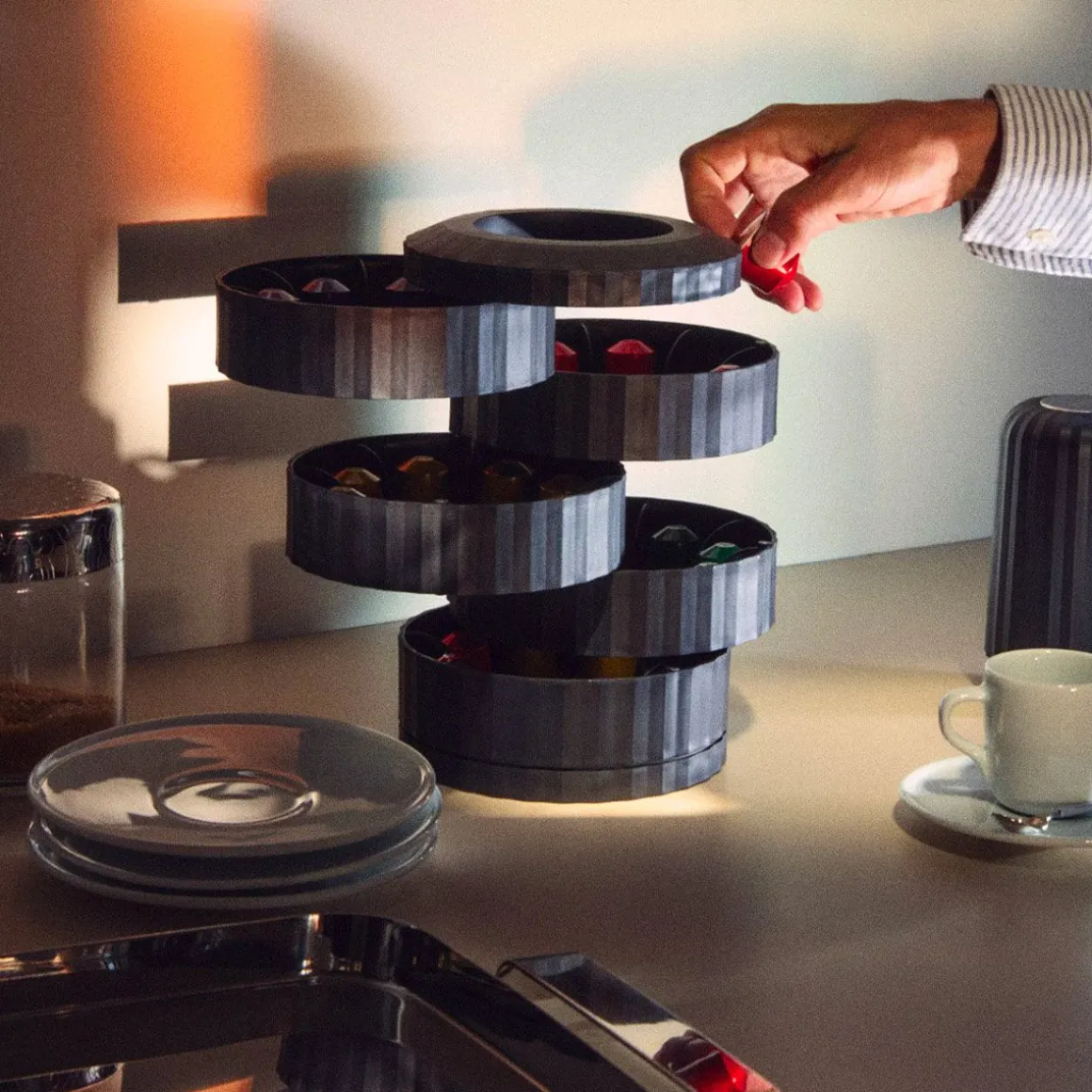 Porte-capsules Plissé de Alessi par Michele de Lucchi. Un accessoire indispensable pour garder vos capsules de café préférées toujours à portée de main et bien rangées. Ce contenant pratique aux airs de maquette d’un bâtiment moderne ne laisse aucun doute sur son designer : Michele de Lucchi. Un objet pratique et fascinant : le mécanisme d’ouverture des cinq compartiments dans lesquels sont rangées les capsules offre, par le jeu des volumes dynamiques, une expérience d’utilisation agréable et, d’une certaine manière, surprenante.
