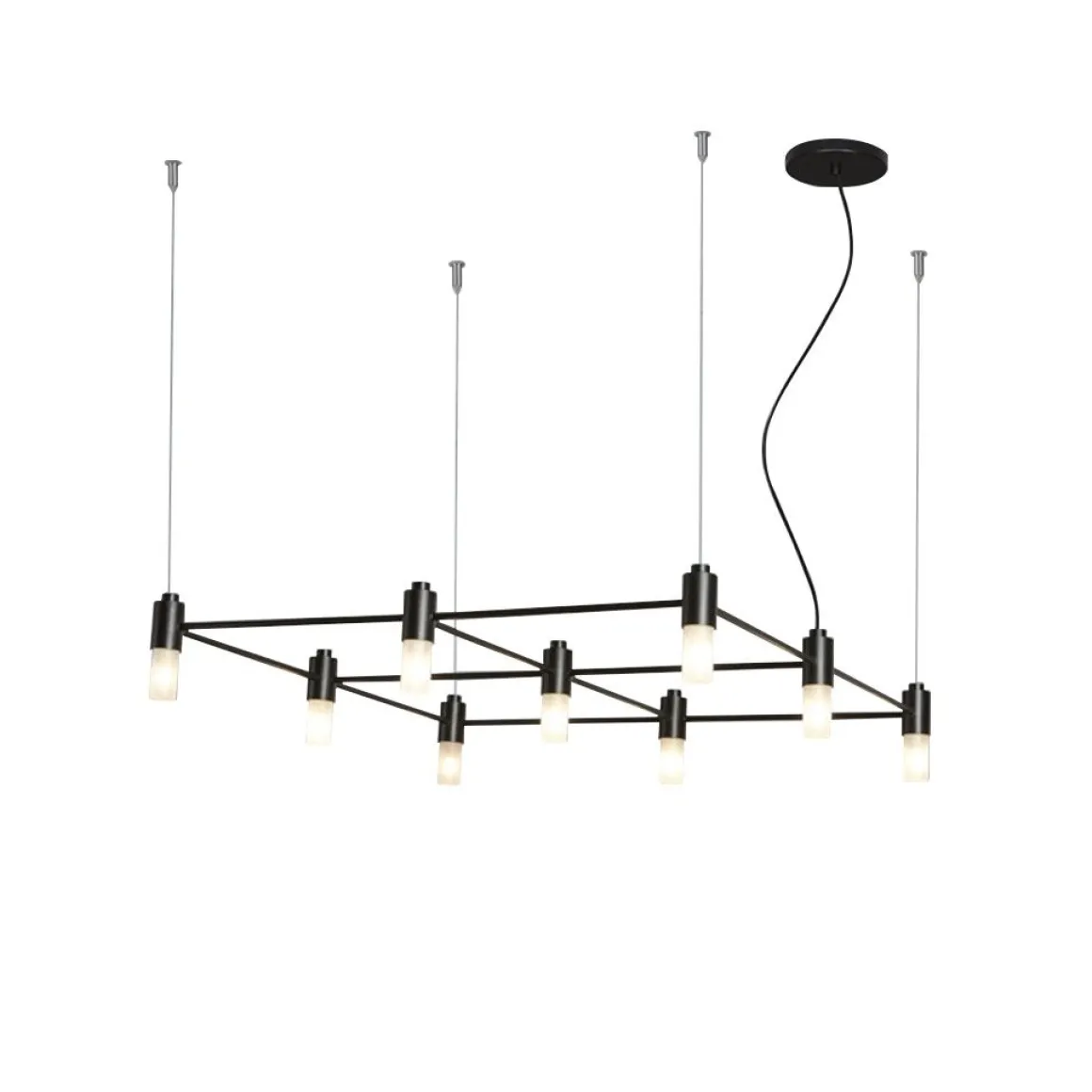 Suspension modulaire en tubes d’acier soudés et enduits de poudre. Les configurations possibles sont nombreuses et créent un système de grilles lumineuses.