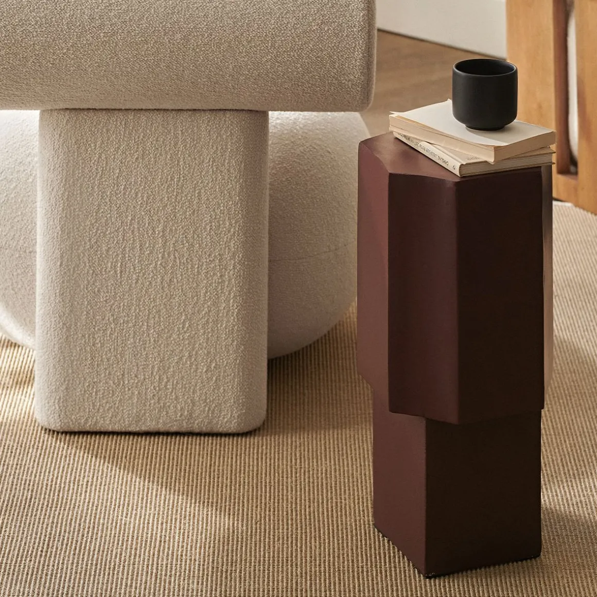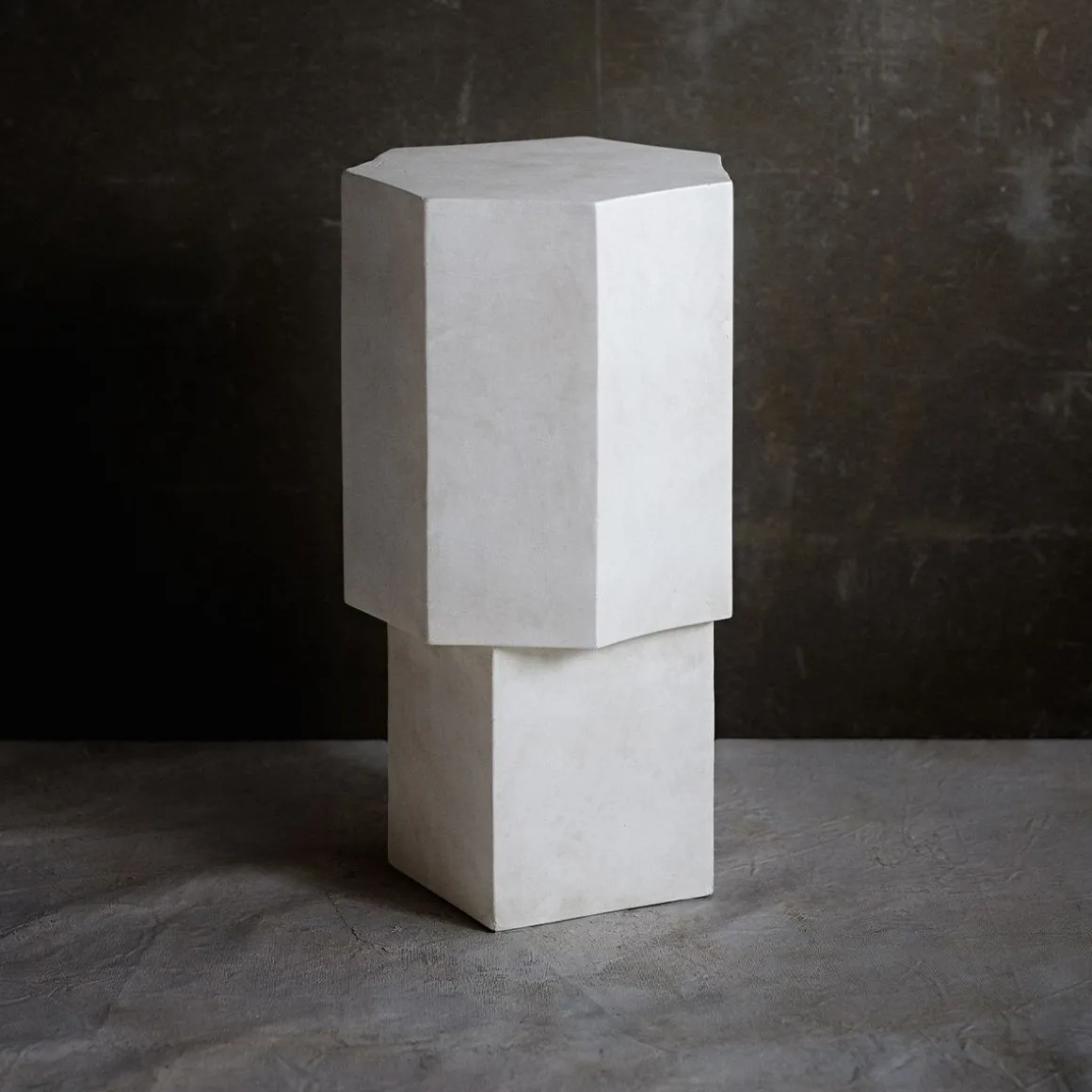Le quartz est un objet polyvalent semblable à une pierre, pouvant servir de table d’appoint, de socle ou de sculpture. Inspiré par la forme cristalline naturelle de la pierre de quartz, le quartz change d’apparence lorsqu’il est vu sous différents angles. Grâce à la matérialité brute du béton fibré armé peint à la main, la surface de Quartz présente une texture unique et tactile.