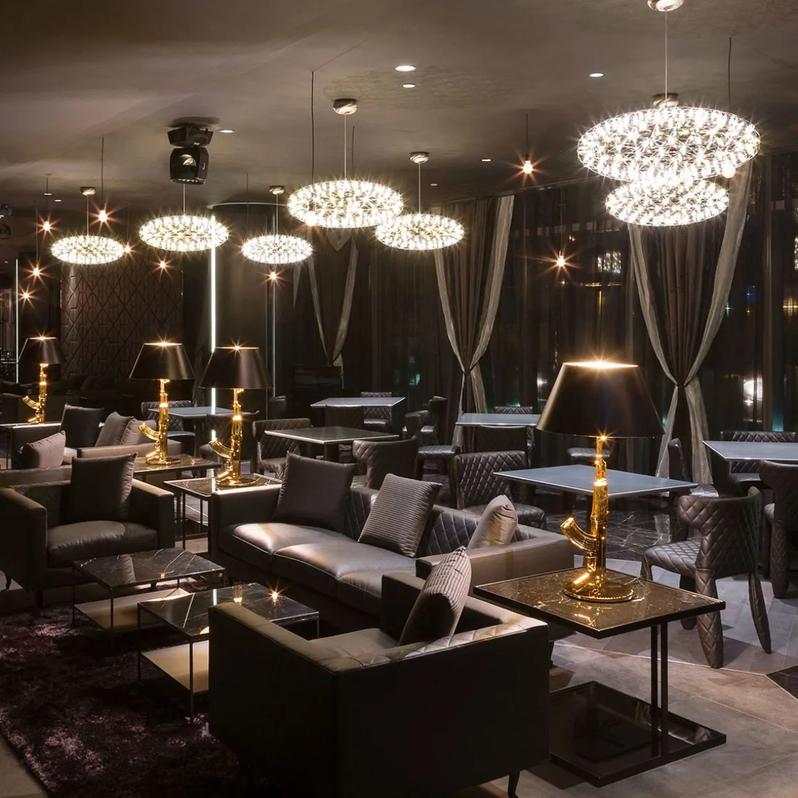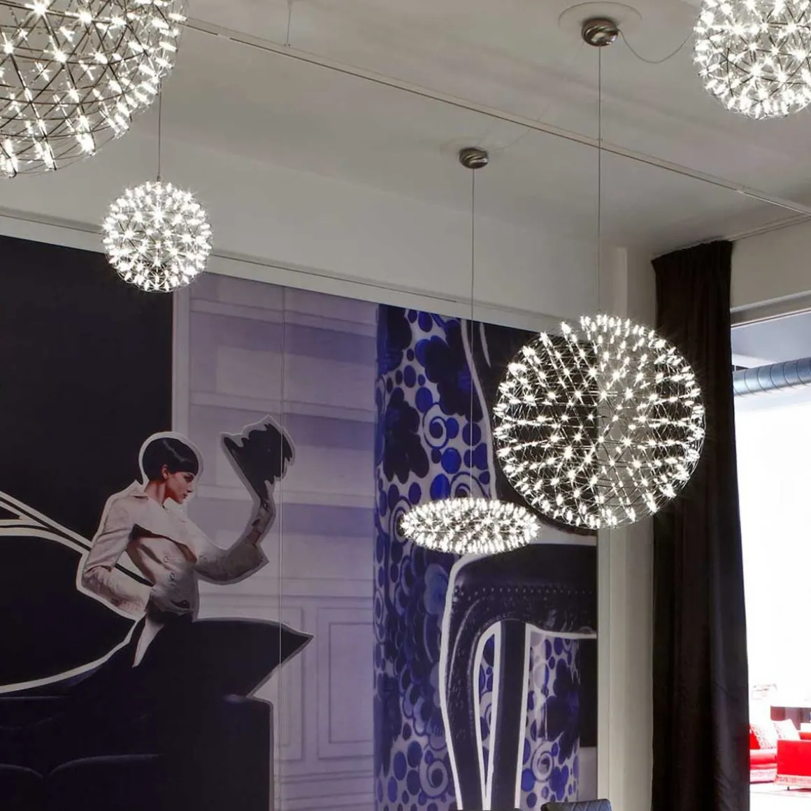 Raimond Zafu est une suspension design créée par Raimonds Puts avec OX-ID pour Moooi. Raimond Zafu contient 162 lampes LED. Regarder les étoiles est maintenant possible même pendant les nuits couvertes. Les sphères complexes de Raimond transportent le courant électrique. Les terminaux joignent alors ces chemins pour créer une ambiance atmosphérique.