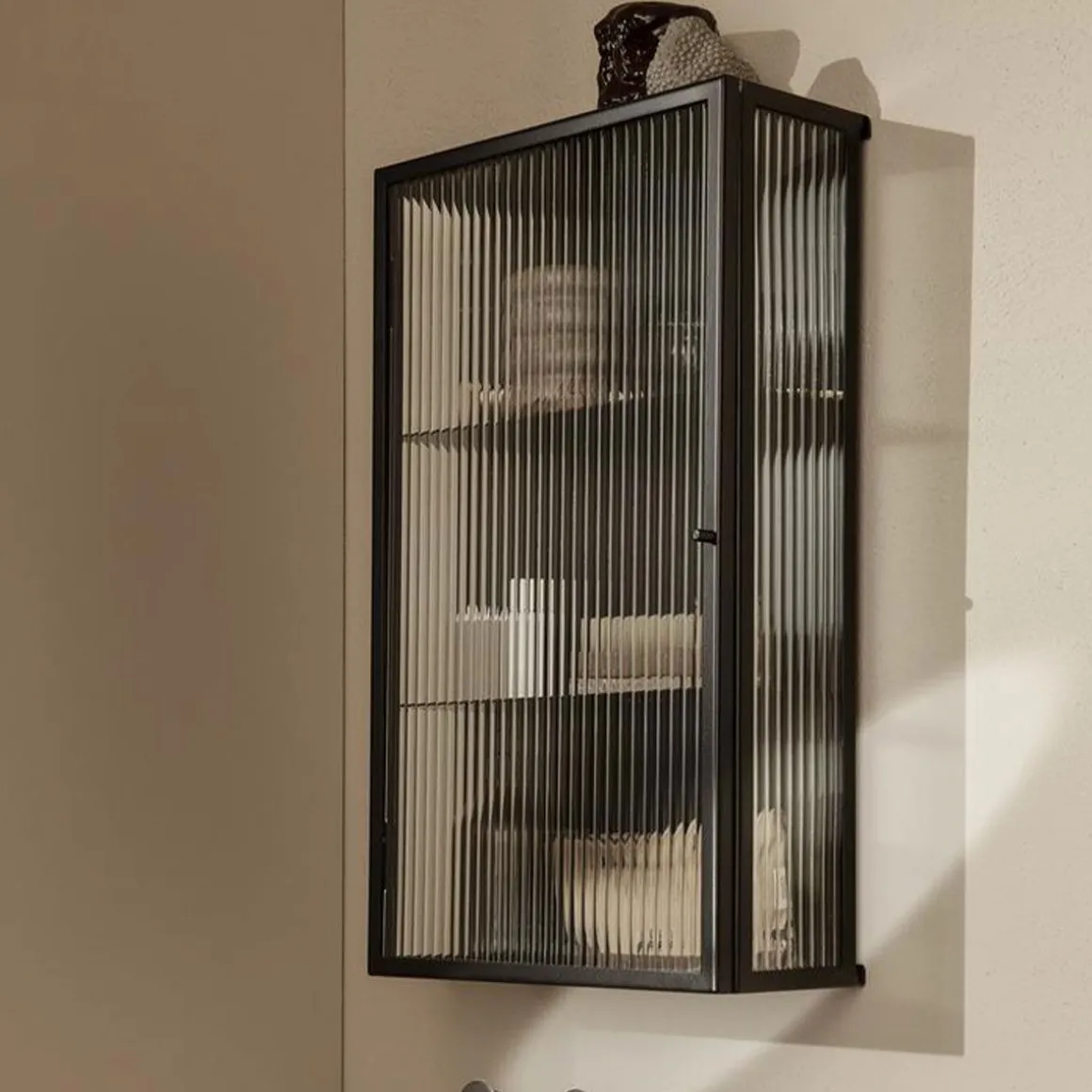 Profitant de la même esthétique industrielle que notre Haze Vitrine autonome, l’armoire murale Haze est, comme son nom l’indique, une armoire murale pratique pour ranger de petits objets. Le cadre en acier peint par poudrage noir est maintenant disponible avec d’élégants panneaux et porte en verre à roseaux, et est la solution idéale pour ranger les verres dans la cuisine ou les articles de beauté dans la salle de bain. Il fonctionne également bien dans un couloir rempli d’objets du quotidien tels que des clés et des lunettes de soleil.