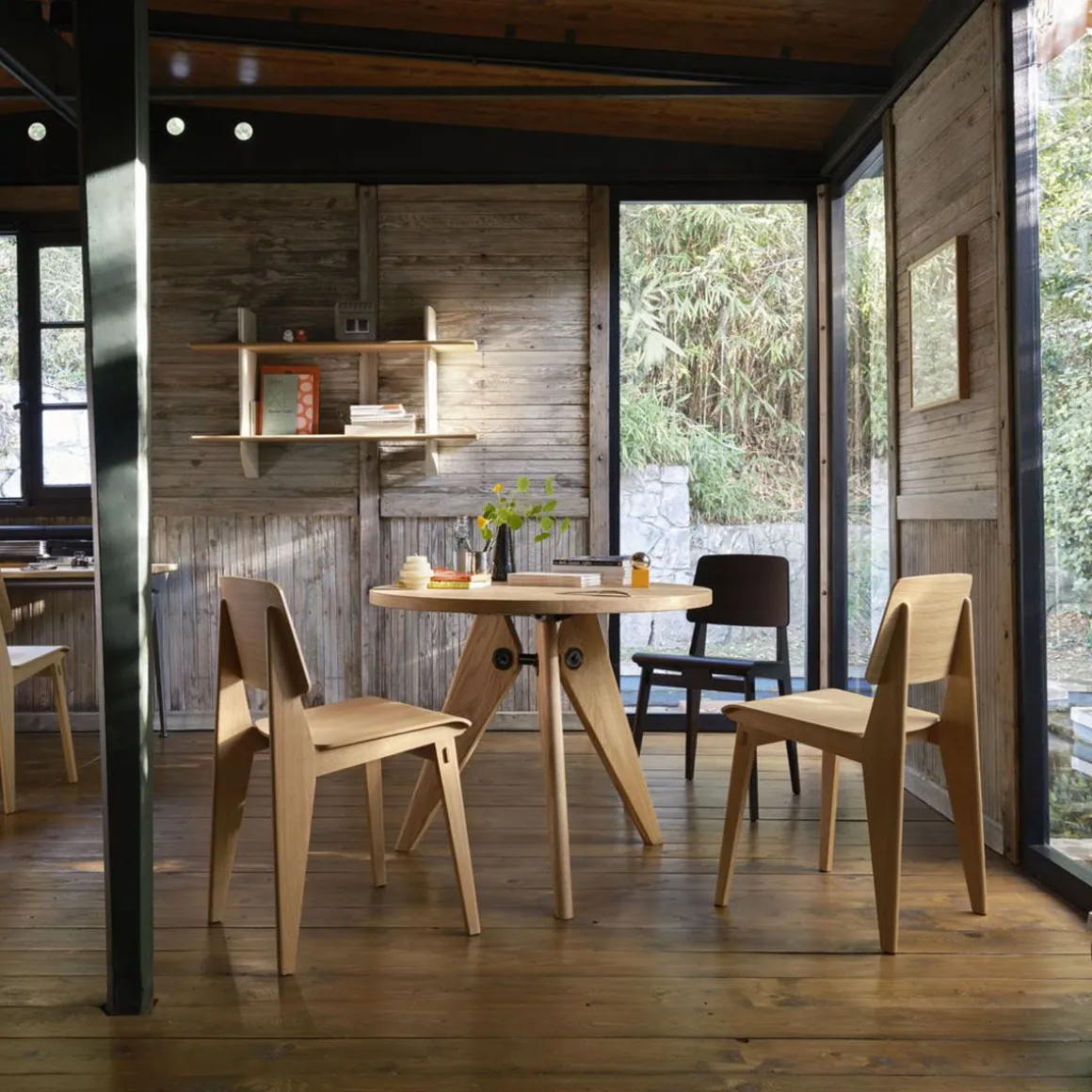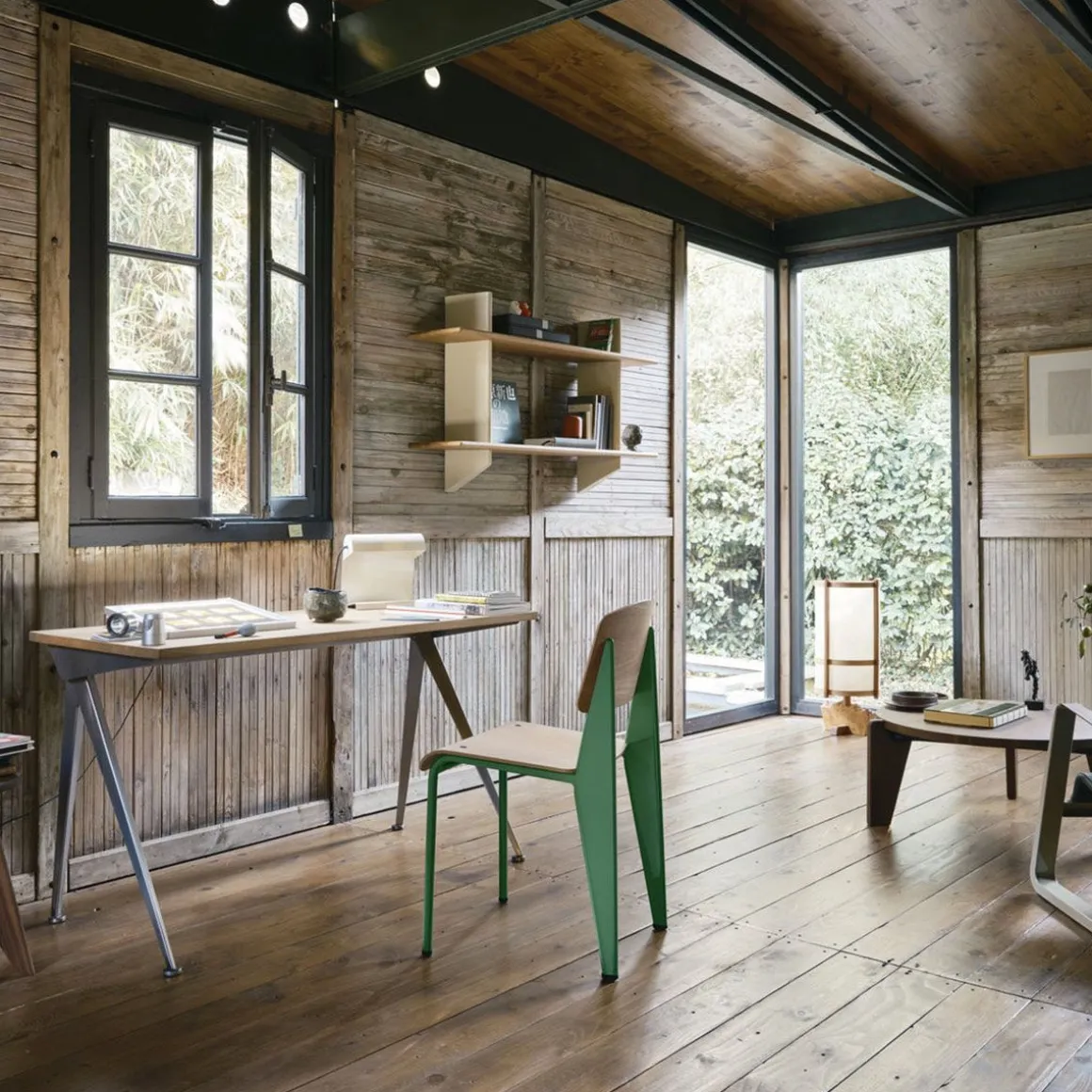 Les bibliothèques à fixer au mur étaient courantes dans les intérieurs de la première moitié du XXe siècle. Jean Prouvé a lui aussi conçu un certain nombre d’étagères murales, comme la Rayonnage Mural produit par Vitra, qui a été conçu à l’origine en 1936 pour l’École nationale professionnelle de la ville de Metz. Les deux support muraux verticaux de Rayonnage Mural sont réalisés en tôle pliée peinte. Avec leur forme aérodynamique qui rappelle le gouvernail d’un avion ou d’un navire, ils sont un élément récurrent des créations de Prouvé. Les supports muraux présentent des fentes horizontales réalisées avec précision dans lesquelles sont insérées les étagères en bois massif. Ces deux matériaux à fort contraste forment ensemble une étagère pratique qui possède les qualités sculpturales d’un objet esthétique. Les étagères en bois se décline en chêne clair ou foncé, tandis que les support muraux sont disponibles dans différentes couleurs originales de Prouvé.
