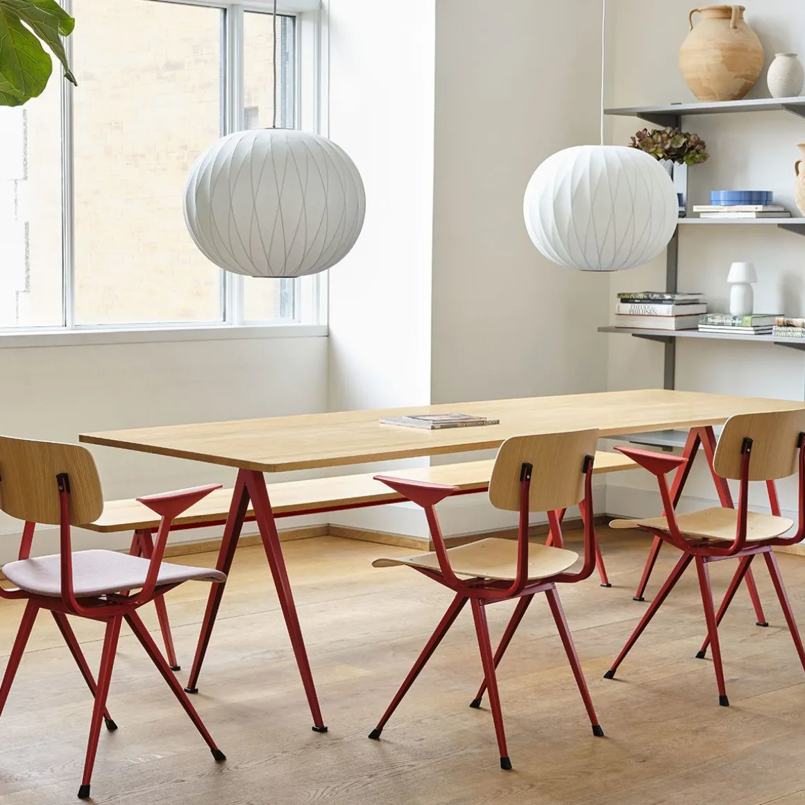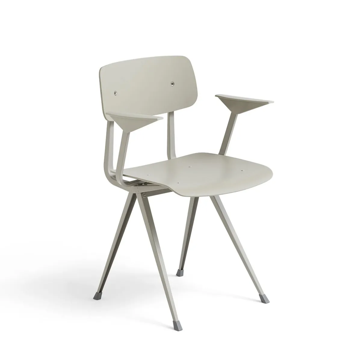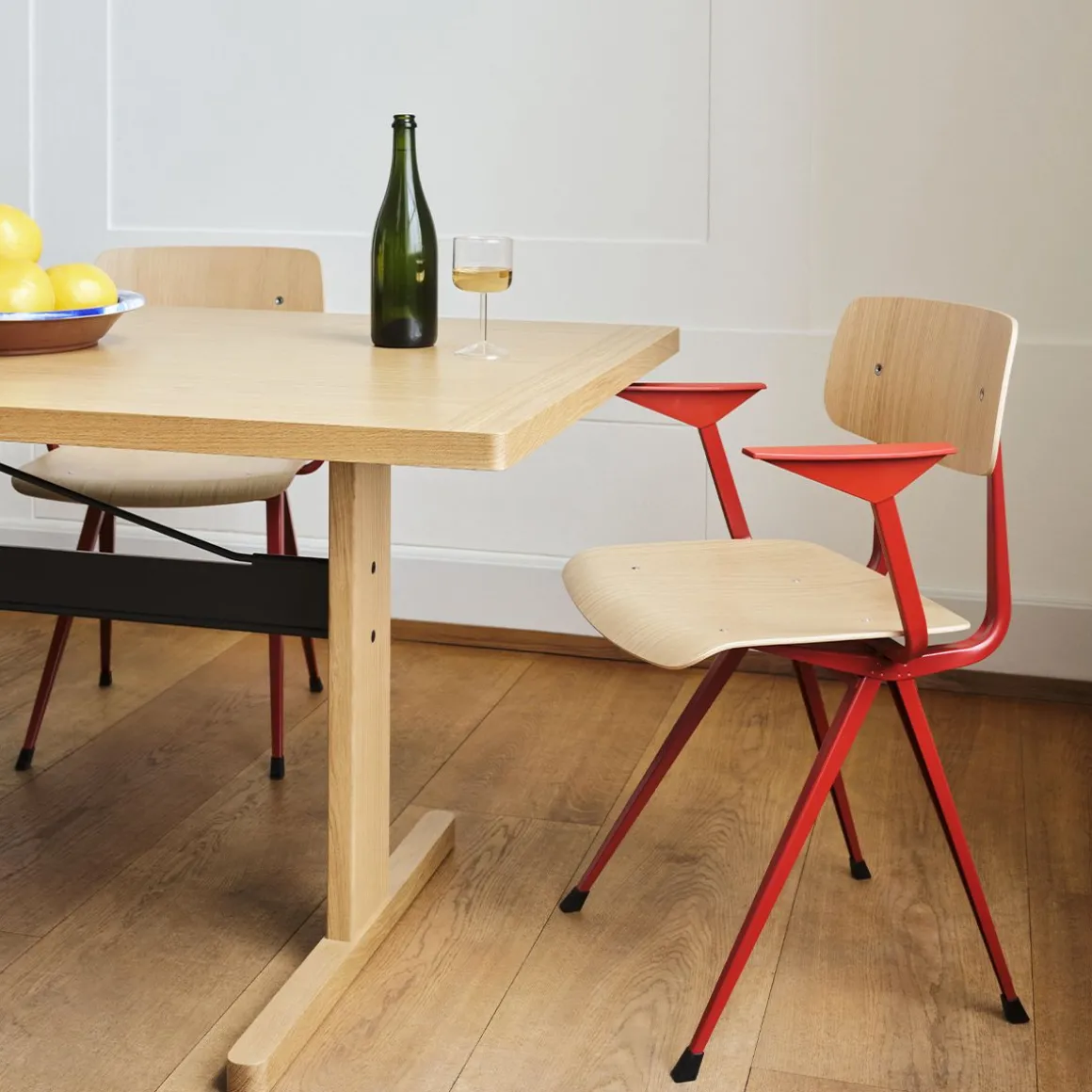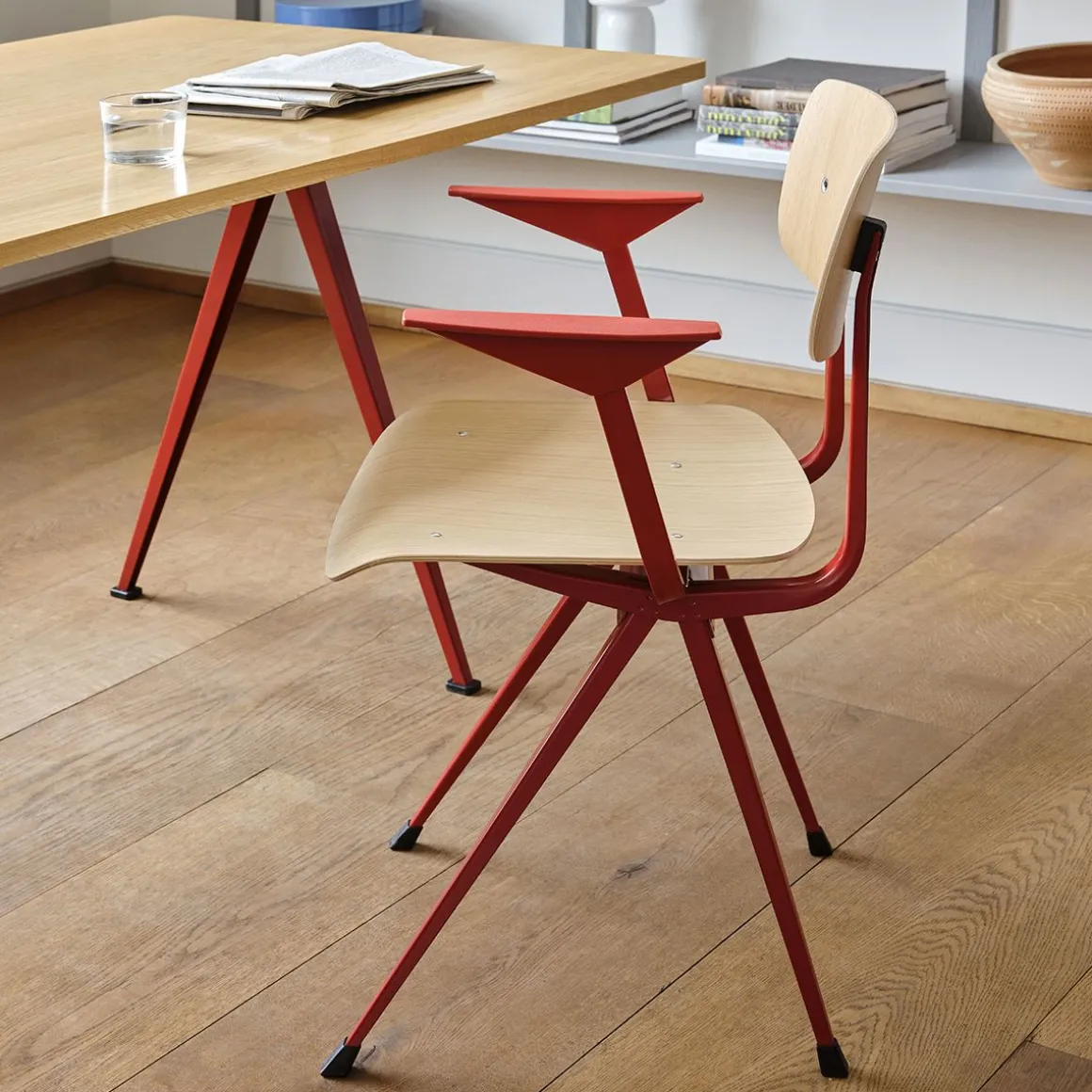 Result Armchair de Hay. Le fauteuil Result partage la même base en tôle d’acier mince, le siège et le dossier en chêne que le Result Chair original, mais est complété par des accoudoirs surélevés qui apportent un confort et une fonctionnalité supplémentaires au design. Créée à l’origine par Friso Kramer et Wim Rietveld alors qu’ils travaillaient chez Ahrend dans les années 1950, la collection en acier découpé a été relancée par HAY en collaboration avec Ahrend. Il est disponible dans une variété de finitions en bois et de couleurs de base, ainsi qu’une variante avec assise rembourrée et une version entièrement rembourrée proposée dans une large gamme d’options de textiles et de cuir. Toutes les variantes peuvent être coordonnées avec la Pyramid Table, ce qui en fait une configuration de sièges polyvalente pour une utilisation dans de nombreux contextes publics et privés.