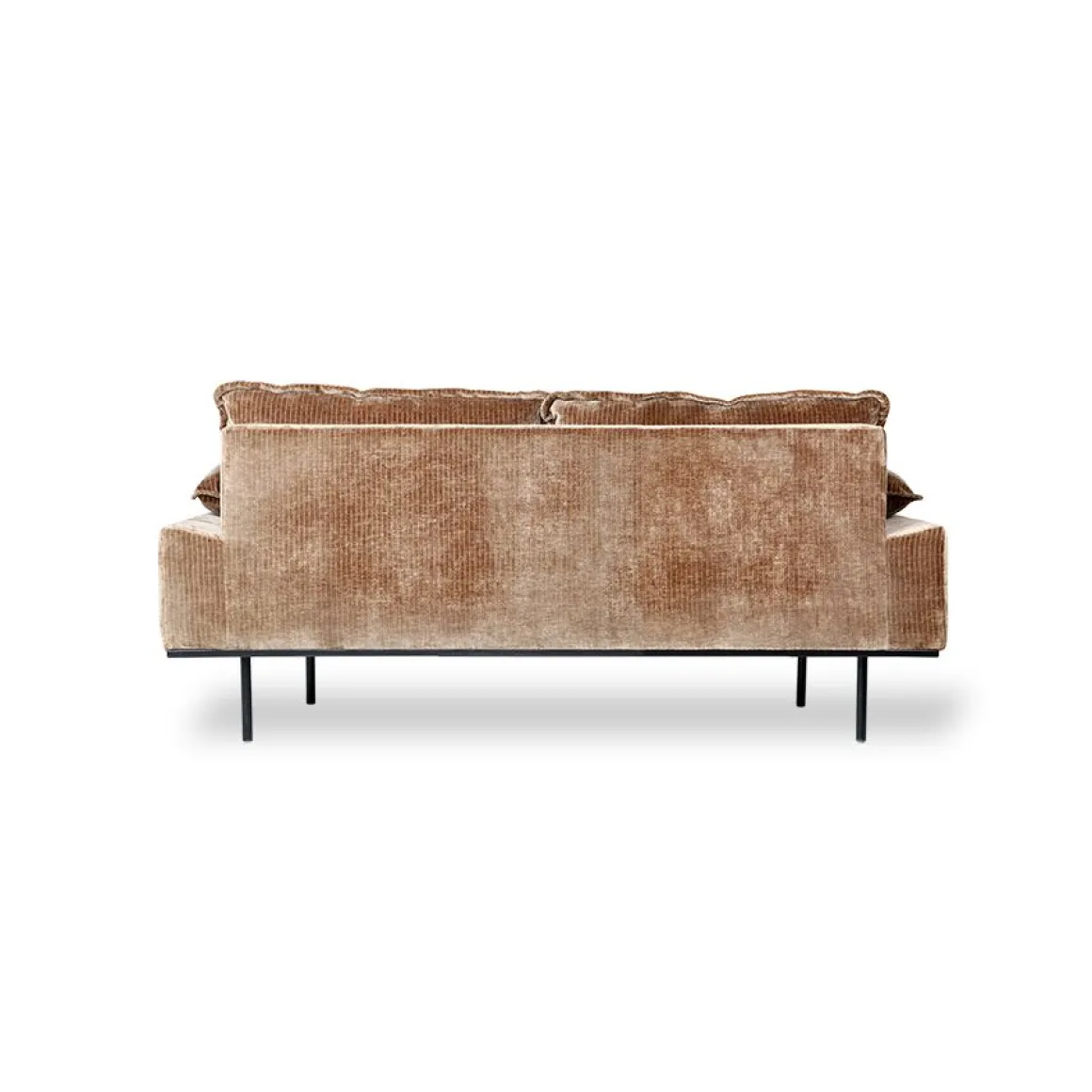 Canapé rétro 2 place en textile velours, cuir ou tissus. Le canapé a de petits pieds en métal laqué noir.