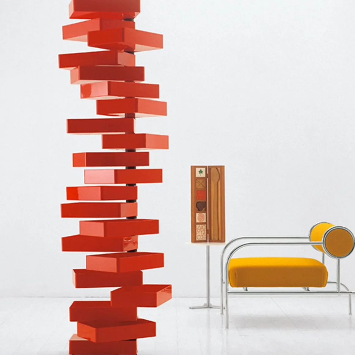Le meuble Revolving cabinet fait partie de ces pièces mythiques du design des années 70 qui ont révolutionné les intérieurs. Créée par Shiro Kuramata et éditée par Cappellini, cette commode en matériau acrylique poli rouge est équipée de 20 tiroirs pivotants sur une barre verticale en métal. Telle une sculpture domestique évolutive, sa forme est en perpétuel changement selon la position des tiroirs. Une façon ludique, étonnante et particulièrement originale de ranger des accessoires de bureaux ou tous les menus objets qui trainent dans la maison.