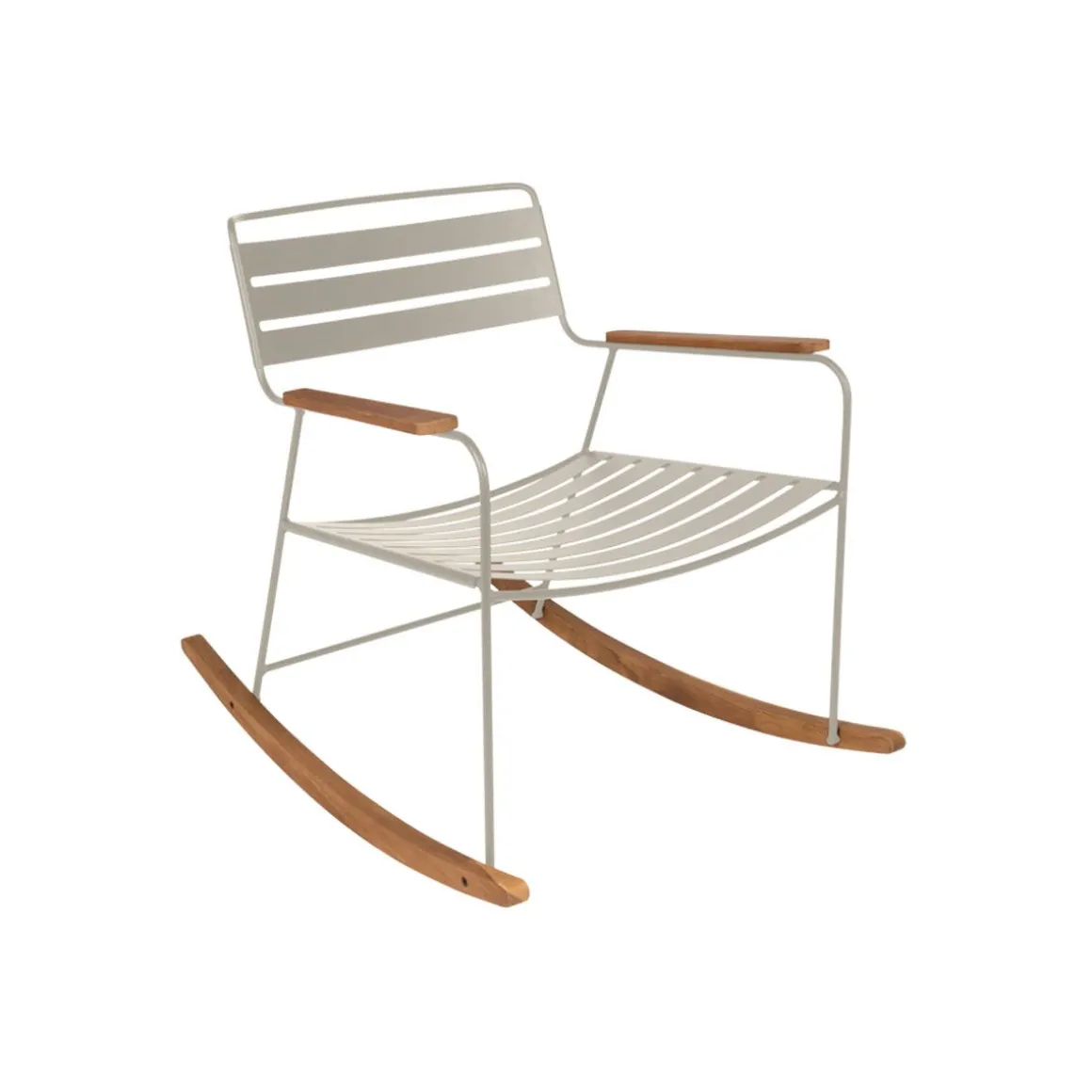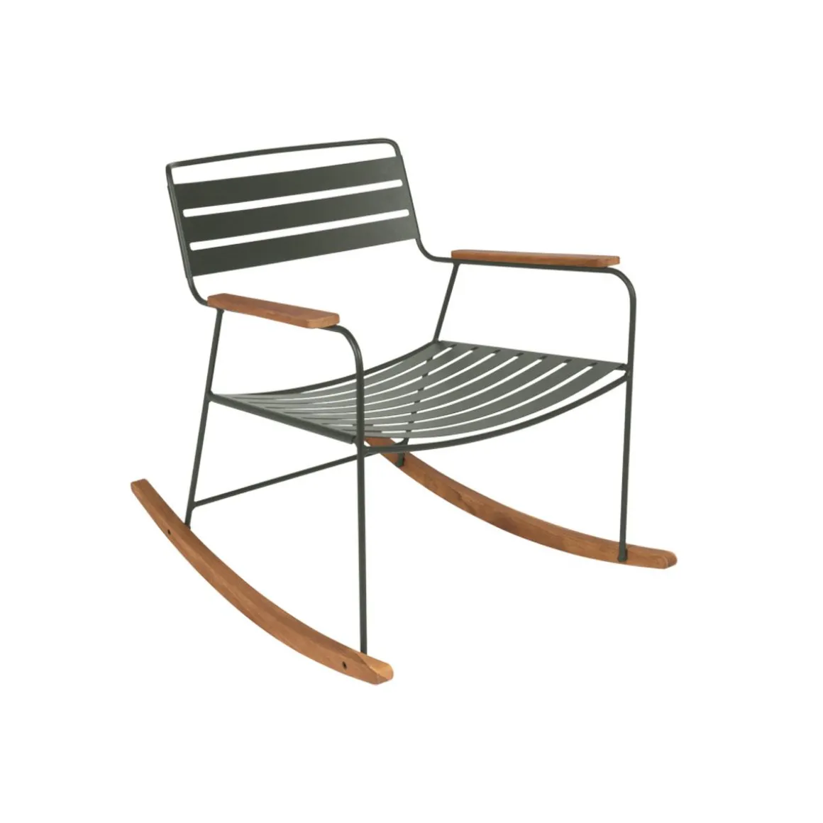 Rocking chair – Surprising de Fermob par Harald Guggenbichler. Le Rocking chair Surprising révèle une silhouette délicate. L’alliance de la structure filaire, des fines lattes en acier et du teck résume parfaitement le savoir-faire de Fermob et sa volonté constante de combiner les matériaux. Sur votre terrasse ou dans votre séjour, fermez les yeux le temps d’une courte pause et laissez-vous bercer par le fauteuil à bascule Surprising. Ergonomique, son point d’équilibre optimal accompagne vos moments dédiés : lecture, dessin, travail… Les occasions de s’y réfugier sont nombreuses. Beaucoup d’allure pour cette pièce contemporaine convoitée, qui saura se faire désirer lors d’une réunion familiale ou d’un apéro entre amis.