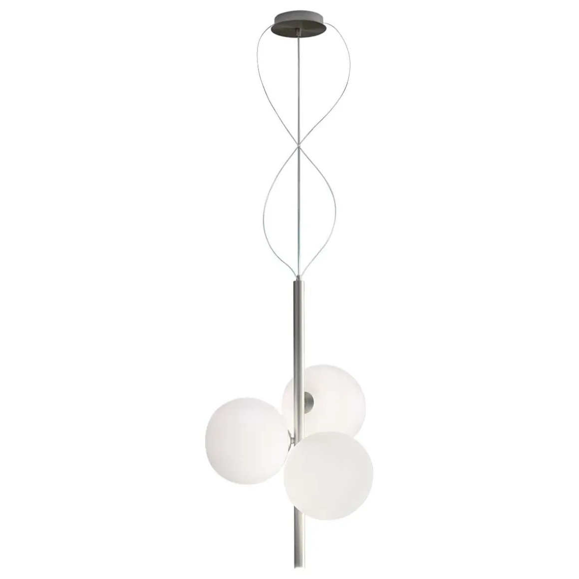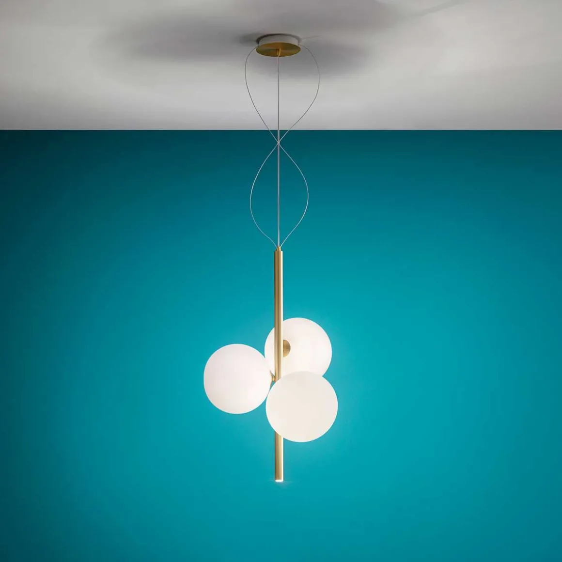 Sat Light SO est une lampe à suspension avec trois sphères de verre soufflé blanc givré. Sa structure est disponible en nickel brossé ou or brossé. Chaque sphère contient une ampoule E14 créant une émission de lumière diffuse. En outre, la tige verticale contient un spot LED Downlight. Ce luminaire propose donc une double émission lumineuse.
