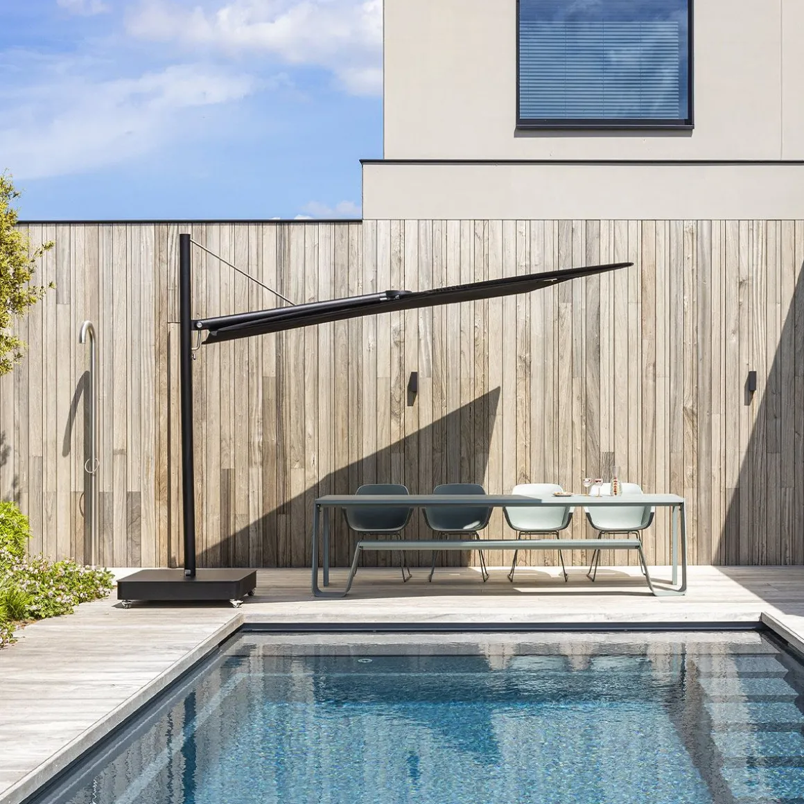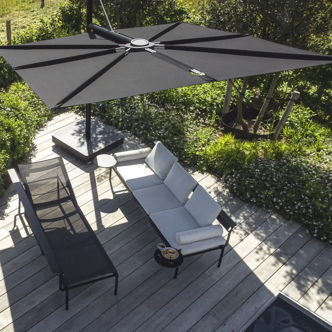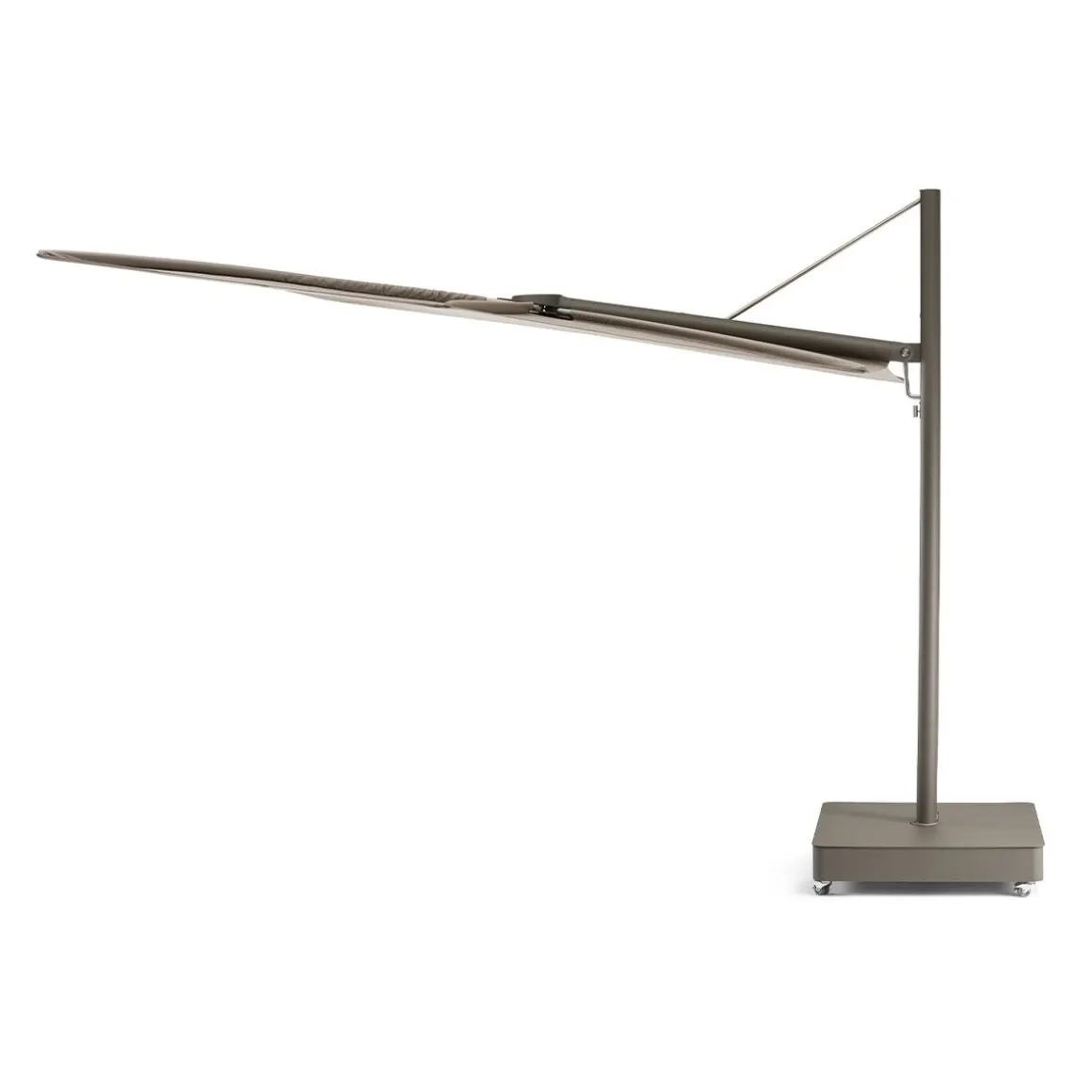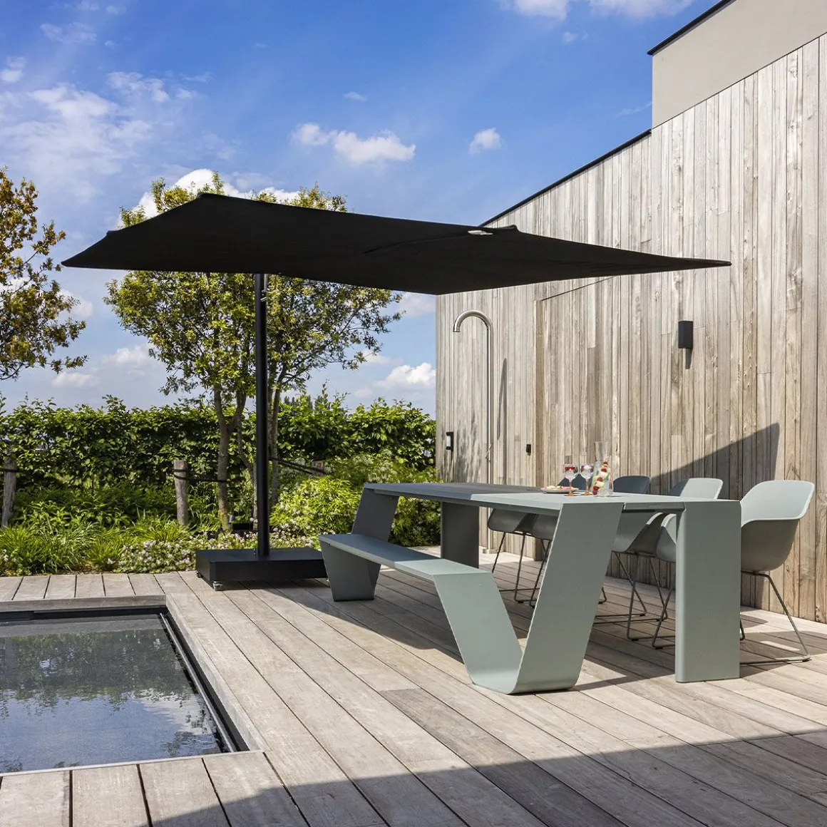 Sensu de Extremis par Dirk Wynants. Parasol de jardin rotatif raffiné allie la sérénité d’un design plat à la fonctionnalité d’un système d’éventail manuel. Contrairement aux parasols traditionnels à mât central, Sensu ne prend pas de place sur et sous votre table, ouvert comme fermé. Tournez et/ou inclinez son abat-jour pour suivre le soleil tout au long de la journée.