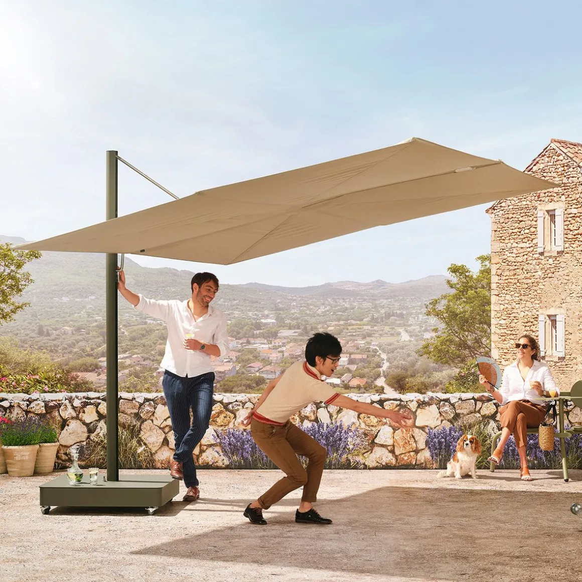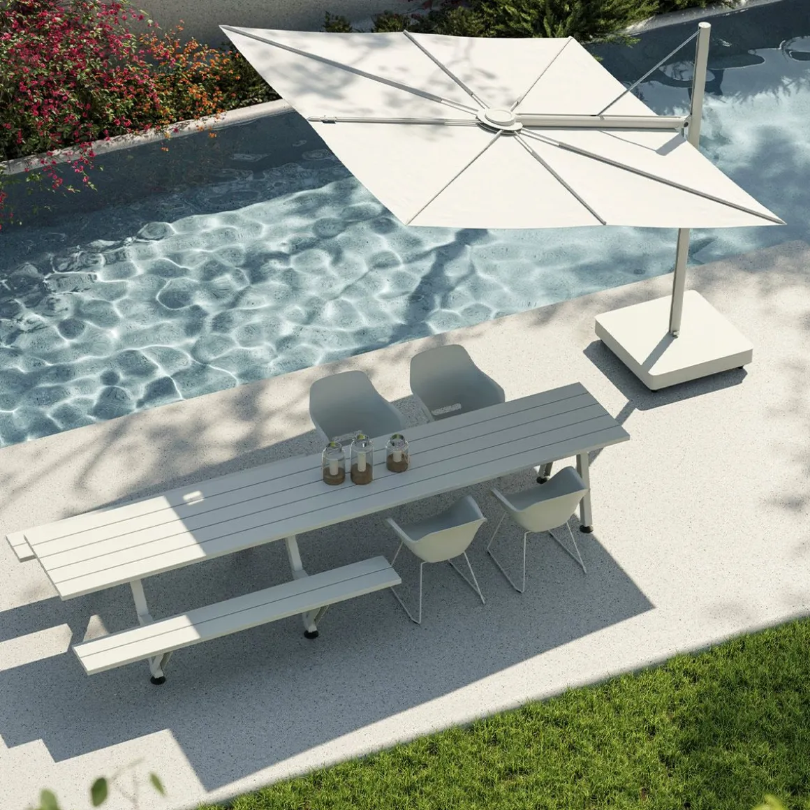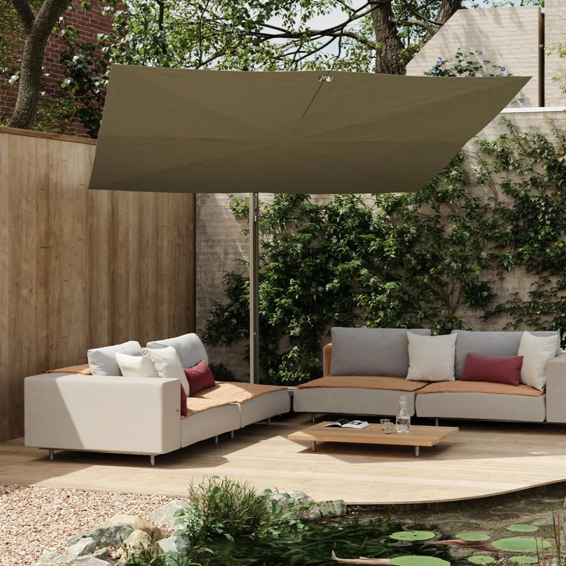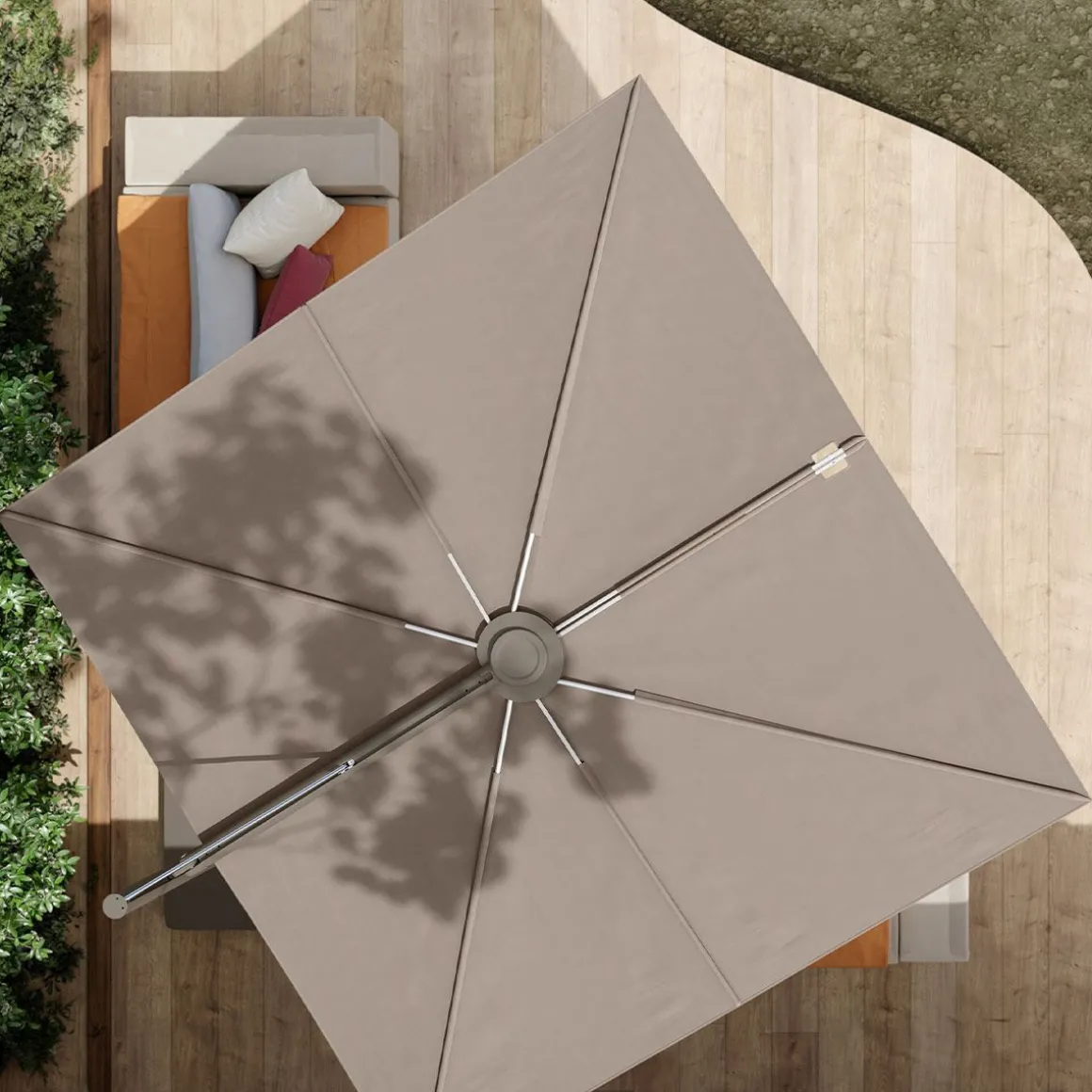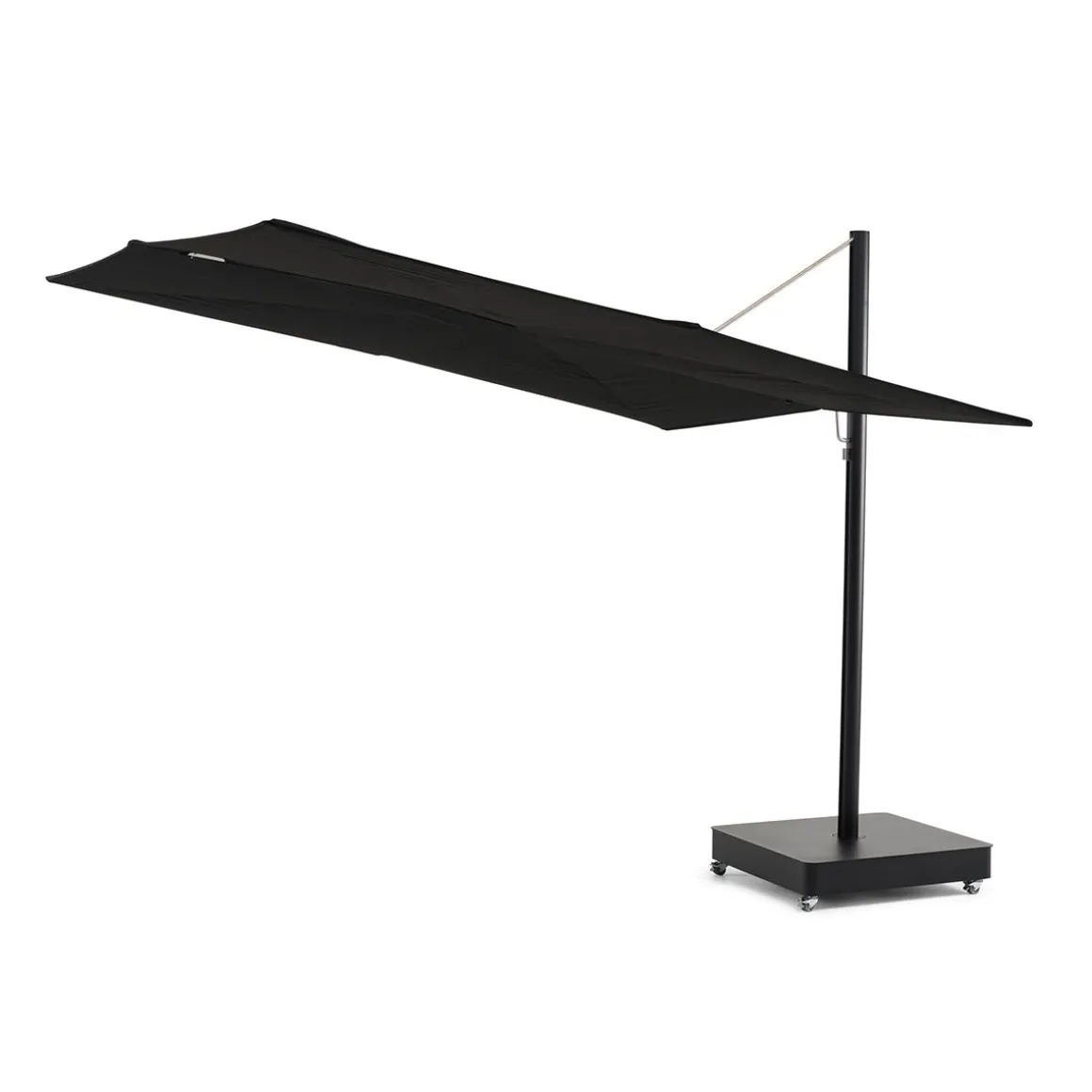 Sensu de Extremis par Dirk Wynants. Parasol de jardin rotatif raffiné allie la sérénité d’un design plat à la fonctionnalité d’un système d’éventail manuel. Contrairement aux parasols traditionnels à mât central, Sensu ne prend pas de place sur et sous votre table, ouvert comme fermé. Tournez et/ou inclinez son abat-jour pour suivre le soleil tout au long de la journée.