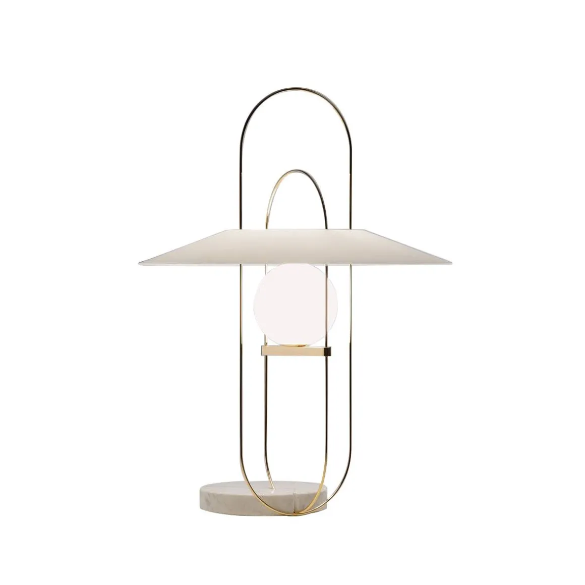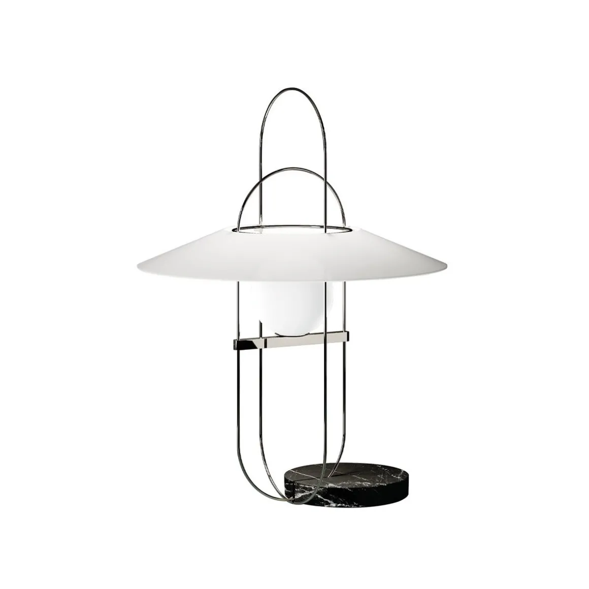 Matériaux : cadre en métal galvanisé, socle en marbre de Carrare, diffuseur sphérique en verre soufflé opalin satiné et diffuseur évasé peint en satin