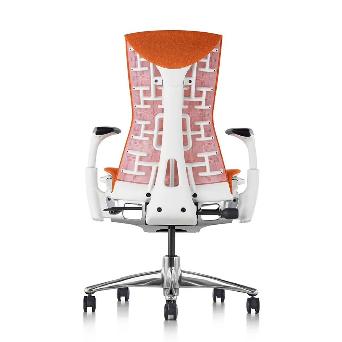 Le siège Embody est né de l’identification d’un problème non résolu : le manque d’harmonie physique entre l’homme et l’ordinateur. Passer trop de temps sur nos divers appareils et ne rien bouger d’autre que nos doigts peut provoquer un état de fatigue et de raideur car le corps est fait pour être en mouvement. Avec le siège Embody, les designers Bill Stumpf et Jeff Weber ont souhaité apporter une solution créative à ce problème. Embody adopte une taille unique pour s’adapter à la population active européenne. Il est complet avec son limiteur d’inclinaison, son siège réglable en profondeur et son appui arrière thoracique. Le limiteur d’inclinaison permet 3 étapes d’inclinaison pendant que le support thoracique Backfit fournit un appui total à l’arrière, aux lombaires au thorax et à toute la région de la colonne vertébrale. Une partie flexible au sommet du dossier appelé le Kicker permet une libre circulation en arrière, toute inclinaison en position vérouillée pour fournir encore plus de confort. Les accoudoirs bougent indépendamment de haut en bas, ainsi que vers l’intérieur et vers l’extérieur entre 165 et 292 mm pour la hauteur et 304 et 503 mm pour la largeur. Embody a été testé pour les utilisateurs jusqu’à 136 kg et est livré avec la garantie standard de 12 abs Herman Miller.