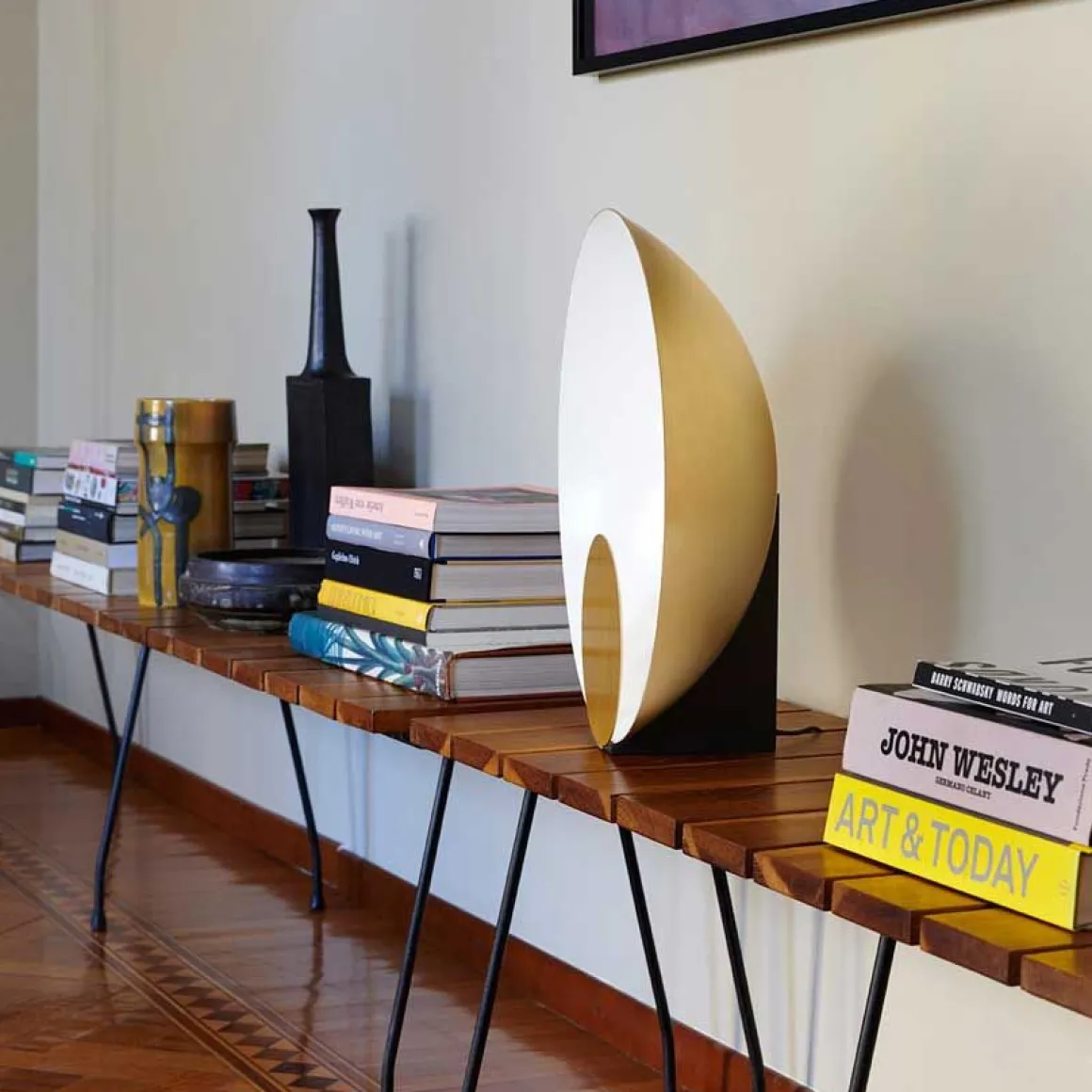 Siro est une lampe de table en métal avec éclairage LED indirect. Elle comprend une base noire opaque, un réflecteur en aluminium anodisé en forme de lentille blanche à l’intérieur et de finition or ou bronze à l’extérieur.