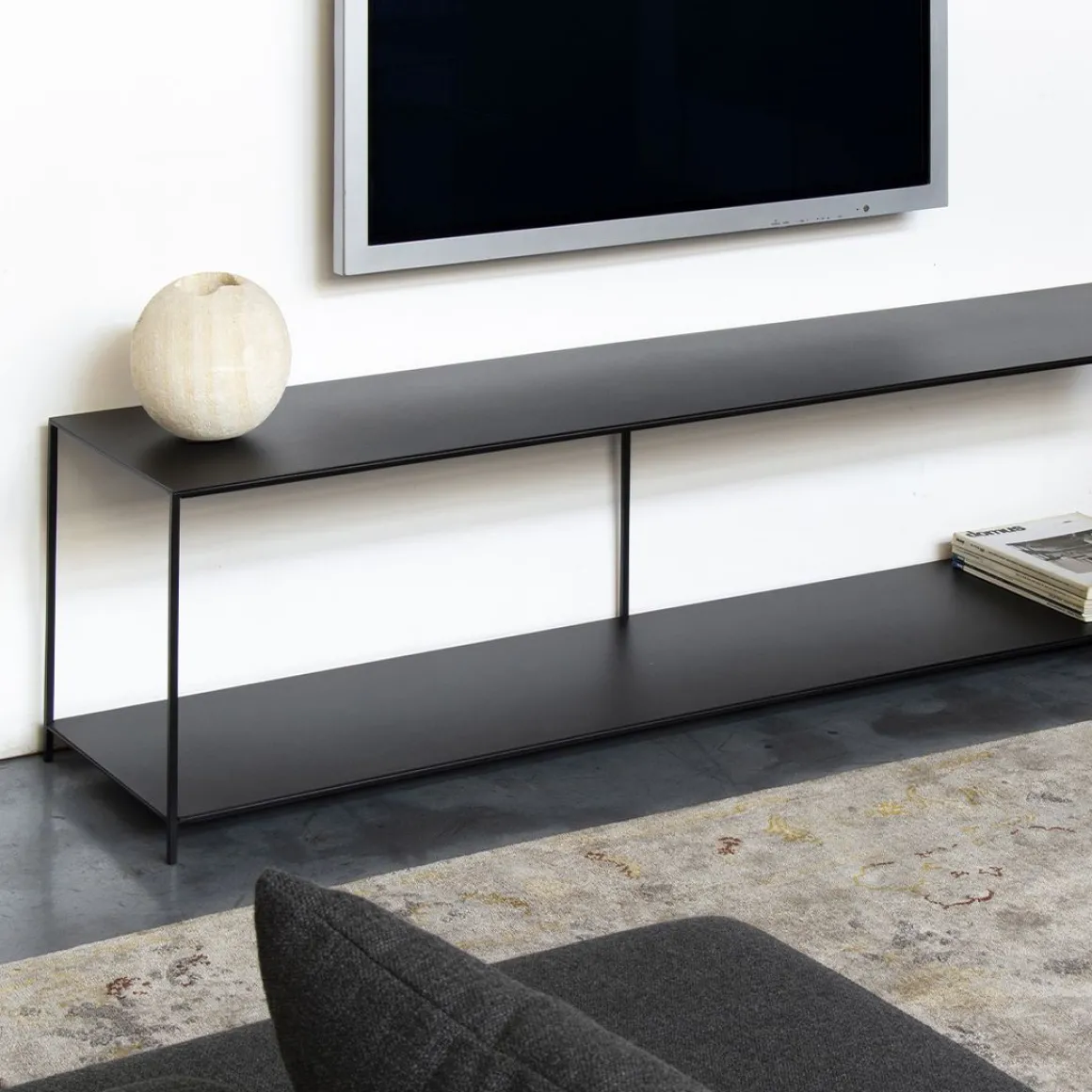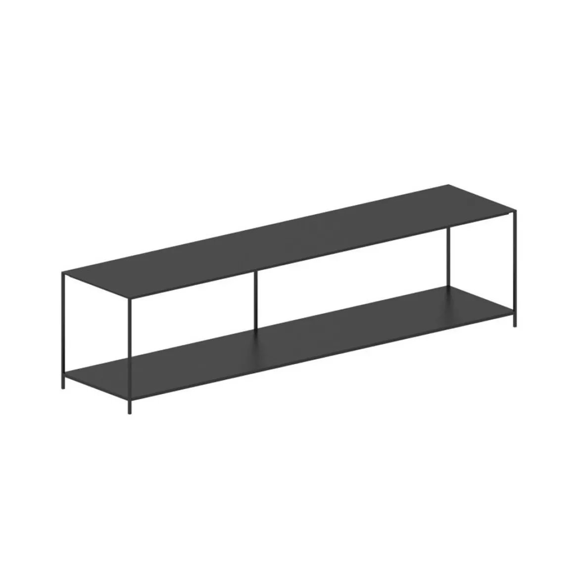 Console TV avec deux plateau. Profilés en acier carré plein 10 x 10 mm et plateaux en tôle d’acier épaisseur 2 mm, peinture époxy noir cuivré sablé.
