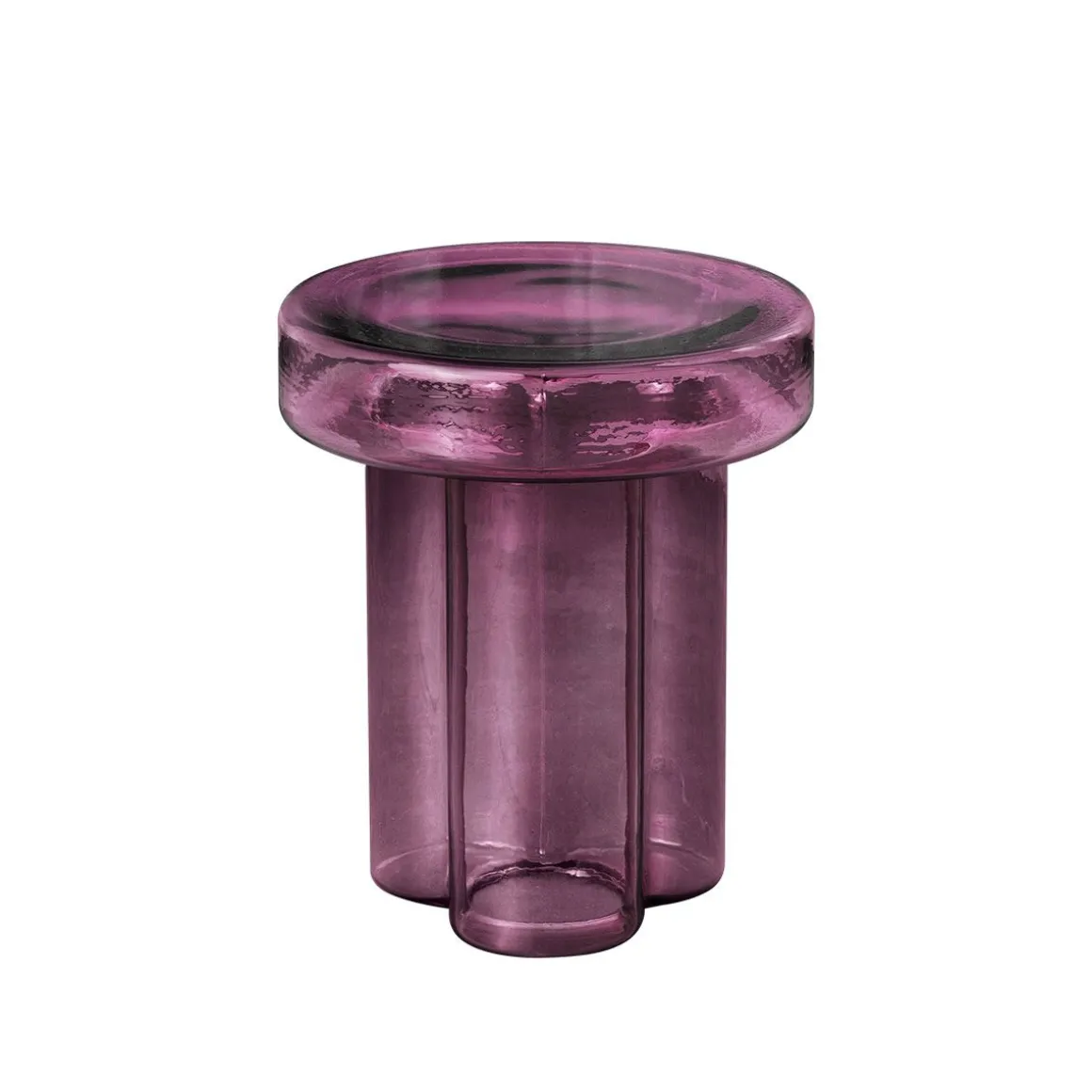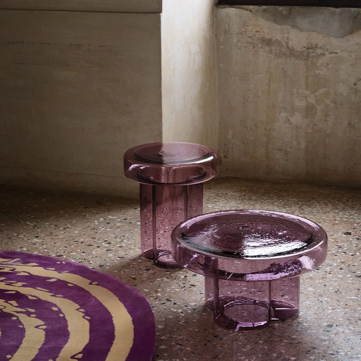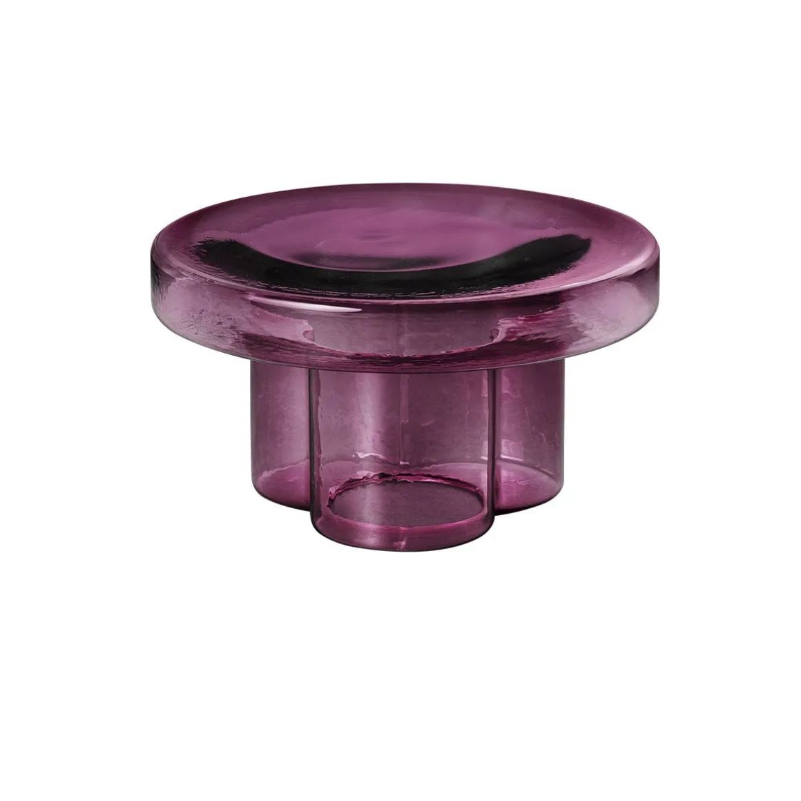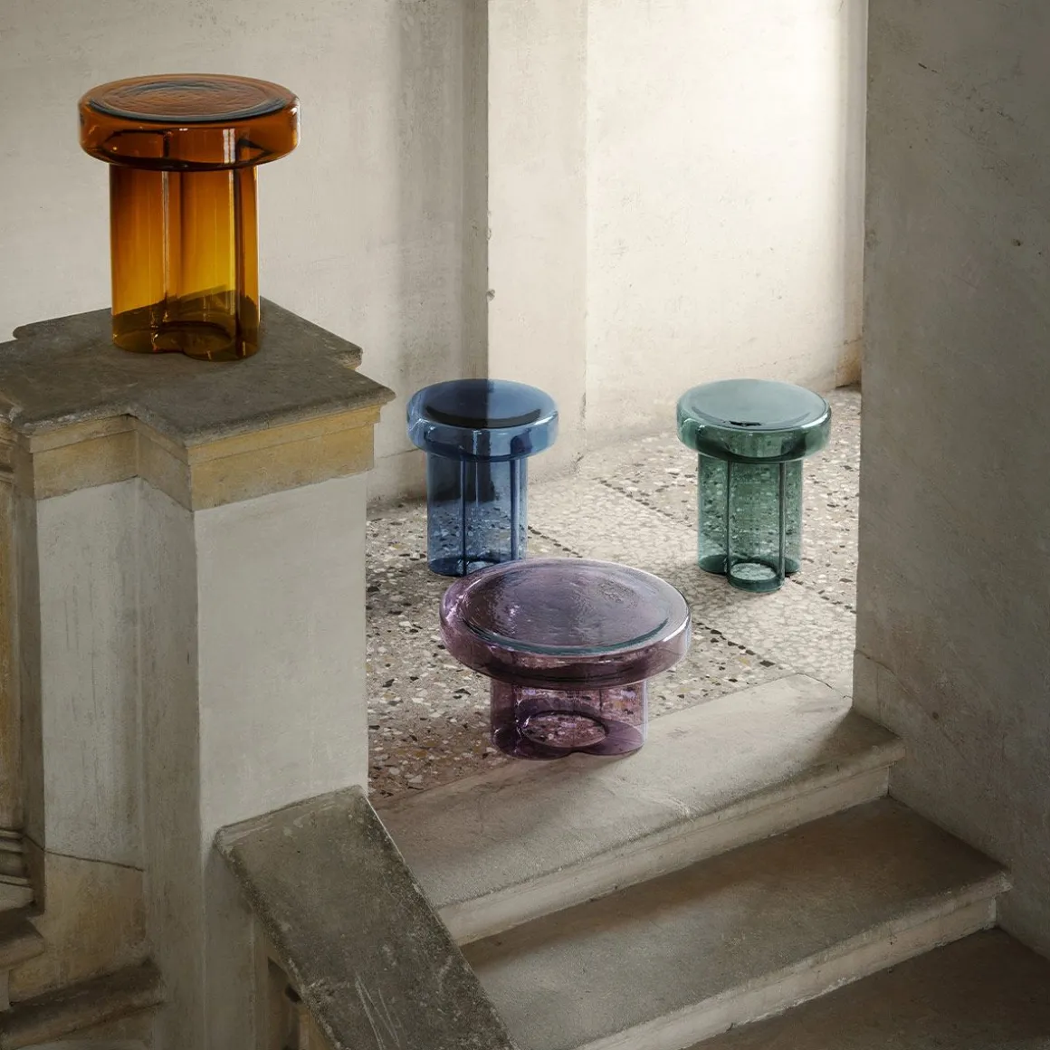 Soda de Miniforms par Yiannis Ghikas. Soda naît la tête en bas, d’un souffle. Elle pèse 20 kilos et est soufflée, démoulée et façonnée par trois maîtres-verriers. Le résultat est un volume unique de verre où trois grandes pétales dessinent le corps central. Dans Soda, la matière vibre : l’enveloppe dure et martelée du verre en fragmente la transparence en lui donnant une esthétique primitive. C’est la valeur artistique accordée au produit industriel. Soda est une table basse pas un tabouret. Ne vous asseyez pas dessus ! Soda s’intègre parfaitement à la maison comme à tout espace public.