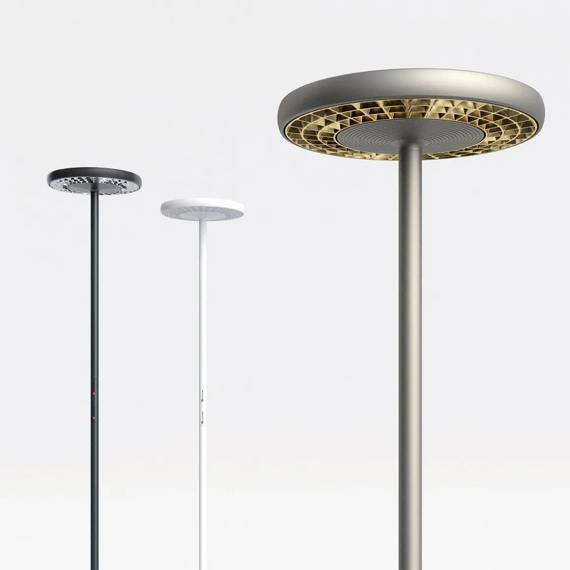 Un disque (de 28 cm de diamètre et 3/6 cm d’épaisseur) avec des surfaces et des bords arrondis abrite deux appareils lumineux conçus de façon à exploiter au maximum l’émission de 96 diodes dirigées vers le bas et de 128 diodes pointant vers le haut. L’intensité de la lumière peut être réglée de manière indépendante, aussi bien vers le plafond que vers le sol. Des balayeurs optiques spéciaux éliminent les effets d’éblouissement et décorent les surfaces horizontales du disque d’un motif à base de carrés concentriques, alors que des cercles concentriques gravés contribuent de façon discrète à l’élimination de la chaleur. La forme simple suggère toutes sortes de solutions et permet une gamme complète de toutes les typologies possibles (lampe de terre, de table, suspensions et appliques) pour en permettre l’adaptation dans tout contexte.