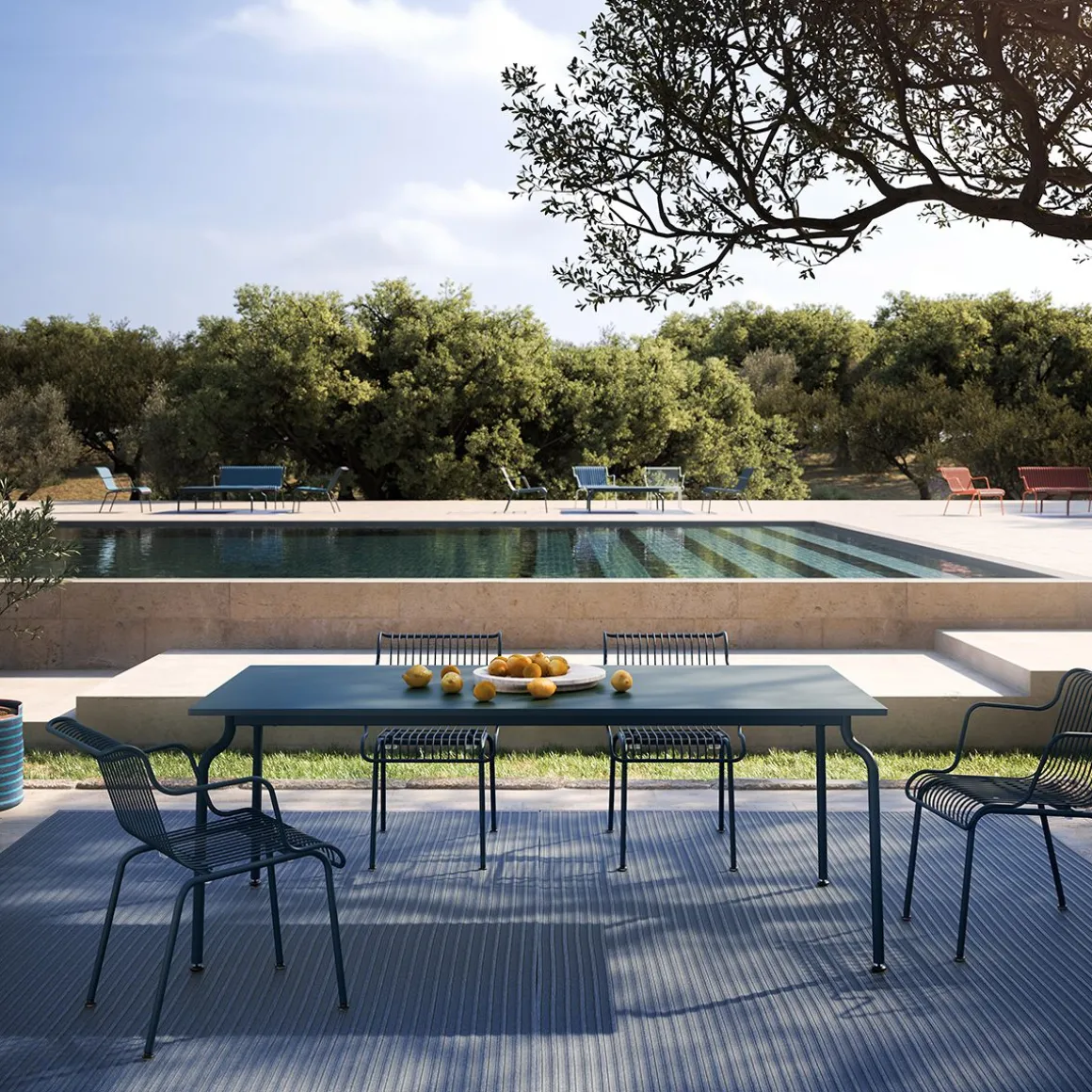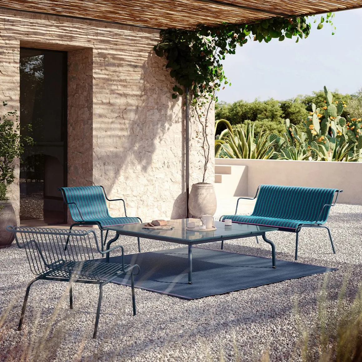Rigueur : c’est le mot d’ordre de Konstantin Grcic, et sa nouvelle collection South, conçue pour l’extérieur mais parfaite également pour l’intérieur, en est l’emblème. En tube et en fil d’acier traité en cataphorèse et verni en polyester, elle est disponible en plusieurs couleurs : orange, bordeaux, bleu clair et bleu nuit. À la fois sinueuse et essentielle, la collection est composée d’un petit fauteuil, d’un fauteuil bas, d’un banc et d’un banc bas, tous avec accoudoirs. Elle inclut aussi quatre tables (200x120cm avec plateau de lattes de teck, 200×90, 160×90 et 90x90cm avec pleateau en tôle d’acier) et deux tables basses (120×120 cm avec plateau de lattes de teck ou pierre de lave émaillée en verre recyclé coloré et 90x90cm avec plateau en tôle d’acier). La collection est complétée par des nattes tressées pour les sieges, des tapis, des corbeilles et un plaid, tous dans le même tissu adapté à une utilisation pour l’extérieur.