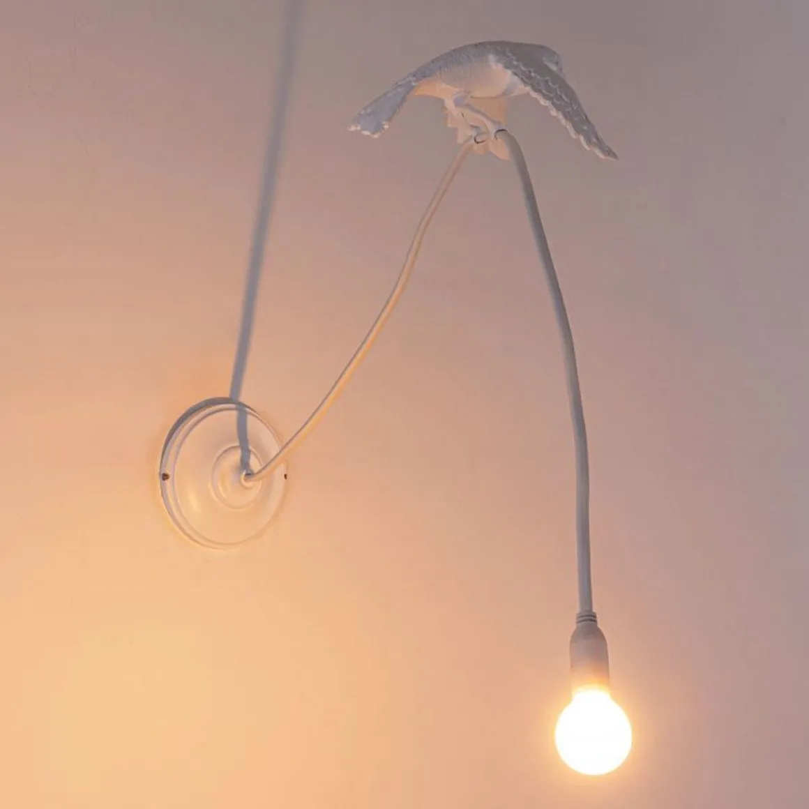 On voir la vitalité de ces oiseaux qui apportent avec animation la lumière. Le designer a voulu recréer ce moment où l’on observe un petit oiseau secrètement occupé et le cordon spécial de ses lampes recrée la magie typique de ces petits oiseaux.
