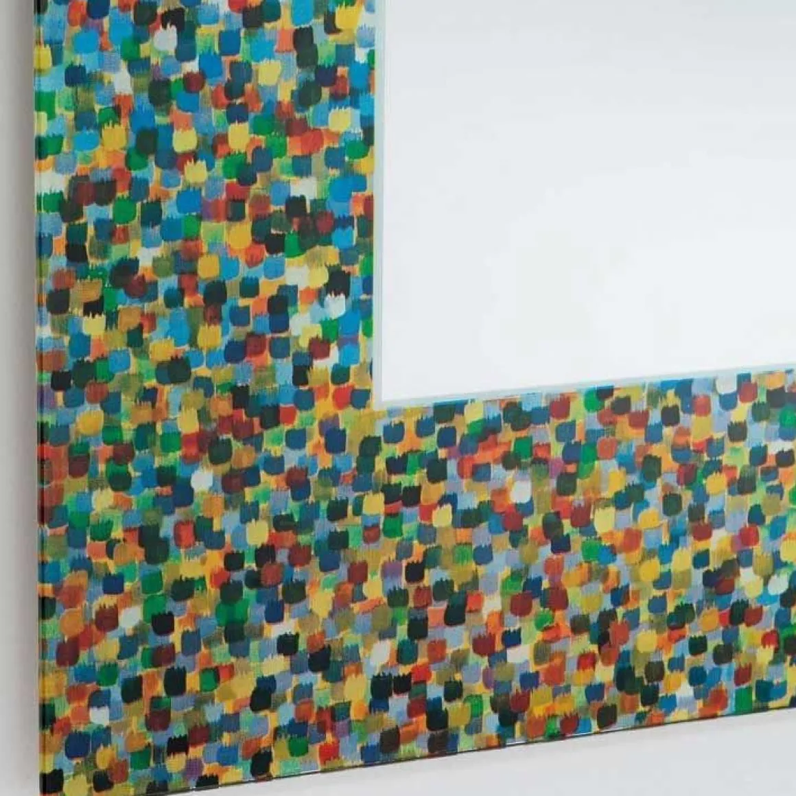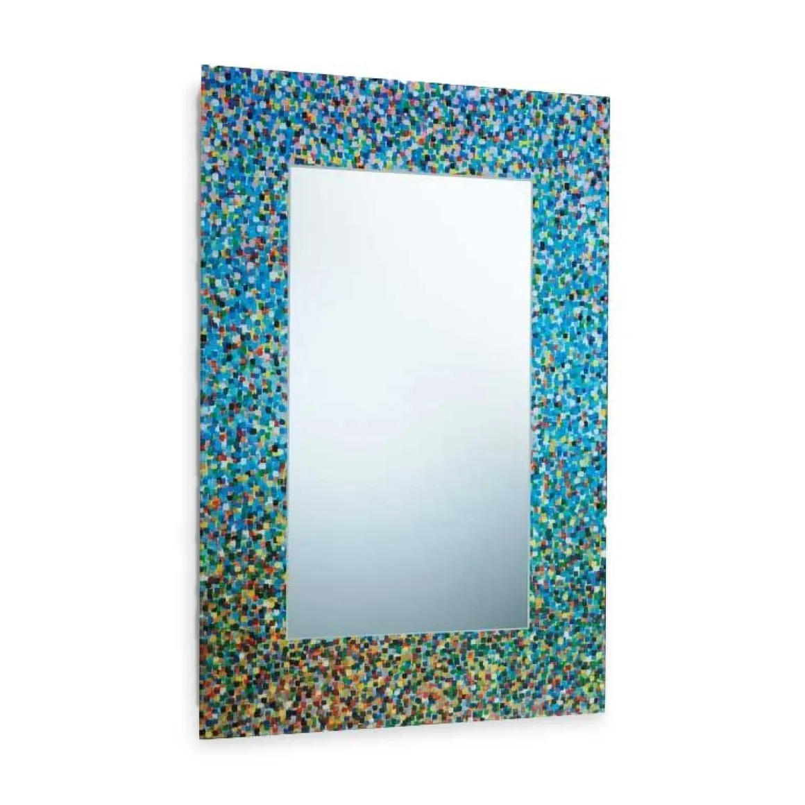 Miroir créé par Alessandro Mendini, de forme simple, rectangulaire avec un cadre qui est caracterisé par une systéme polycrome uniforme fait de signes réalisés avec la pointe du pinceau. Disponible avec des attaches doubles horizontales et verticales.