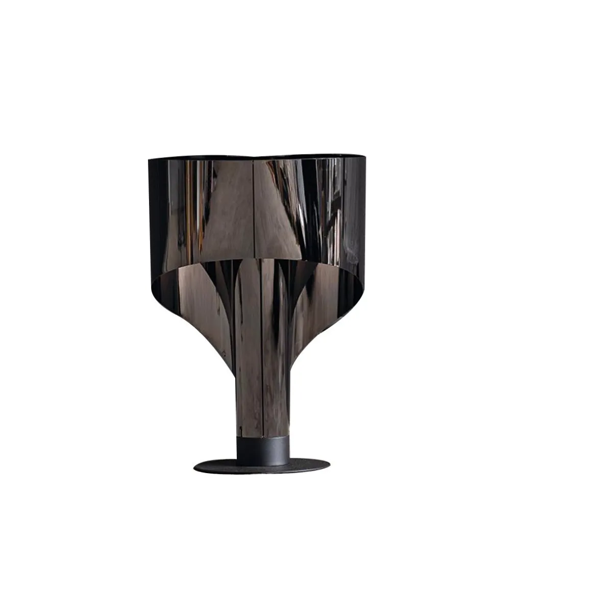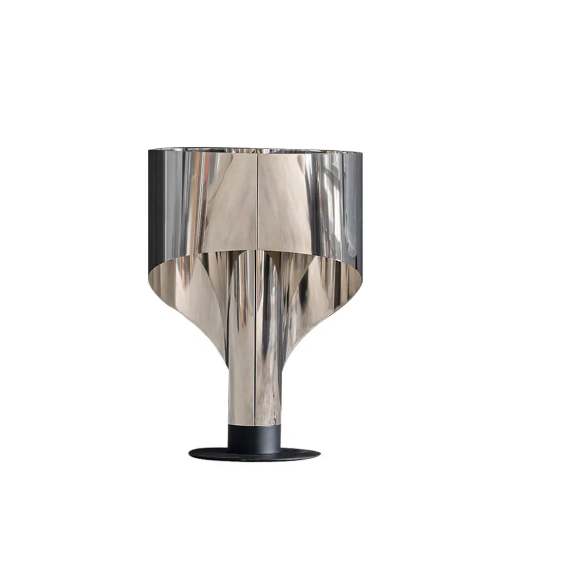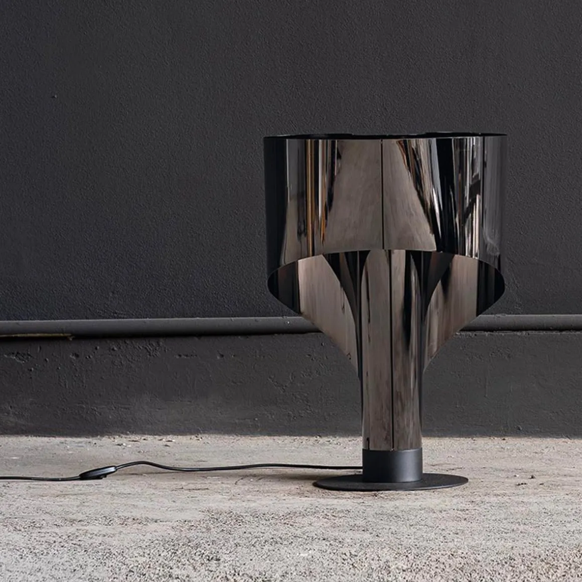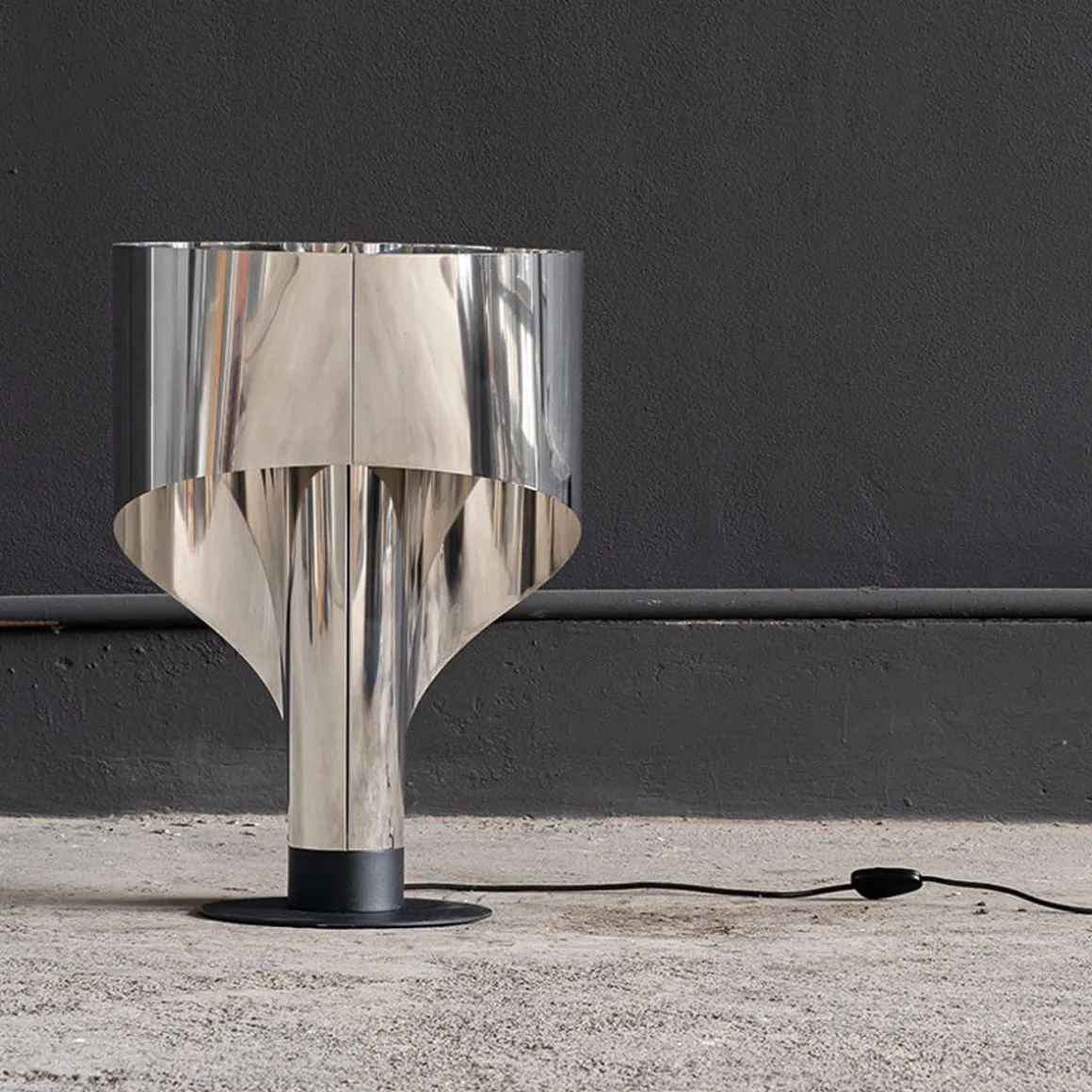 SPINNAKER 1969 de Codiceicona. Le développement configuratif vertical crée la forme esthétique, la courbure de la tôle doucement caressée et gonflée évoque celle de la large surface incurvée de la voile avant : Spinnaker est le nom de la lampe, emprunté peut-être par hasard à la terminologie nautique. Lorsque le luminaire, avant même d’être utilisé comme source de lumière, est placé dans un environnement domestique en tant que sculpture, il constitue une présence certainement unique et importante.