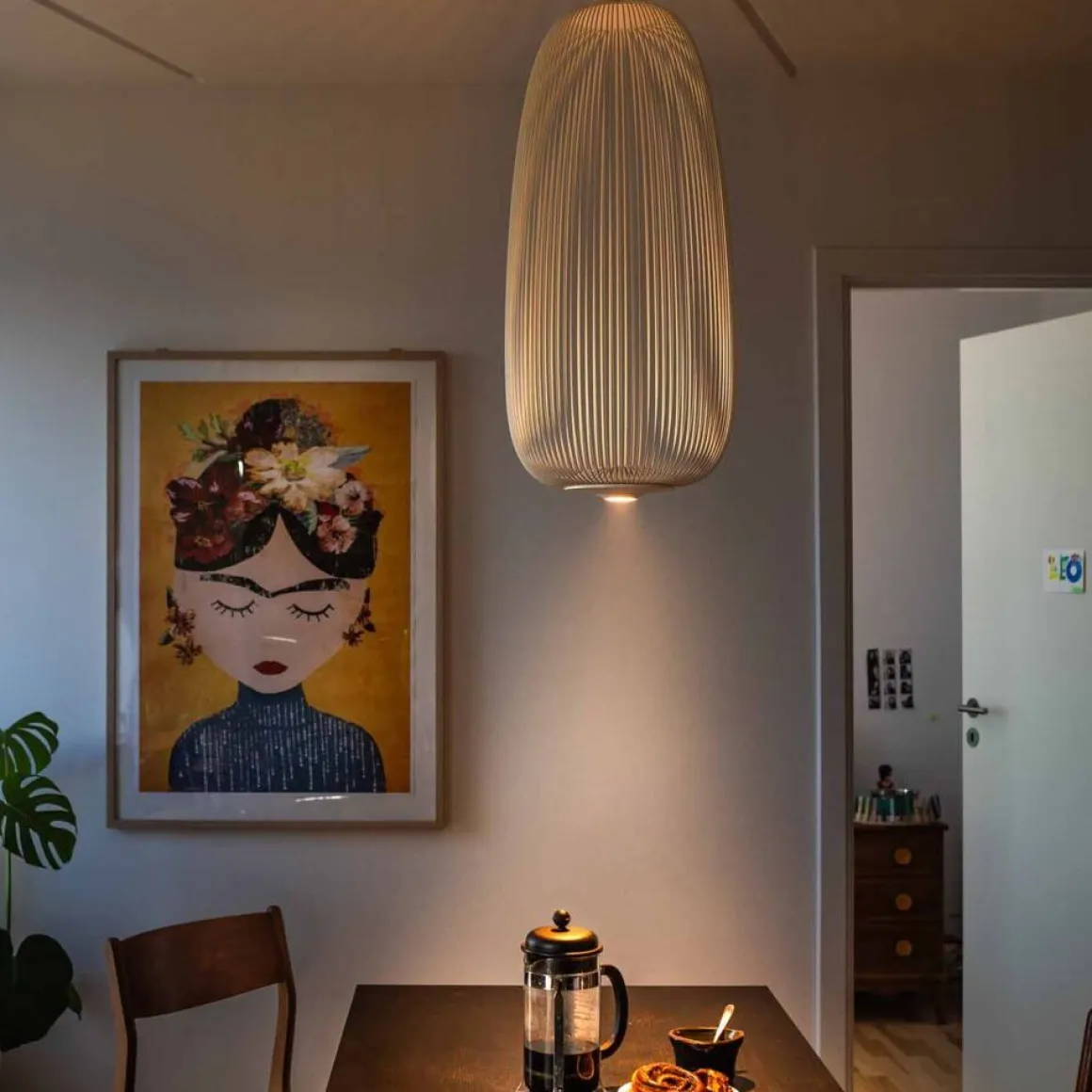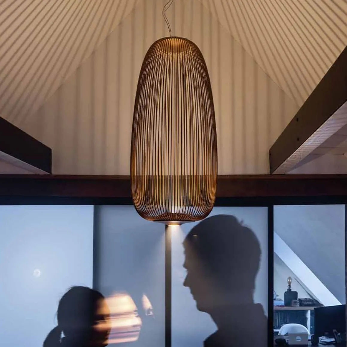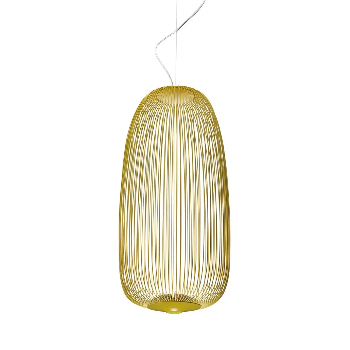 La lampe a suspension Spokes puise son inspiration des anciennes lampes orientales à volières domestiques. La réalisation naît de l’observation des rayons d’une roue de vélo, d’où le nom du projet, Spokes, qui signifie « rayons » en anglais. Résultat : une lampe aux formes rondes et au volume léger qui contient la lumière, tout en la laissant filtrer dans l’espace. La légèreté qui caractérise le projet s’associe à la solidité de la forme, réalisée en fil de métal, et à la fonctionnalité de la source lumineuse à LED, qui permet à la fois d’éclairer par le dessous à la perfection, et d’obtenir des jeux d’ombres et lumières qui se projettent sur les parois avec un effet magique de démultiplication. La suspension Spokes est adaptée aussi bien aux espaces domestiques que publics, et notamment pour personnaliser les grands volumes, grâce à la possibilité de réaliser des compositions multiples.