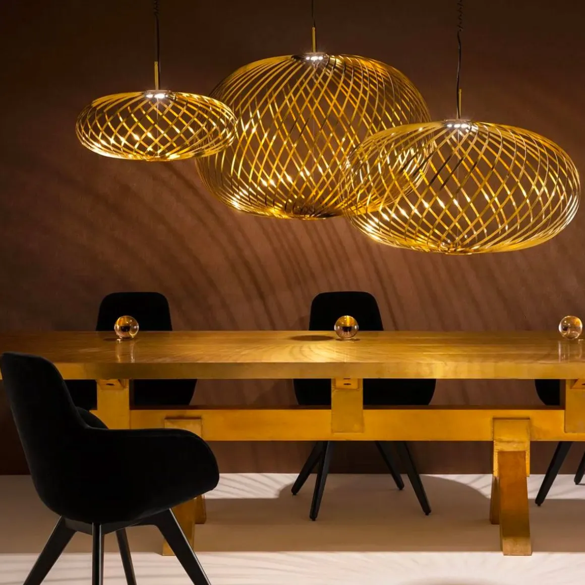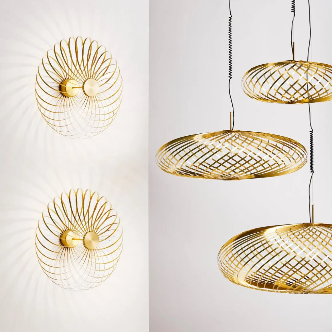Spring est une série de trois lampes à suspension faites à partir de lames en acier inoxydable. Des rubans d’acier inoxydable souples ont été arrangés comme un fouet de cuisine autour du disque LED Tom Dixon sur mesure à variateur d’intensité. La forme semi-transparente ainsi créée peut être ajustée pour créer diverses silhouettes – d’un arrangement plat rappelant le dessin d’un spirographe à une configuration en soucoupe volante, en passant par une forme plus pleine ressemblant à une citrouille.