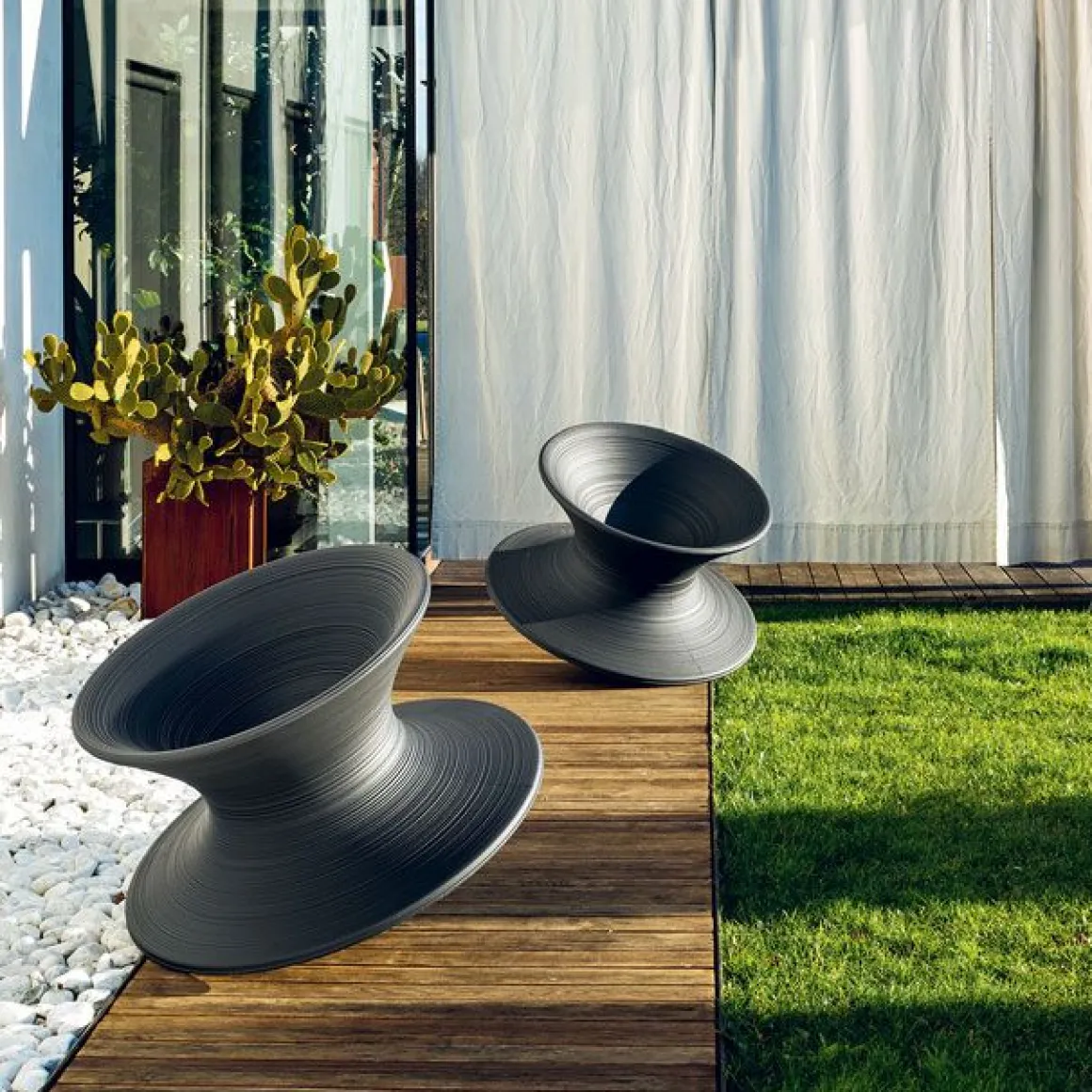 Cette toupie géante offre une assise confortable et amusante. Dynamique, on le croirait sortie tout droit du potier mais le process de fabrication de la symétrie rotatoire lui donne un effet contemporain design.
