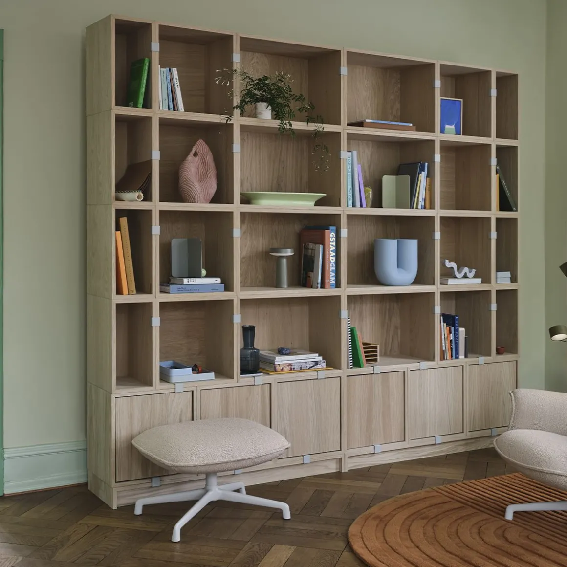 À la fois polyvalent et fonctionnel, le système de rangement empilé peut être agencé et réorganisé pour répondre aux besoins esthétiques et fonctionnels exacts de n’importe quel espace. Vous trouverez ici une sélection de configurations de bibliothèques prédéfinies qui apportent un rangement moderne à n’importe quelle maison, lieu de travail ou établissement d’accueil. Tous les modules avec panneau arrière peuvent être montés directement sur le mur.