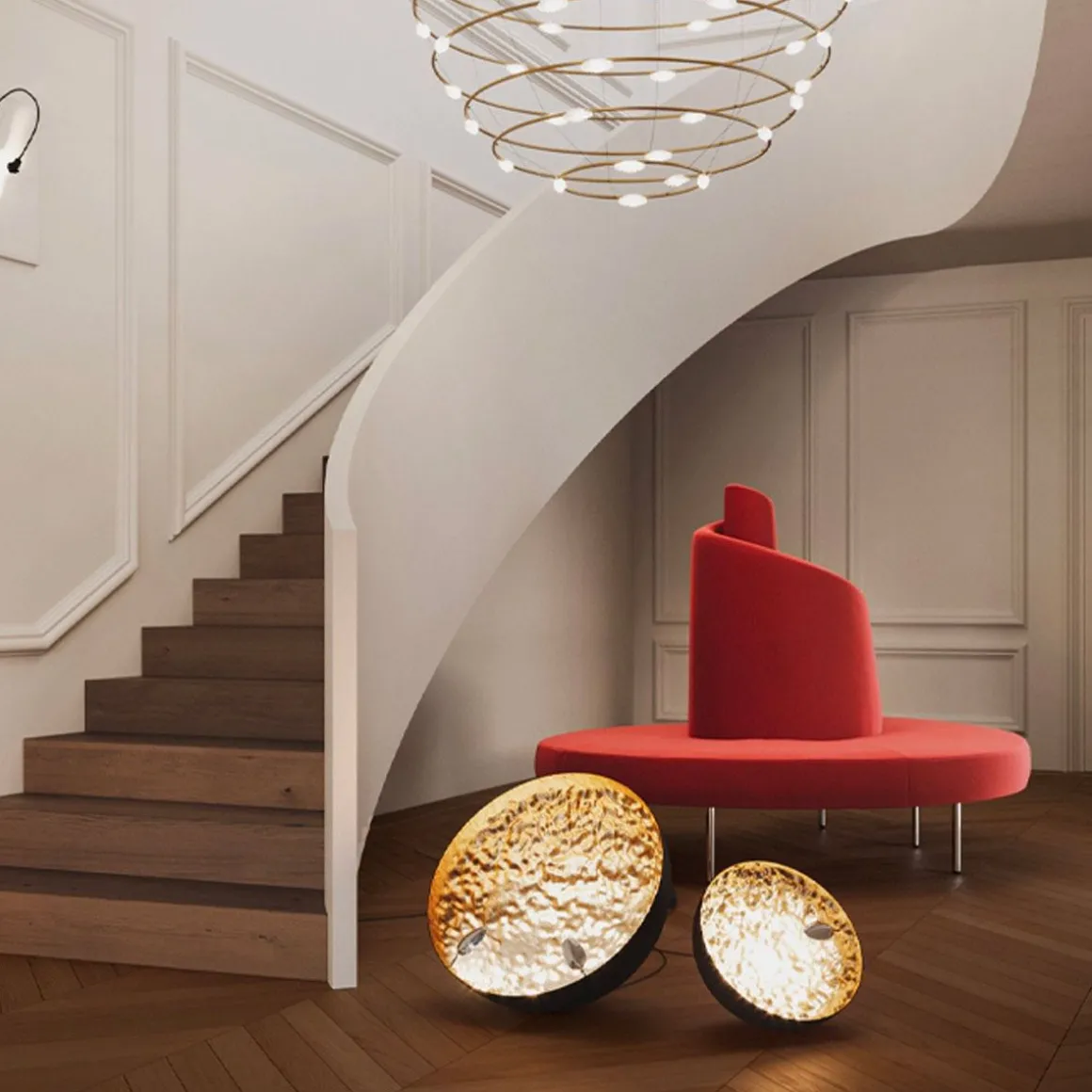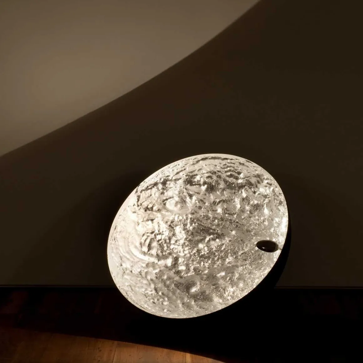 Stchu-Moon sépare la source de lumière de la lampe, ce qui prend sa propre valeur esthétique en conséquence. Ces objets sont tous fabriqués par des artisans spécialisés et sont donc des pièces totalement uniques. La réfraction de la lumière joint des forces avec des surfaces intentionnellement irrégulières qui multiplient la qualité de la lumière et rendent l’objet lui-même tout léger. Les surfaces irrégulières sont bordées de feuilles dorées, argentées et cuivrées.
