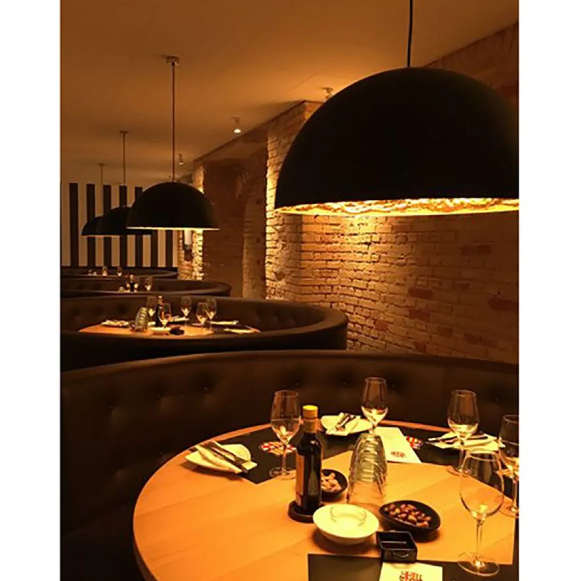 Matériaux : Sphère en aluminum ou en fibre de verre en différents diamètres / Surface interne irrégulière doublée de feuilles en argent, or ou cuivre / Extérieur noir mat, porte lampe en acier.