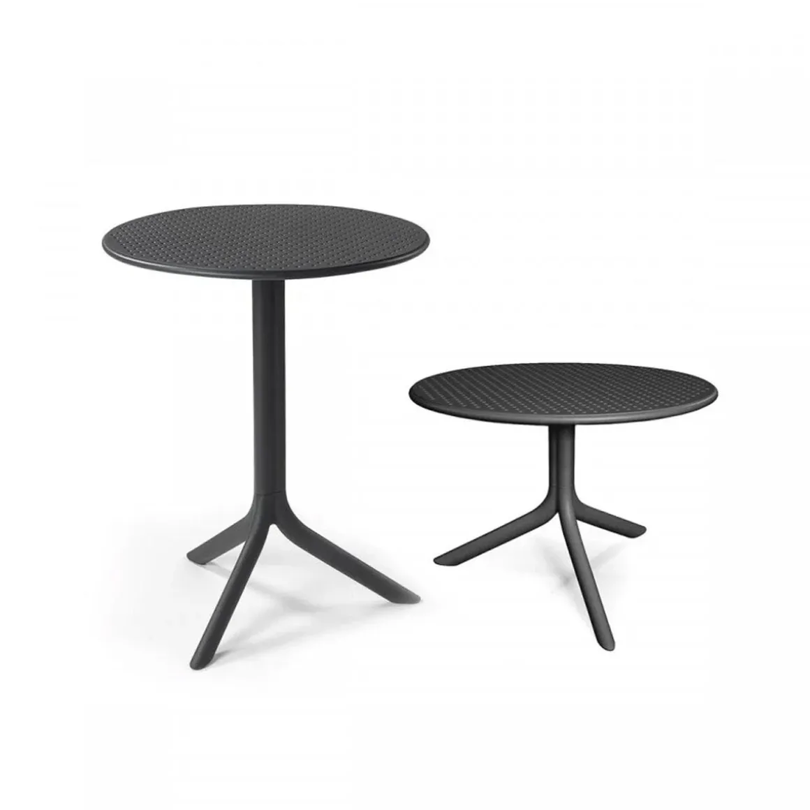 Step de Nardi par Raffaello Galiotto. Petite table mange-debout en résine fibre de verre dotée d’un plan plié à section creuse rond se distinguant par de petits orifices décoratifs et fonctionnels et donc dotée d’un très bon pouvoir drainant. La base à trois pieds, facile à monter et à démonter, est proposée avec un kit permettant d’obtenir deux hauteurs.