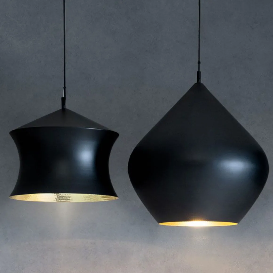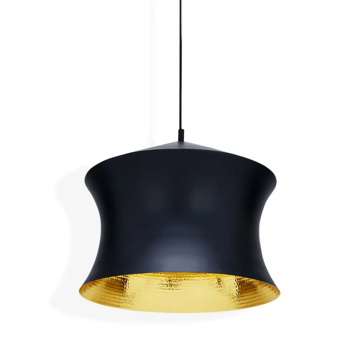 La collection « Beat » se compose de quatre suspensions design en laiton aux formes diverses. Leur fabrication nécessite un savoir-faire d’excellence : le laiton est martelé à la main selon une technique traditionnelle utilisée par les maîtres-artisans indiens ! Derrière chaque suspension, on ressent la main de l’artisan, le geste de celui qui l’a fabriquée. L’extérieur de l’abat-jour est peint en noir mat ce qui lui donne un aspect industriel. Le noir profond contraste superbement avec l’intérieur de l’abat-jour en laiton doré. Ce contraste est superbement mis en scène par la diffusion directe et en flux concentré de la lumière. La forme de l’abat-jour nous interpelle par sa silhouette géométrique, nette et extrêmement graphique. Cette forme s’inspire des vases que les Indiens portent sur leur tête pour aller chercher de l’eau… Le câble d’alimentation ainsi que la rosace en métal sont de couleur noire.
