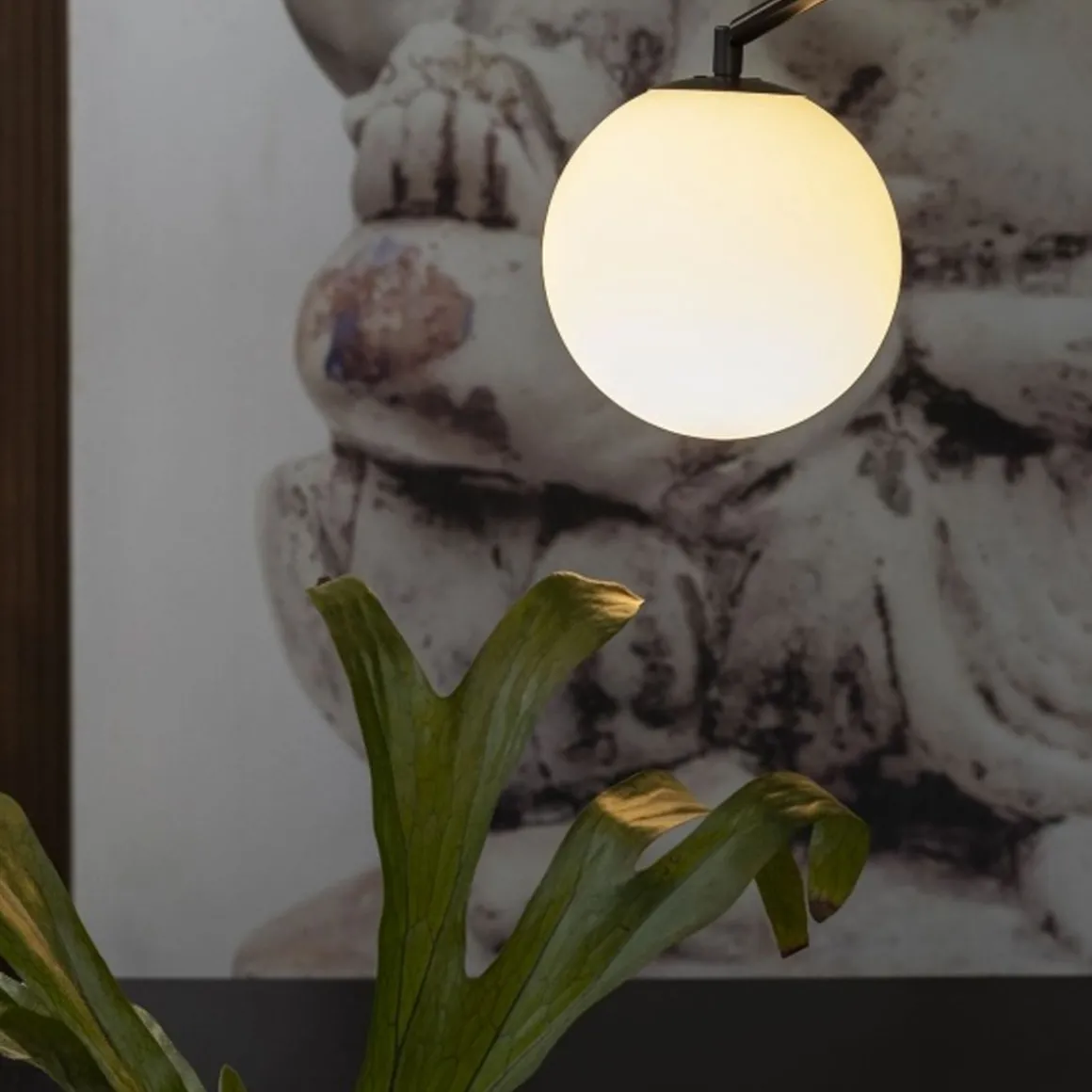 Matériaux : structure en métal peint, sphère de verre opale