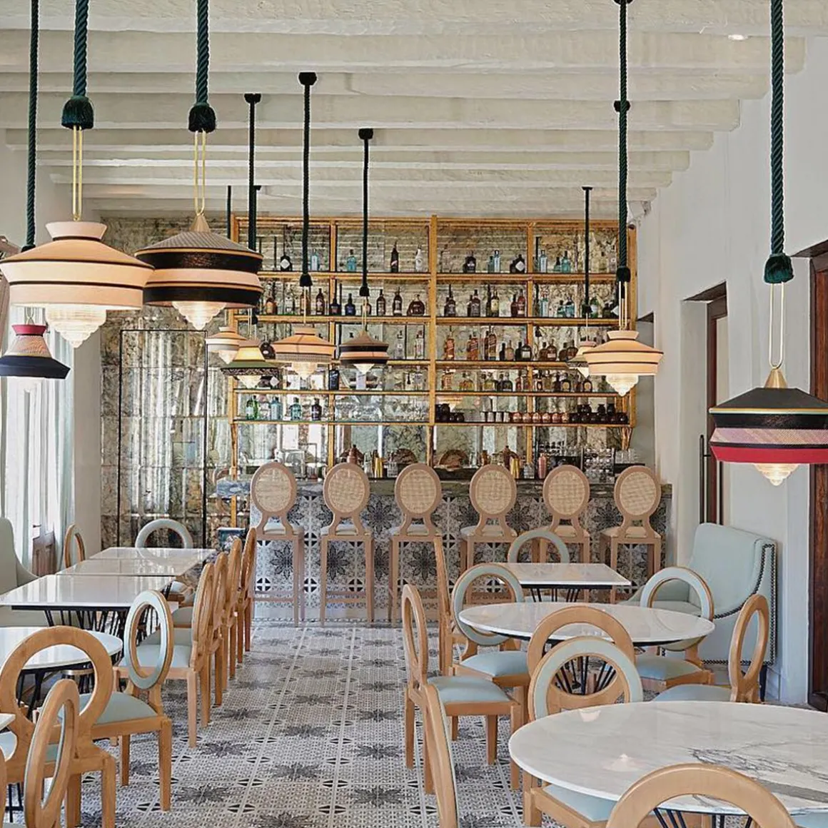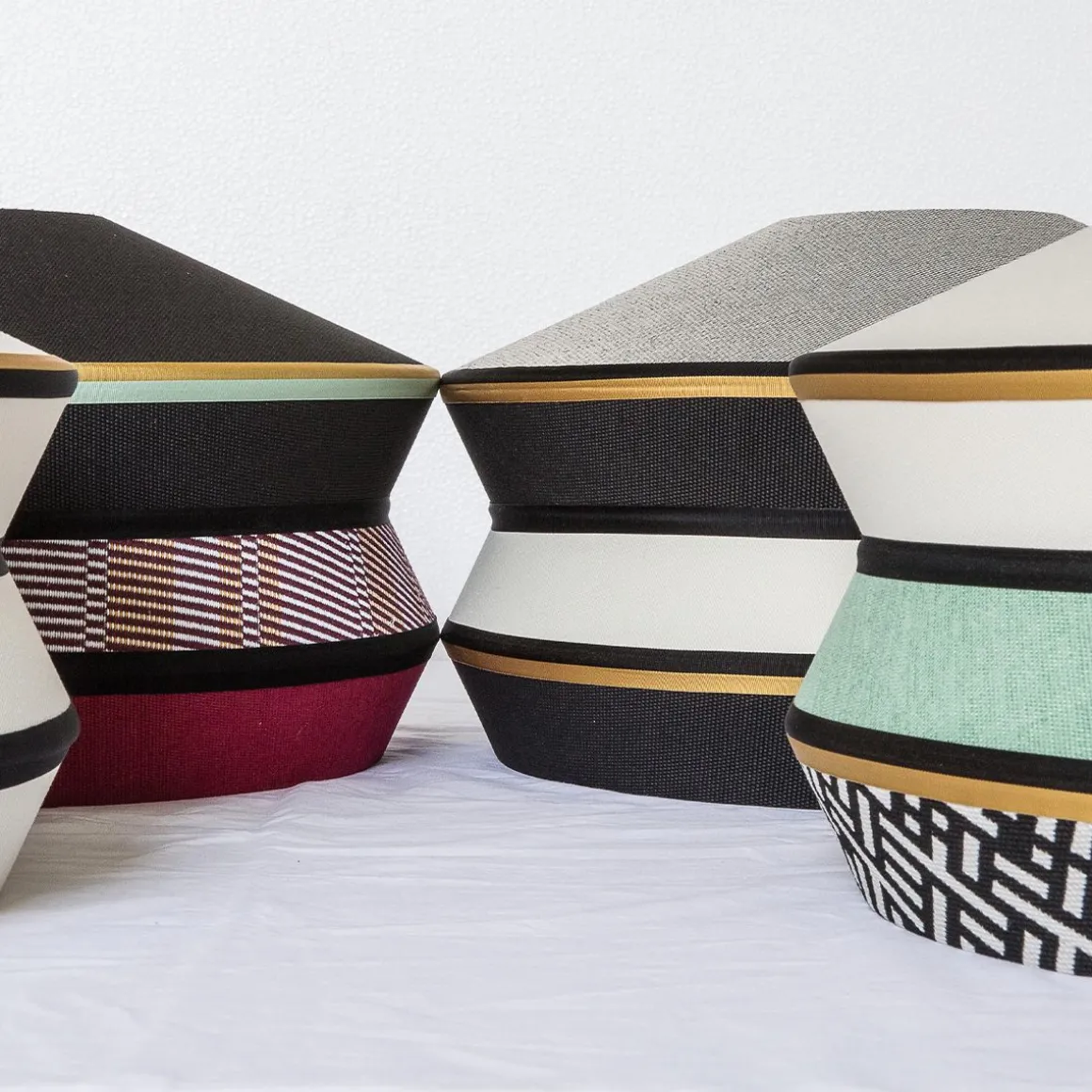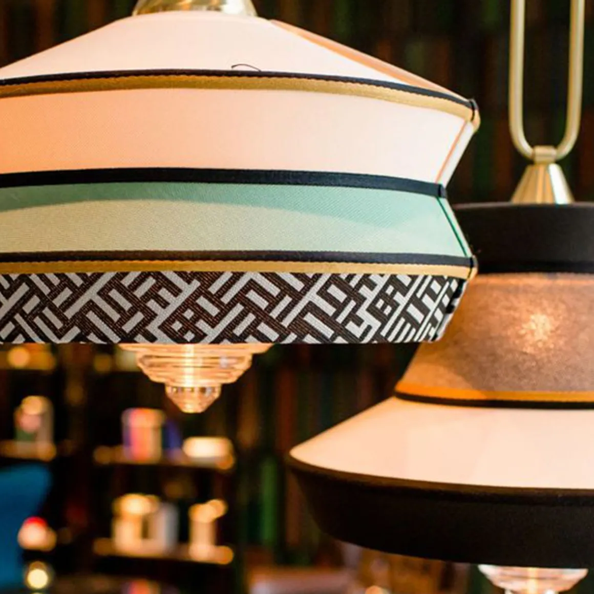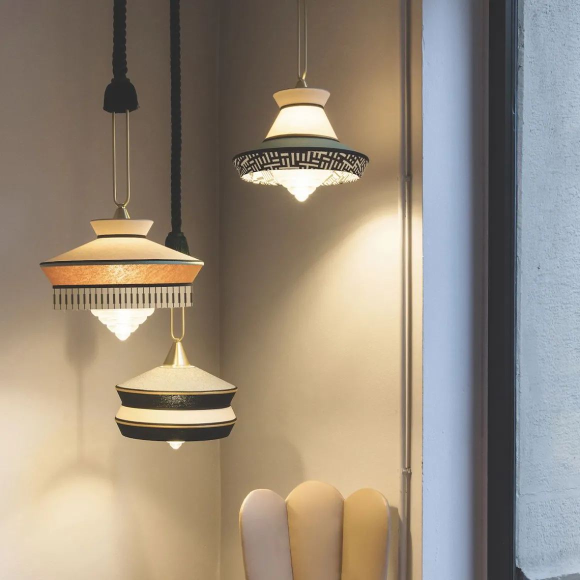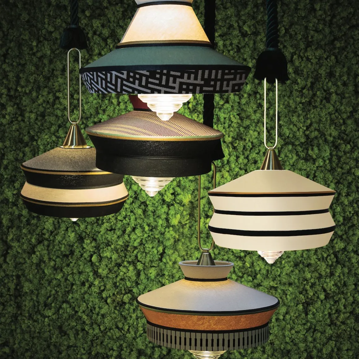 Calypso est une collection de suspensions inspirée á la période art déco, avec des tissus dont les textures et les motifs géométriques blancs et noirs se mêlent aux couleurs vives de la culture sud-américaine et tropicale, offrant un résultat très original. La version indoor se caractérise par un cordon de soie tressé vert foncé, et pour la version outdoor elle est équipée de corde marine et de tissus imperméables. Le support est un anneau en laiton satin. Le diffuseur est en verre transparent.