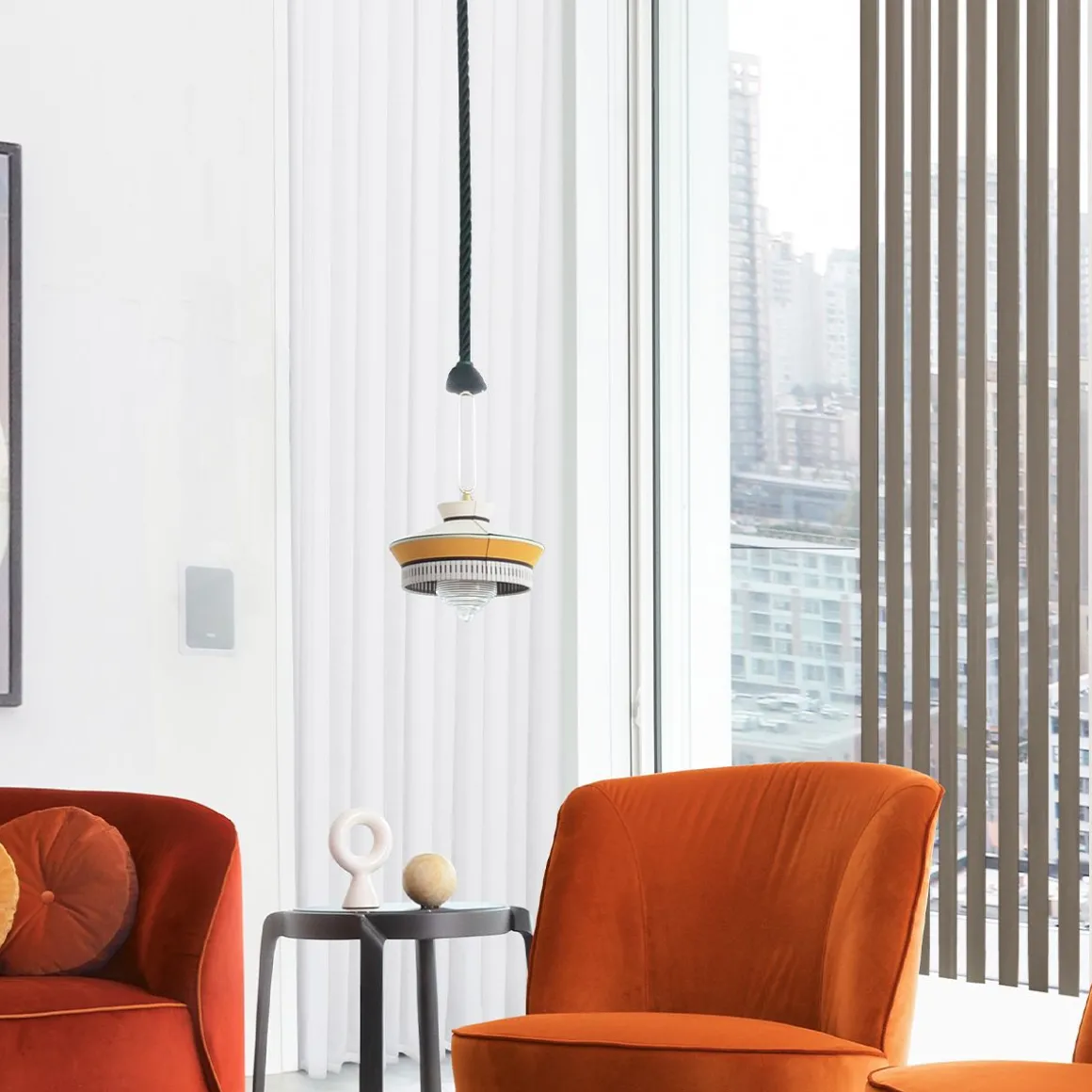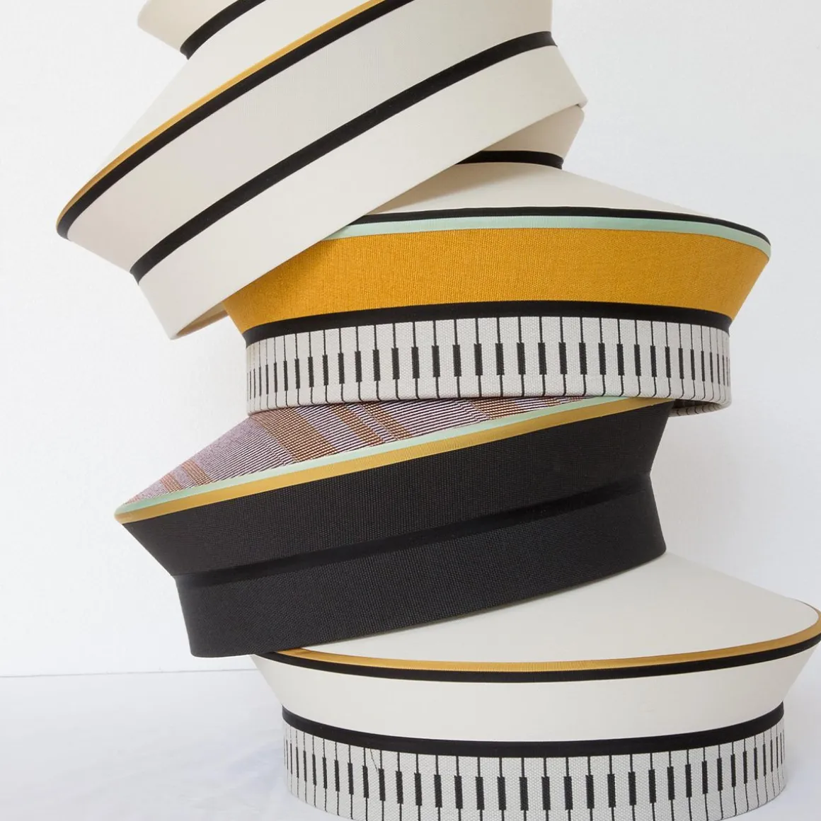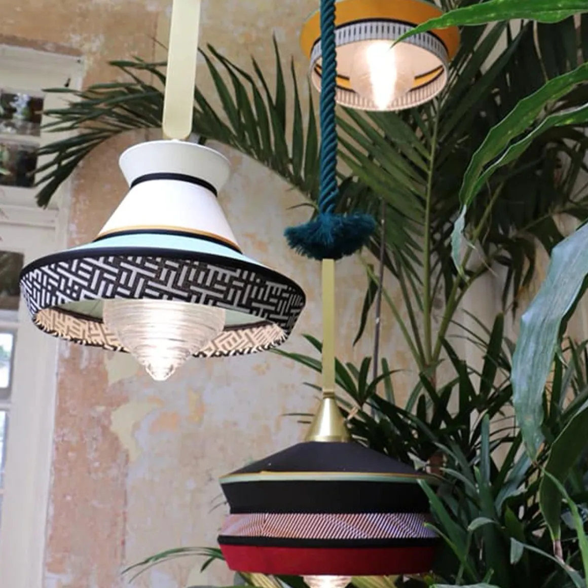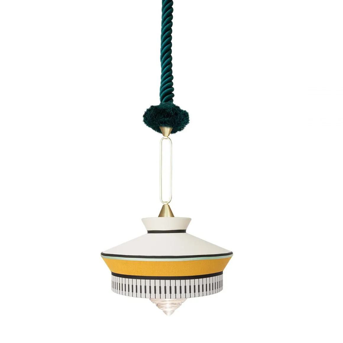 Calypso est une collection de suspensions inspirée á la période art déco, avec des tissus dont les textures et les motifs géométriques blancs et noirs se mêlent aux couleurs vives de la culture sud-américaine et tropicale, offrant un résultat très original. La version indoor se caractérise par un cordon de soie tressé vert foncé, et la version outdoor est équipée d’une corde marine et de tissus imperméables. Le support est un anneau en laiton satin. Le diffuseur est en verre transparent.