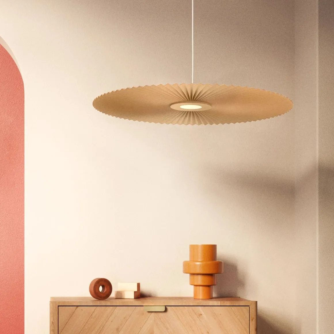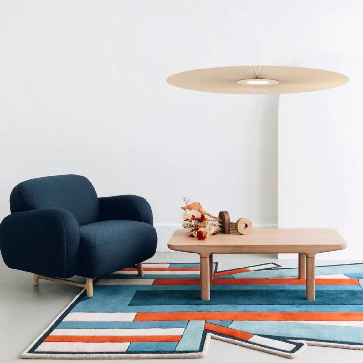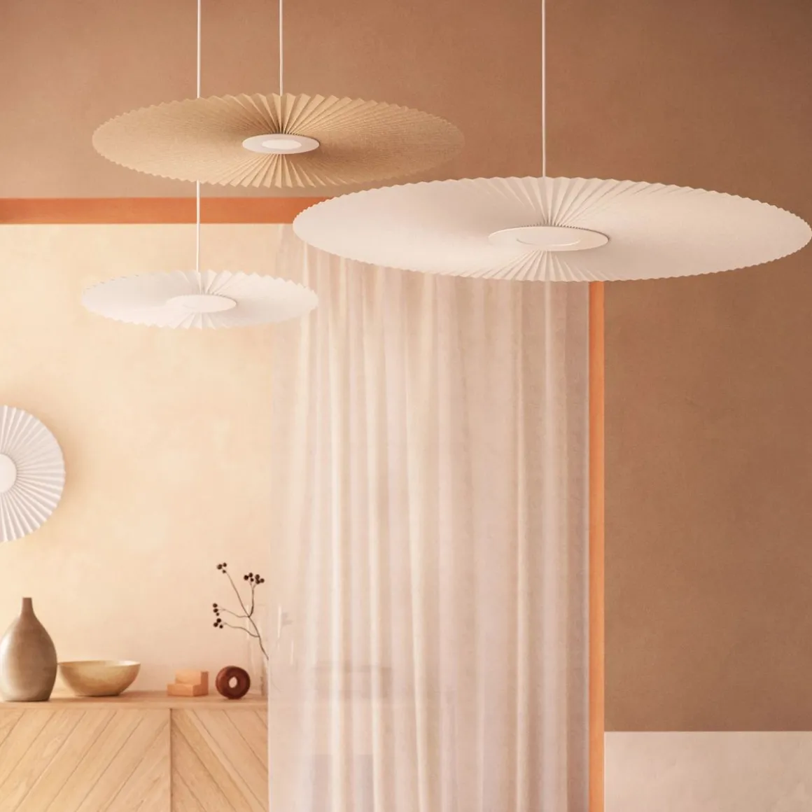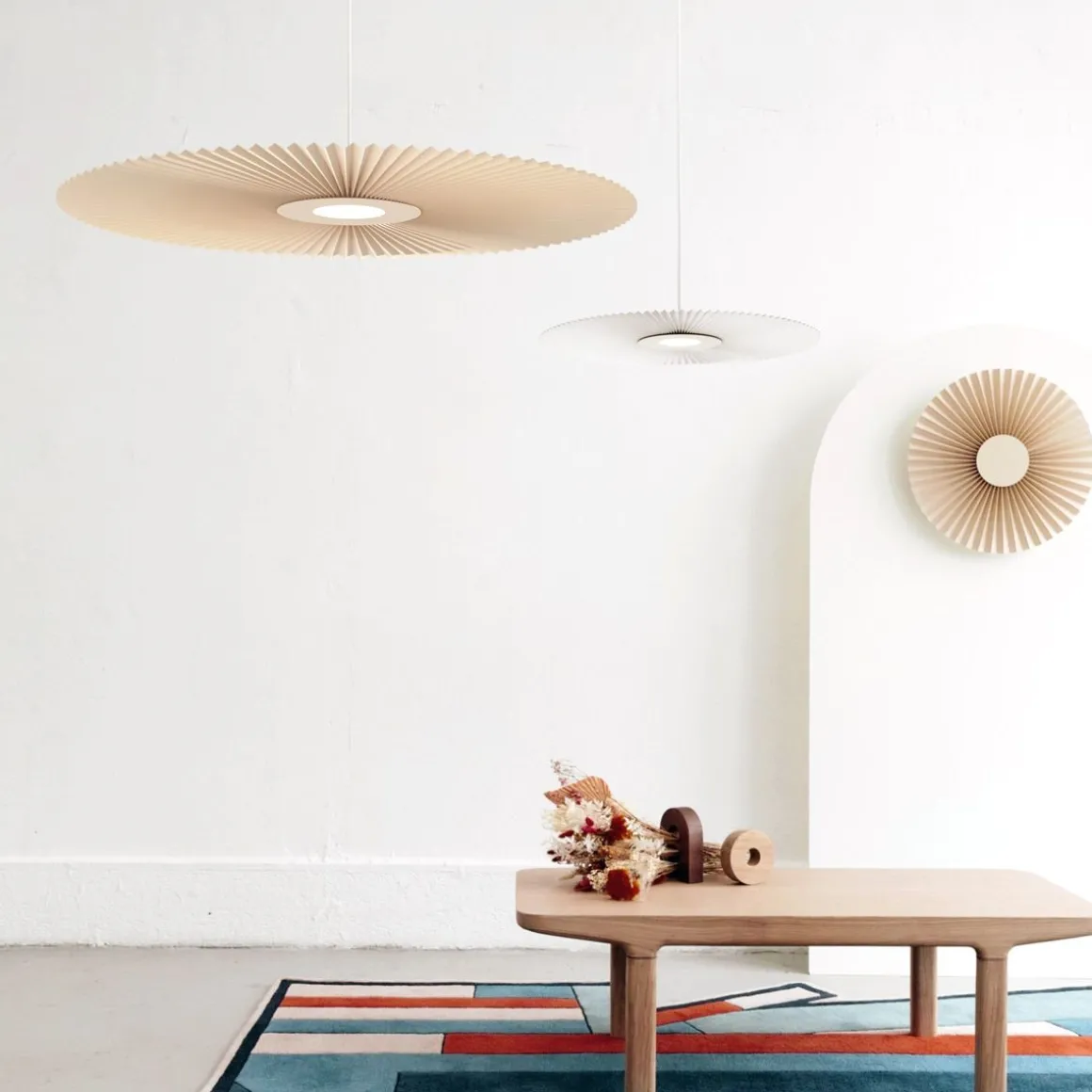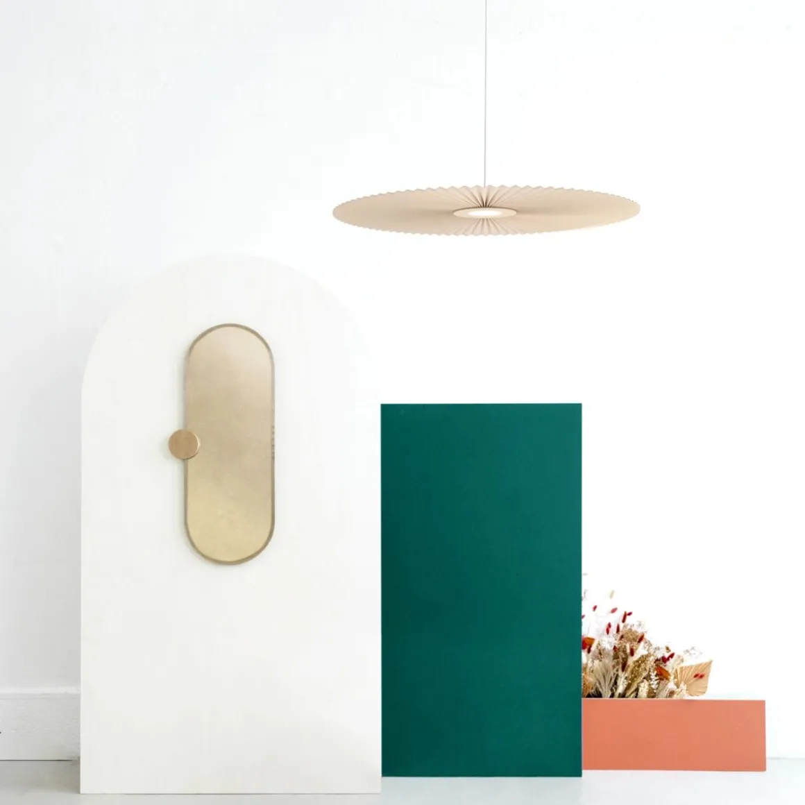 Le plissage et l’envergure de Carmen rendent son graphisme captivant. Le studio PaulinePlusLuis, a pensé pour HARTÔ cette suspension comme une danseuse. Les lignes de sa jupe se répètent et viennent rythmer l’espace dans laquelle elle se trouve. Quand Carmen entre en scène, elle ne passe pas inaperçue. Sublimée par son disque lumineux, elle a été conçue en partant d’expérimentations sur le textile. L’approche créative de ce jeune duo à l’origine de la suspension est intuitive. Elle se nourrit du quotidien. La polyvalence du traitement qu’ils accordent à la lumière rend leurs créations uniques. Le studio retrouve HARTÔ sur l’importance accordée aux motifs et lignes répétitives.