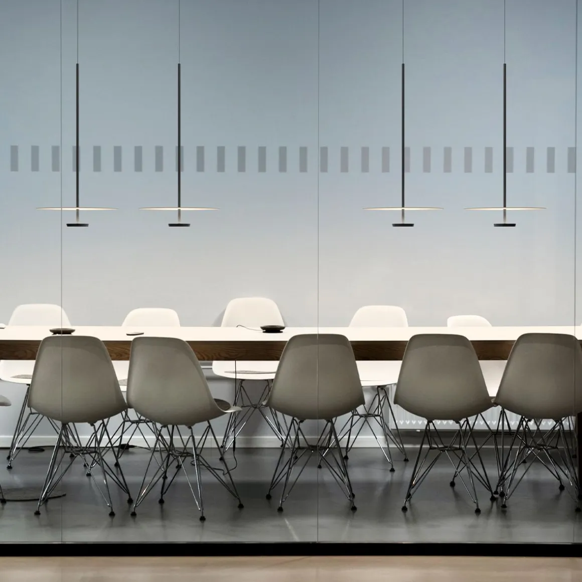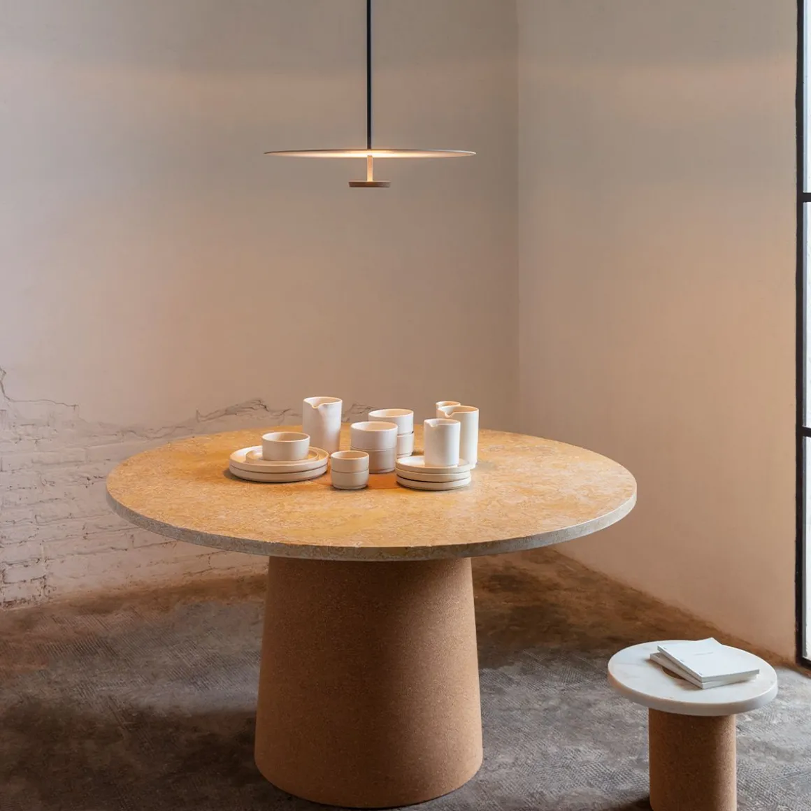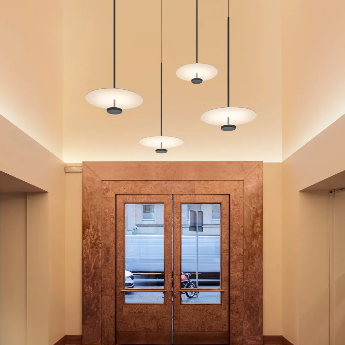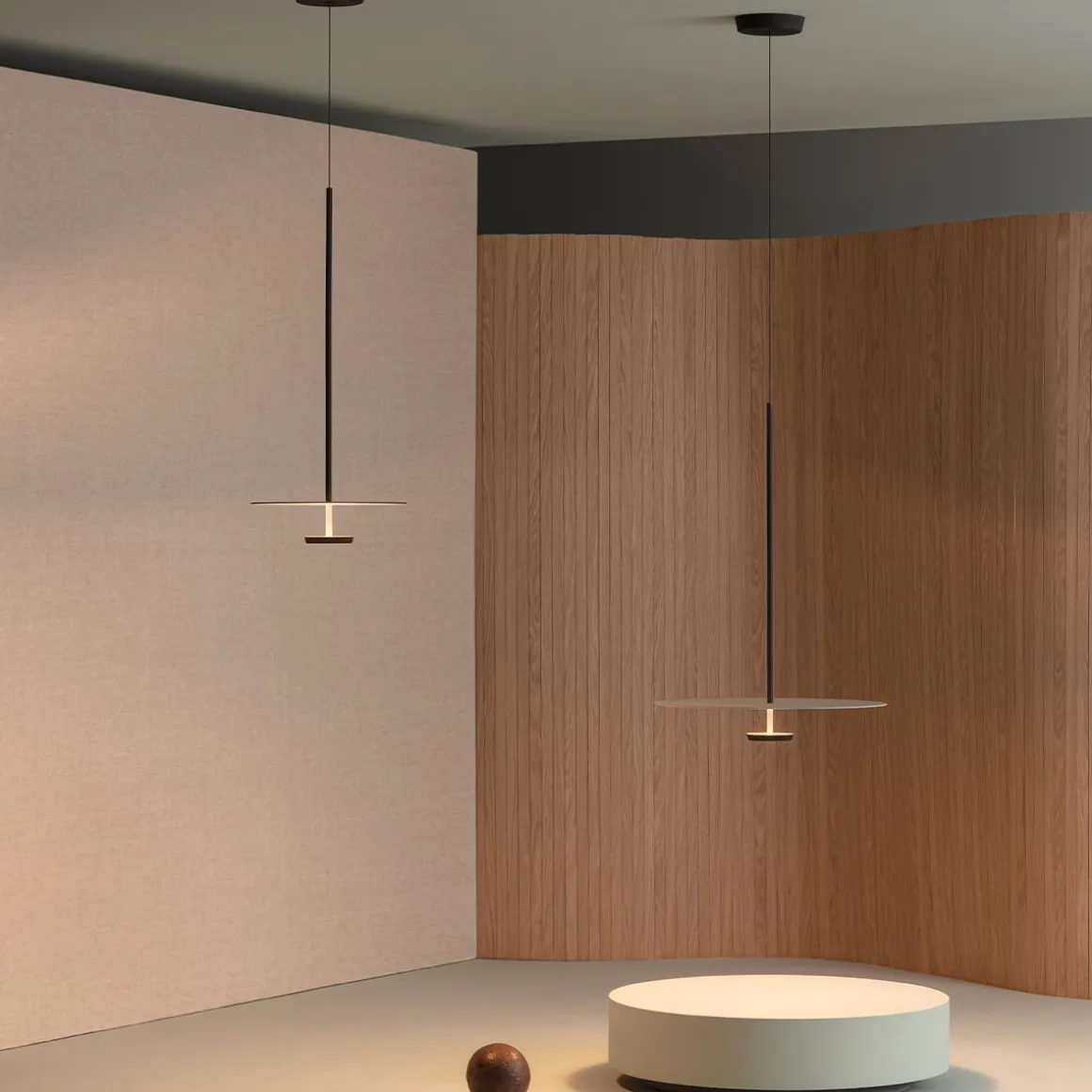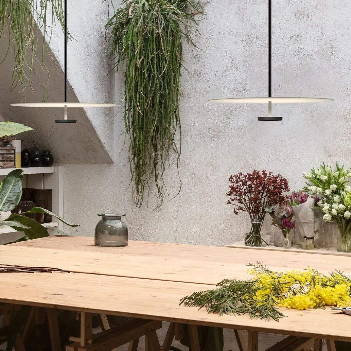 Les lampes Flat sont une création du designer Ichiro Iwasaki. Des plateaux lumineux descendent du plafond jusqu’à former une suspension faite de disques de lumière réfléchie qui s’intègrent à l’architecture. Tous les modèles de la collection Flat sont équipés d’ampoules LED et sont disponibles dans une palette de tons neutres.