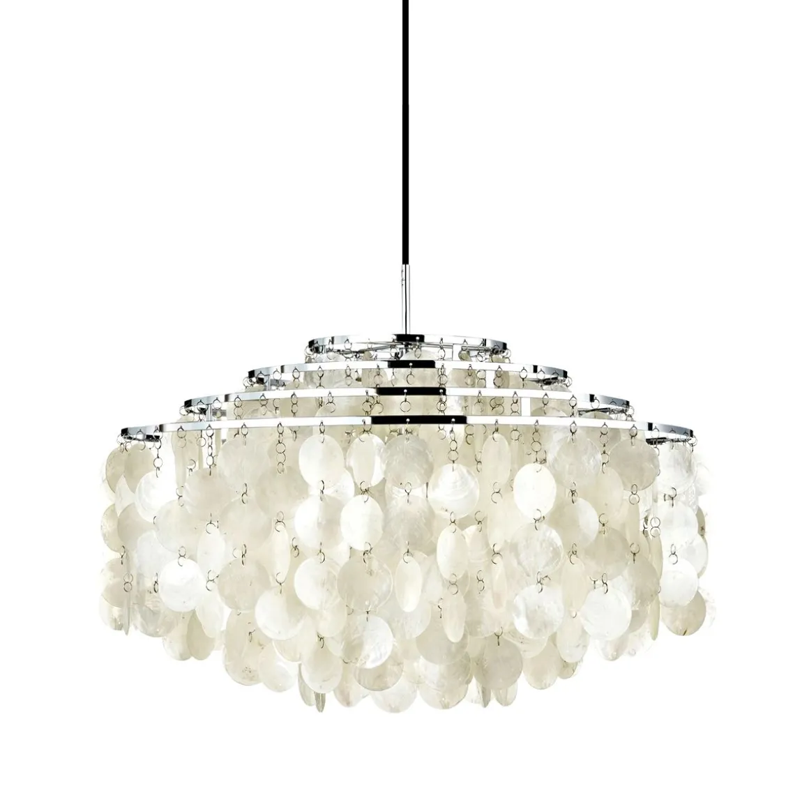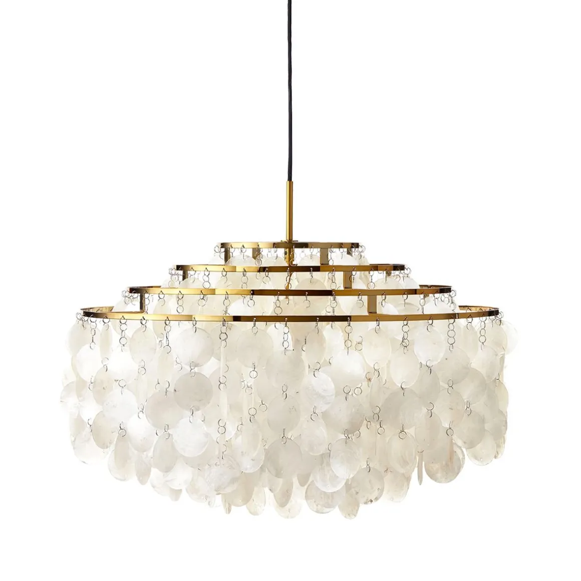 Beaucoup considèrent la collection Fun comme l’un des plus grands chefs-d’œuvre de Verner Panton dans le domaine de la conception d’éclairage. Depuis 1964, cette suspension est source de joie et d’histoires. FUN 10DM est un grand pendentif avec un cadre à quatre anneaux au fini laiton ou chromé.