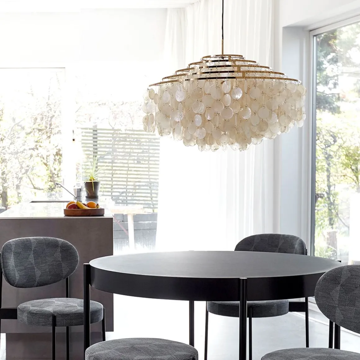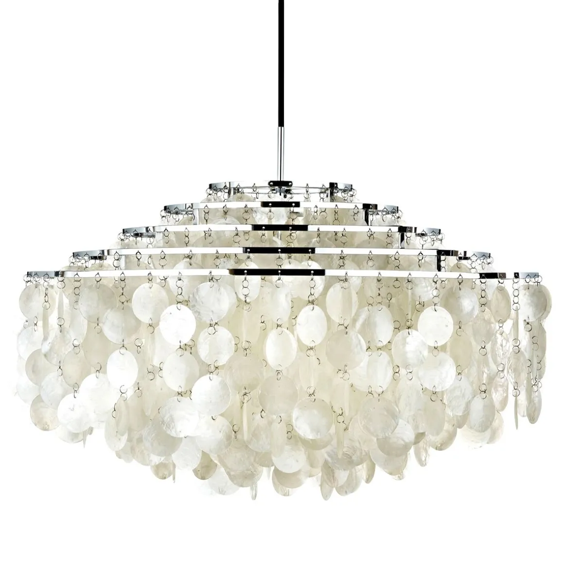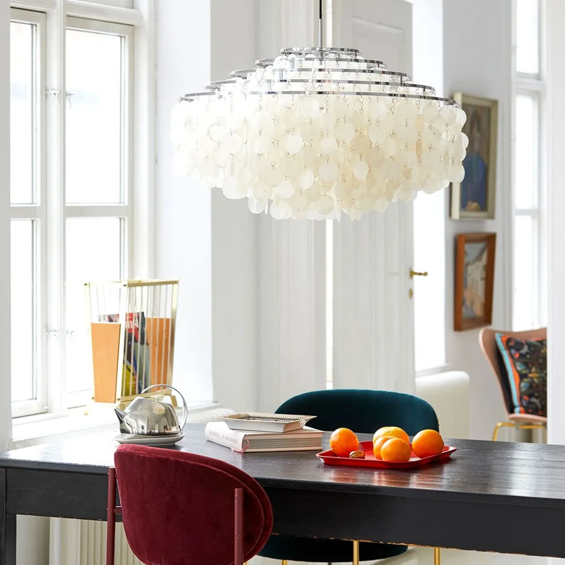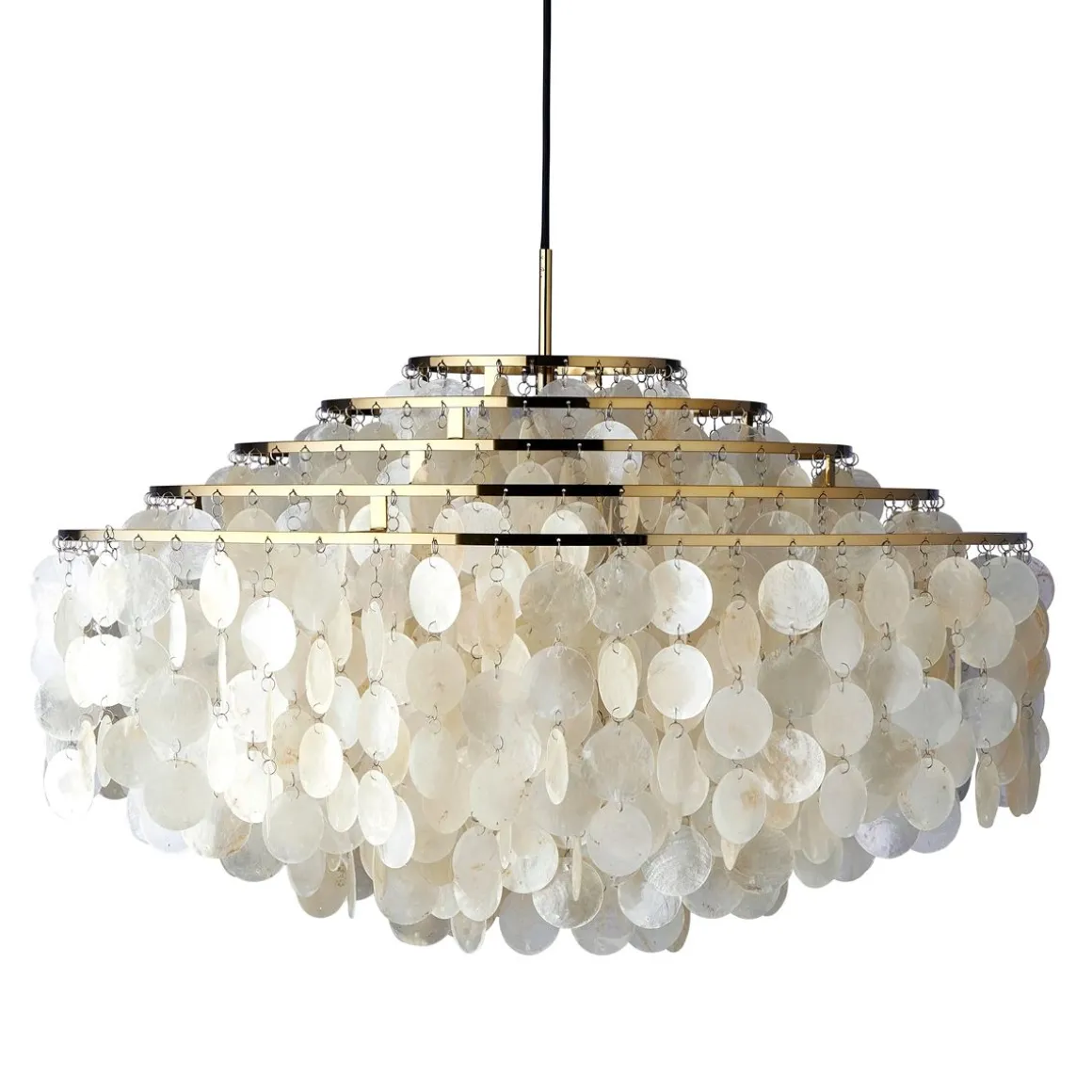 Beaucoup considèrent la collection Fun comme l’un des plus grands chefs-d’œuvre de Verner Panton dans le domaine de la conception d’éclairage. Depuis 1964, cette suspension est source de joie et d’histoires. FUN 11DM est une grande suspension avec un cadre chromé ou laiton à cinq anneaux.