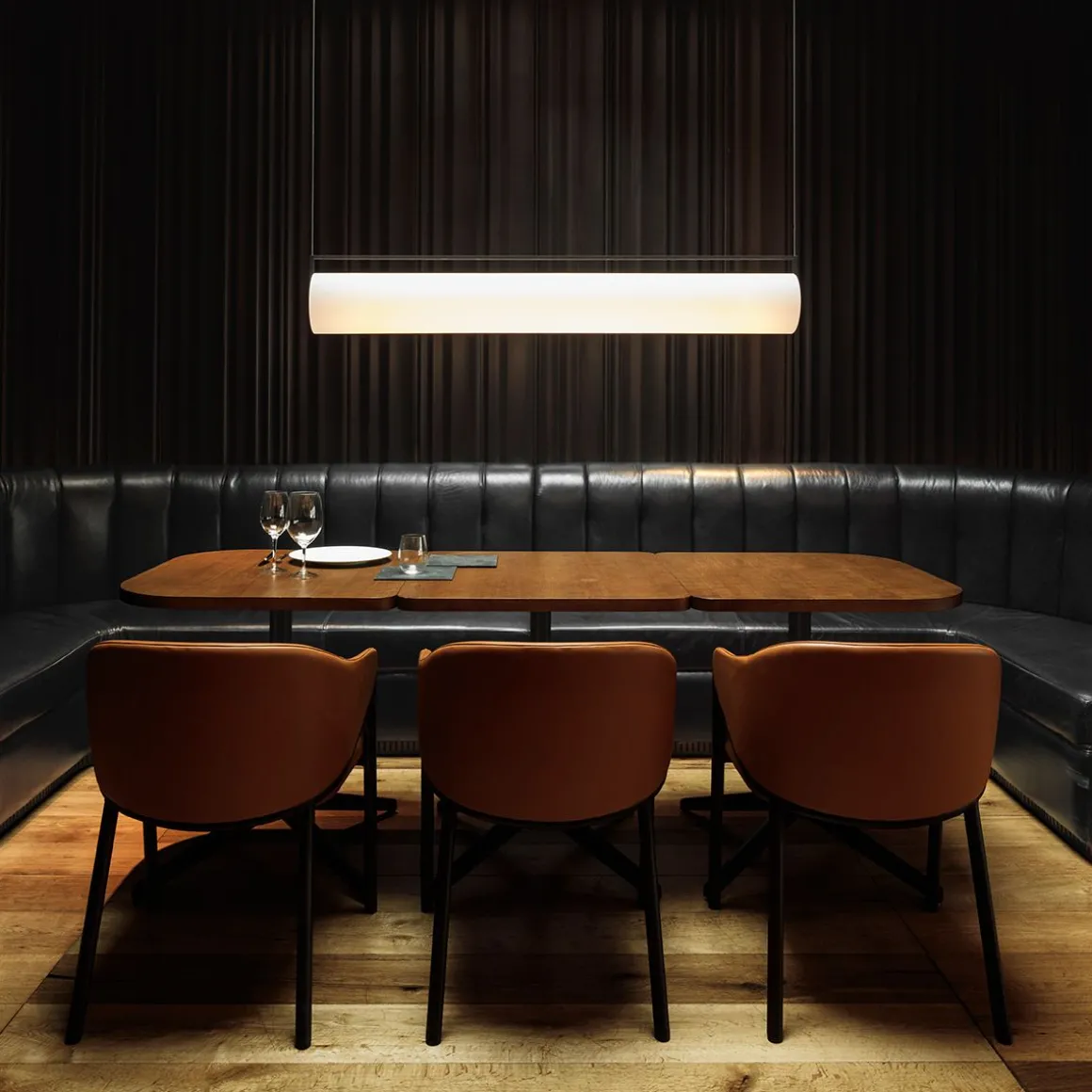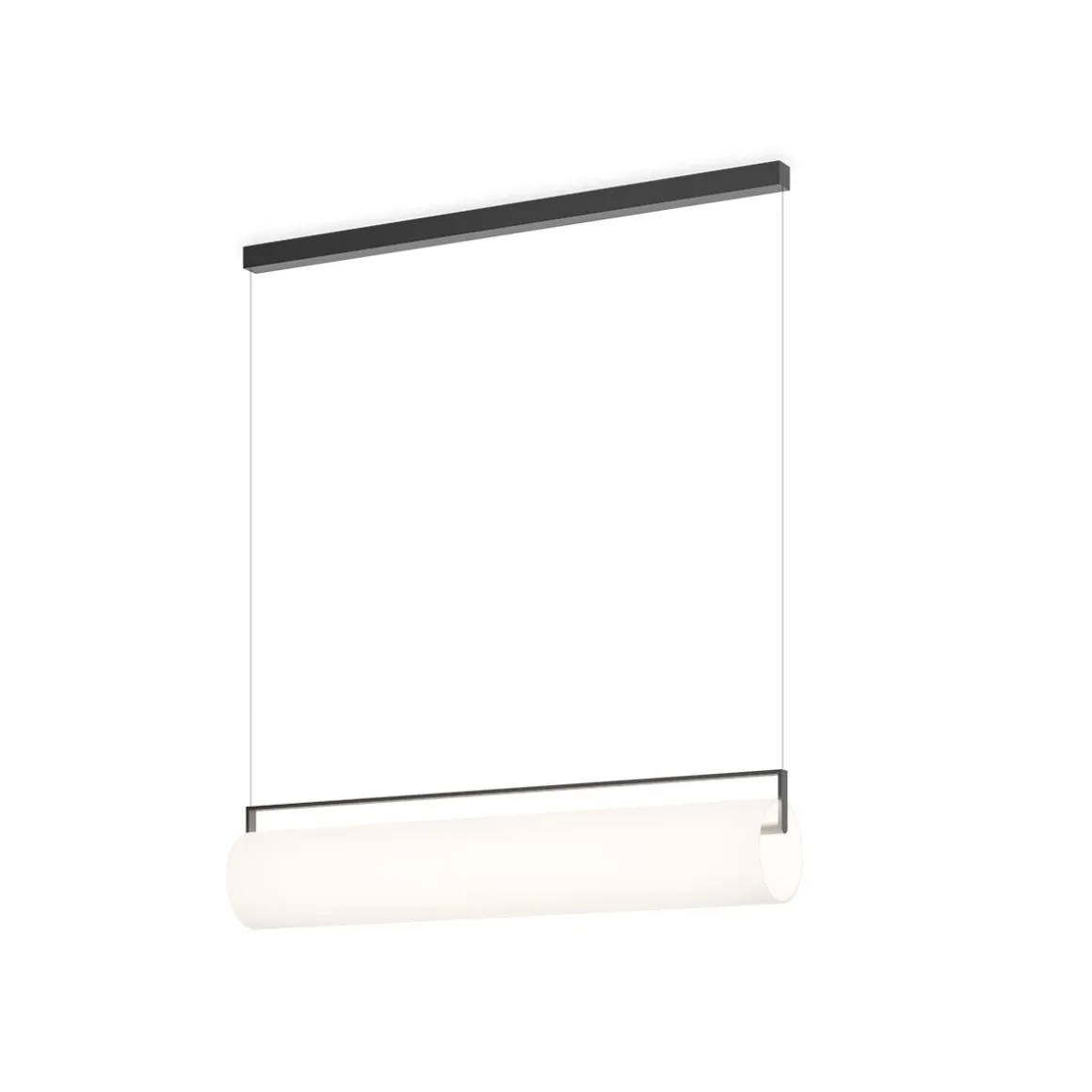 Cette suspension en verre se présente sous la forme d’une barrette de métal ouverte équipée de LEDs, soutenant un diffuseur cylindrique en verre opalin soufflé bouche. Retenue par de fins câbles presque invisibles, elle apporte une lumière chaleureuse, éclairant à 360 degrés.