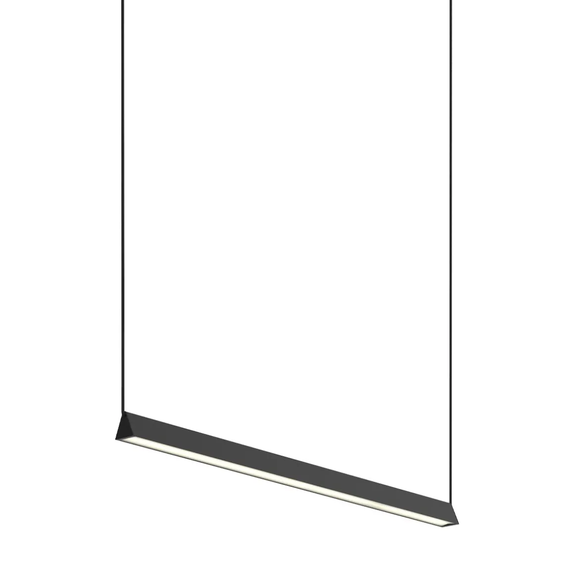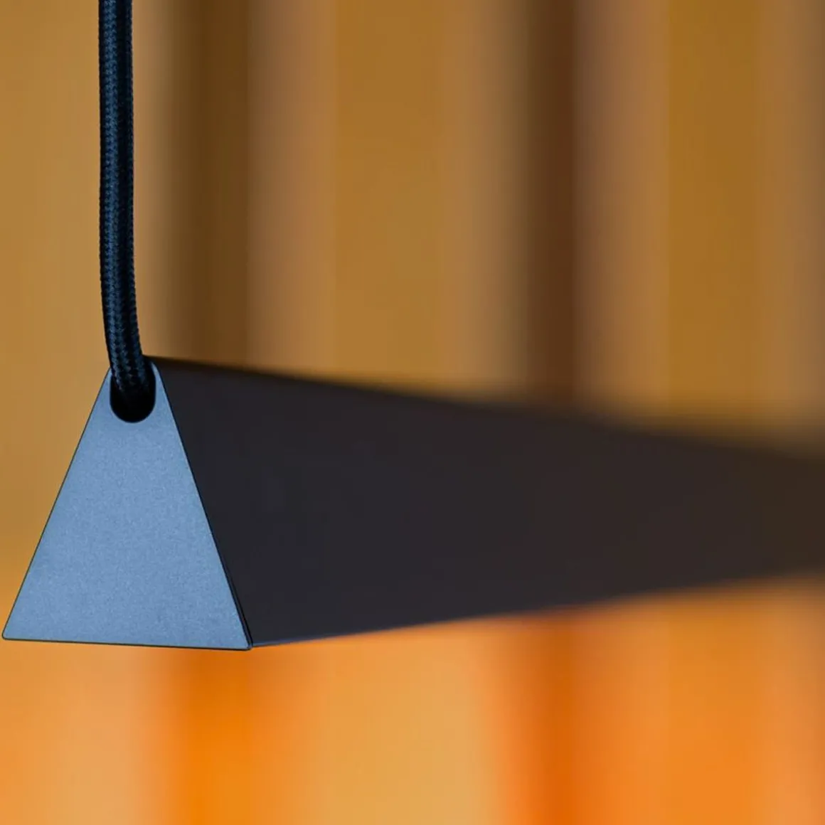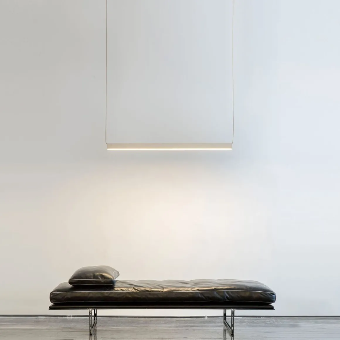 La collection Mile propose une variation sur la suspension linéaire, réduite ici à son expression la plus simple. Un pivot sépare les deux lignes asymétriques de la lampe, créant ainsi un équilibre surprenant. L’éclairage direct et indirect se superposent pour délimiter l’espace. L’utilisation de DEL linéaire et les fils pincés dans la structure accentuent l’impression de lévitation.