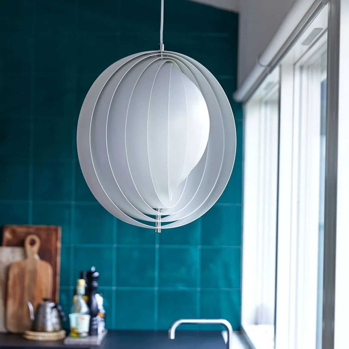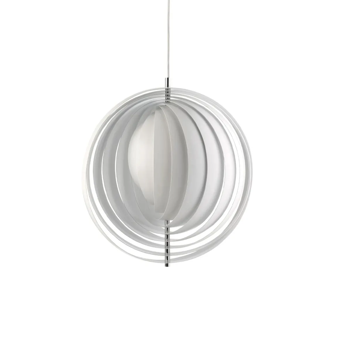 Conçue en 1960, la Moon représente l’une des premières conceptions d’éclairage de Verner Panton. La suspension emblématique se caractérise par son design en éventail avec dix lamelles en forme d’anneau parfaitement positionnées pour fournir une lumière douce, ambiante et sans éblouissement. Les lames réfléchissent et filtrent la lumière et la suspension change d’apparence en fonction de l’angle sous lequel vous la regardez.