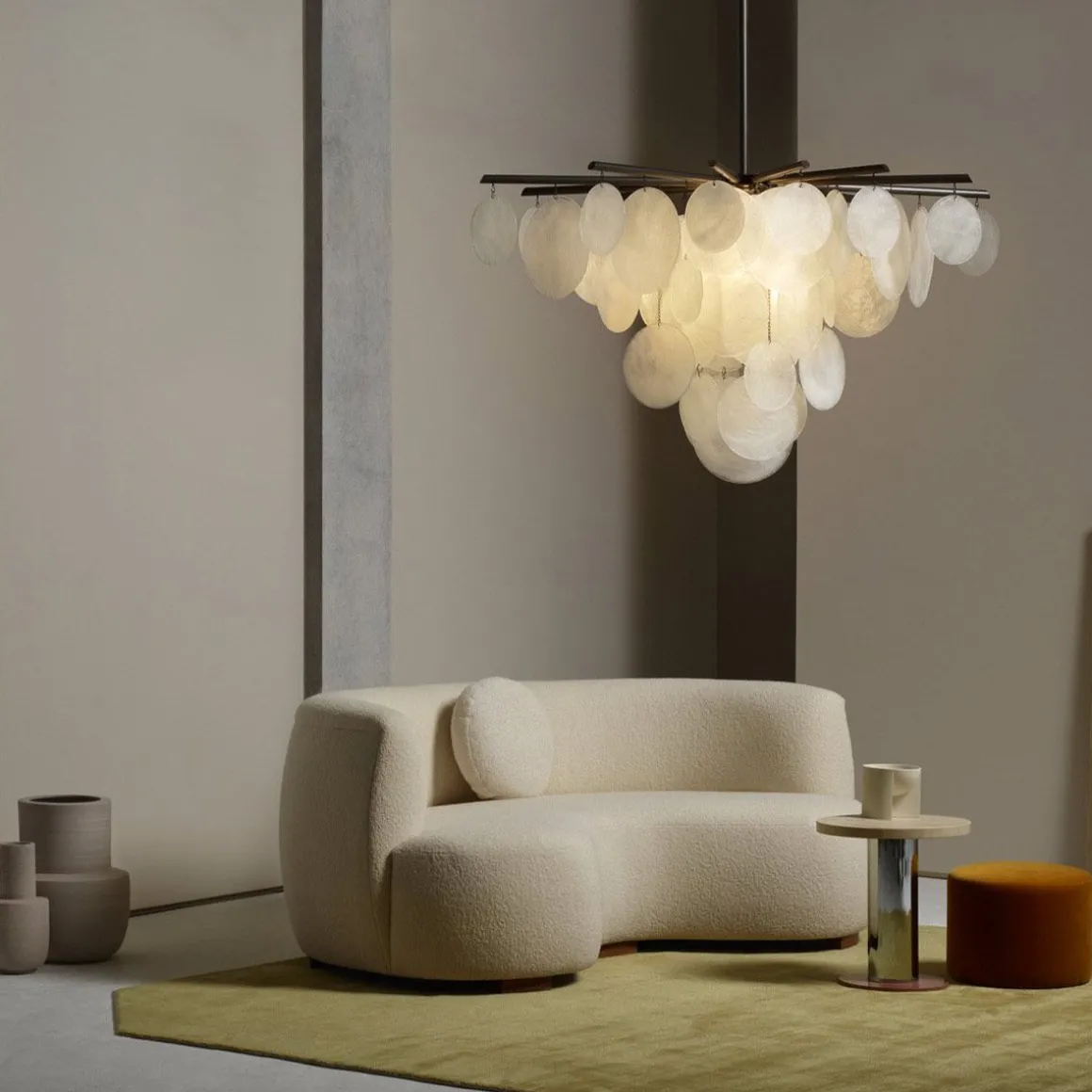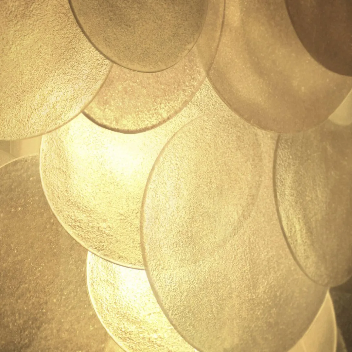 Chaque morceau de verre est unique. Les gouttelettes sont formées à la main par nos artisans en utilisant un processus où se forment des ondulations et des textures cristallines. Le verre translucide est complété et magnifiquement encadré par la ferronnerie symétrique. La lumière émise est une lueur chaude et douce. Faisant référence à l’esthétique rétro et moderne, le Nimbus crée une pièce maîtresse époustouflante et transforme ceux qui le voient.