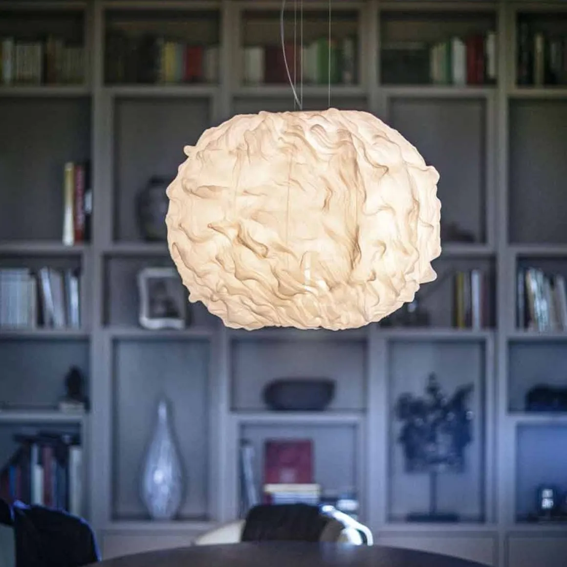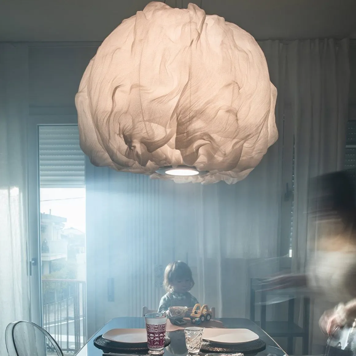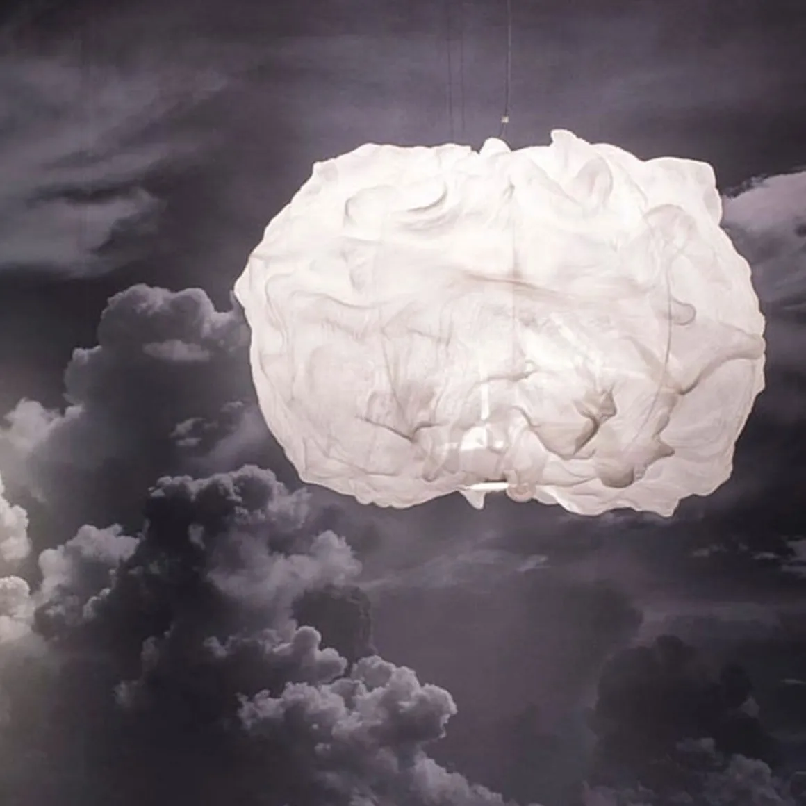 Comme une multitude d’êtres ou de choses regroupées d’une manière apparemment guidée, mais en réalité aléatoire, Nuée génère un contraste entre spontanéité et coordination dans une lampe dont la physionomie ne peut être appréhendée, mais simplement contemplée. Nuée est une lampe de présence théâtrale réalisée en superposant un tissu technique tridimensionnel, que la lumière traverse de manière irrégulière et évocatrice. Le fil continu du tissage permet des déformations qui deviennent poétiques: des zones sombres apparaissent sur une base blanche, comme un nuage qui assombrit sa couleur dans les zones plus compactes.