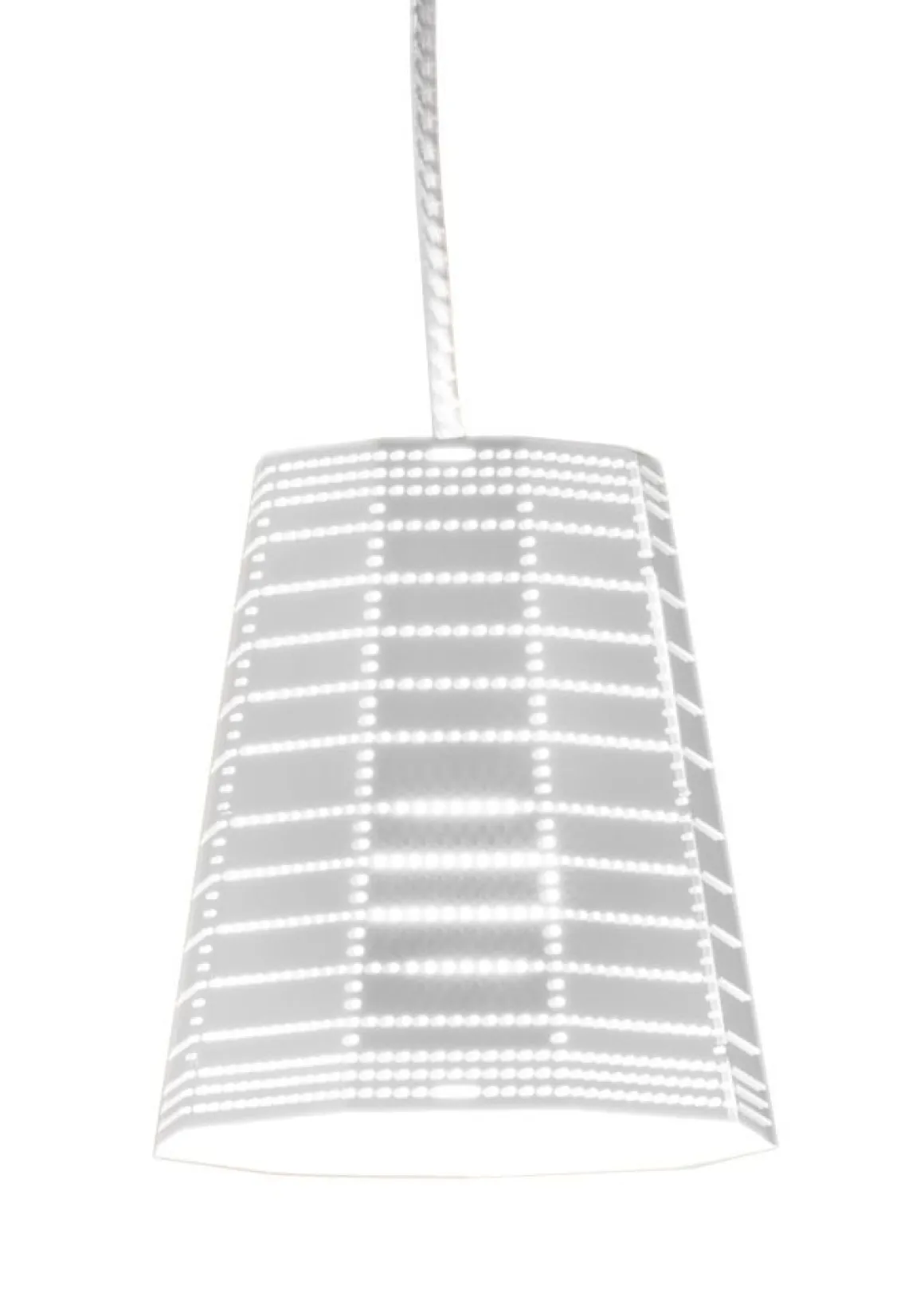 Cette suspension se compose d’une fine feuille d’d’aluminium perforée puis pliée pour obtenir une forme facettée. Avec son effet tissé délicat et raffiné, ce filet métallique subtilement ajouré possède la légèreté du tissu. Les perforations forment un motif ultra graphique tout en assurant une excellente répartition lumineuse. La lumière fragmentée s’infiltre par les multiples trous enveloppant l’abat-jour d’un halo lumineux doux et décoratif qui met en valeur les reliefs de sa surface. Null Vector crée ainsi des jeux d’ombres féériques, pour un rendu tout en poésie et en légèreté.