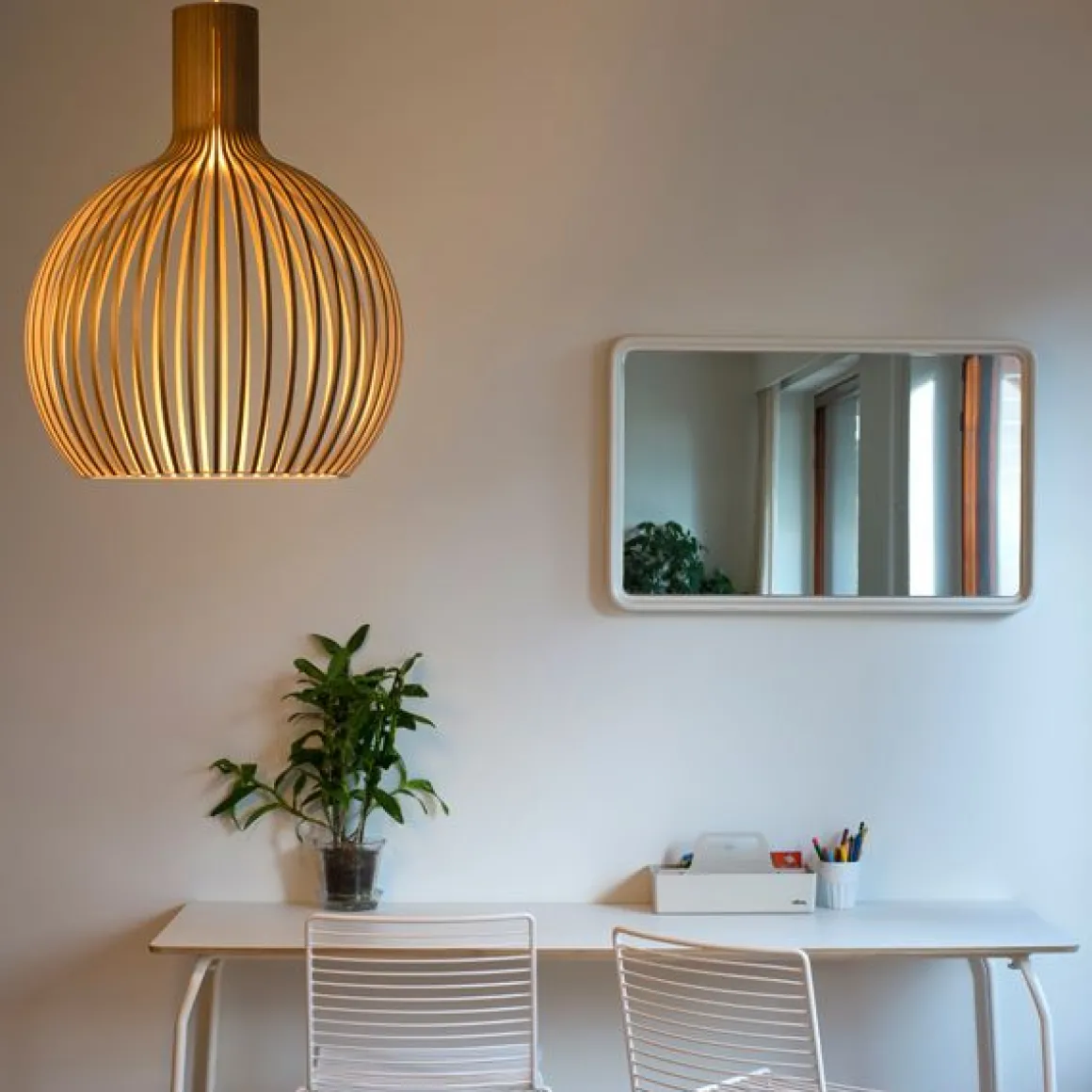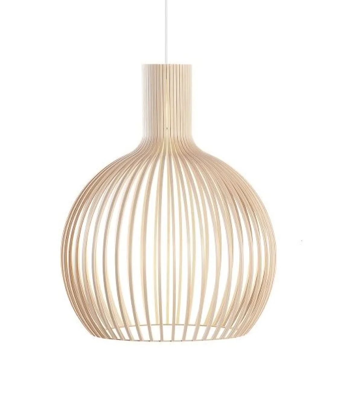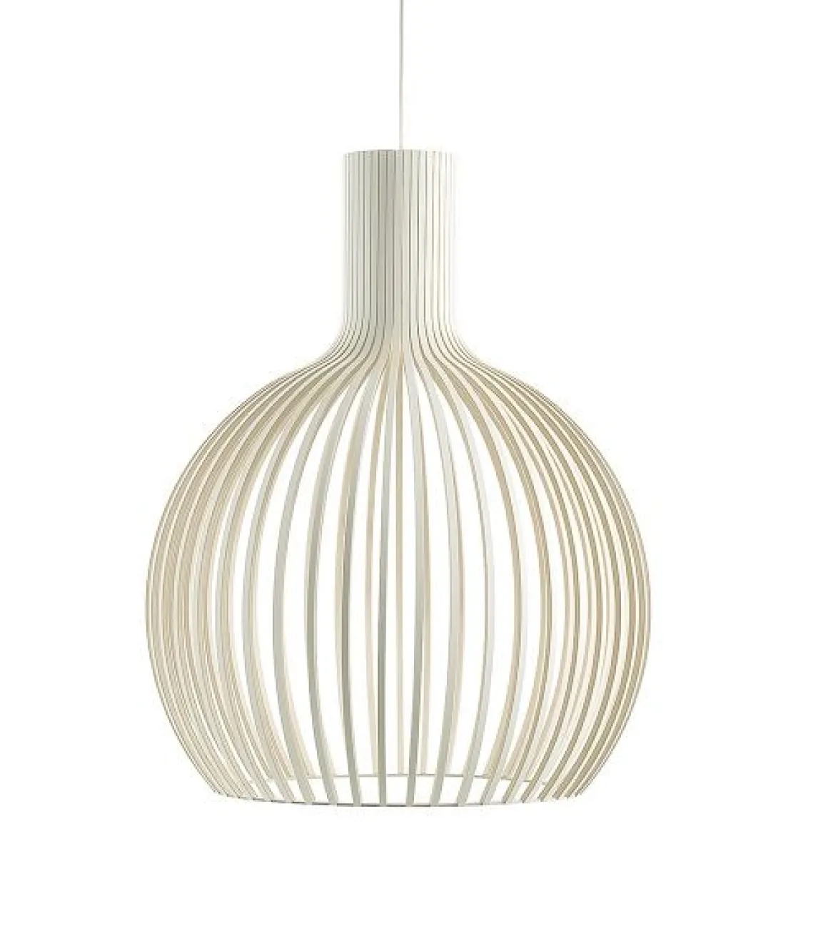 Octo est une suspension de la marque Secto design. La suspension Octo est entièrement fabriquée à la main par des artisans hautement qualifiés et certifiés de Finlande. Les lattes des abat-jours sont reliées par des anneaux réalisés en « aircraft plywood », matériau utilisé en aéronautique car hautement résistant à la chaleur. Secto Design a une démarche citoyenne sur la réduction de son empreinte écologique en s’approvisionnant localement en bois et en recyclant ses déchets comme bois de chauffage, en jouets pour les crèches ou pour les écoles de menuiserie. Cette suspension prend une forme plus arrondie telle une sphère suspendue. Quelque soit le modèle choisi, ces suspensions sont d’une élégance parfaite et apporte chaleur et naturel dans votre intérieur.