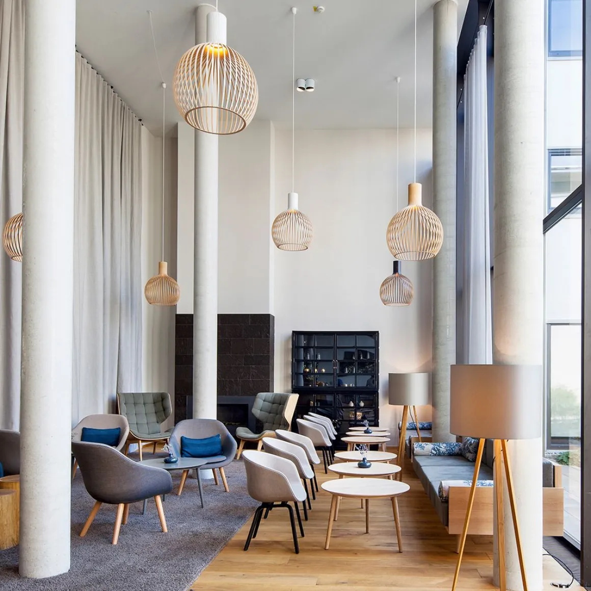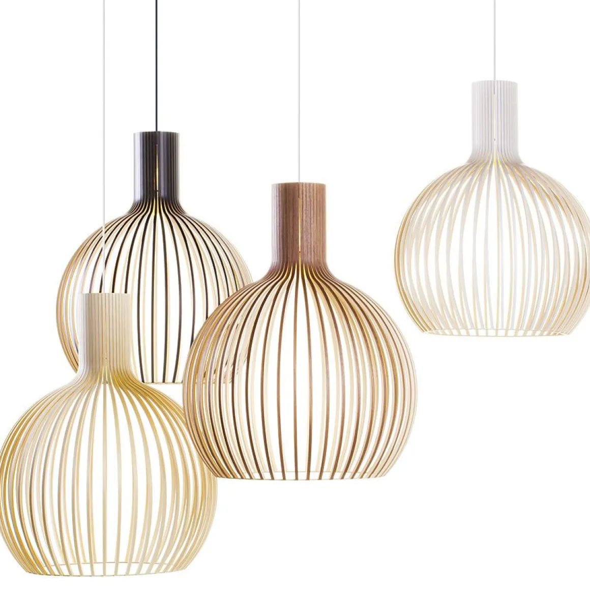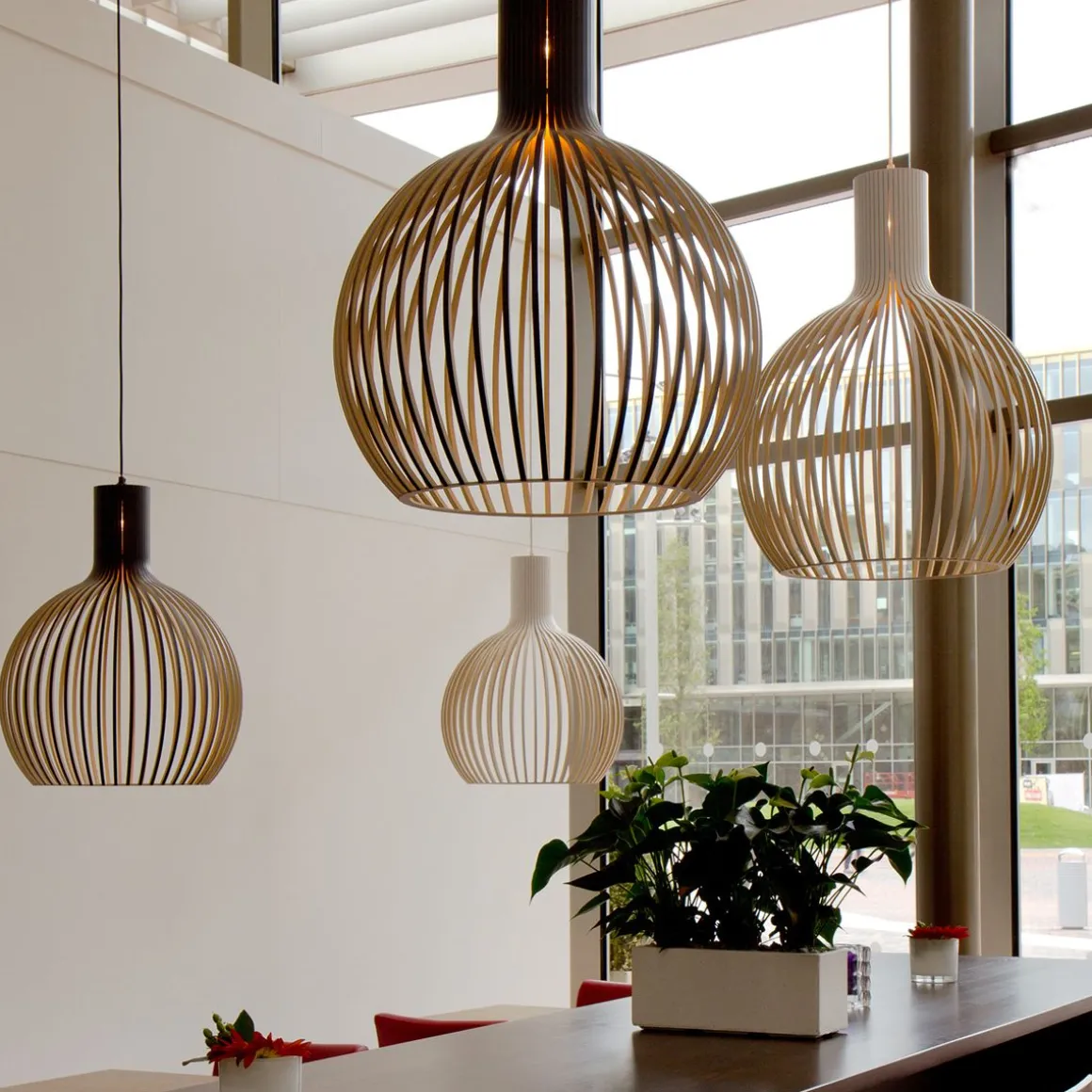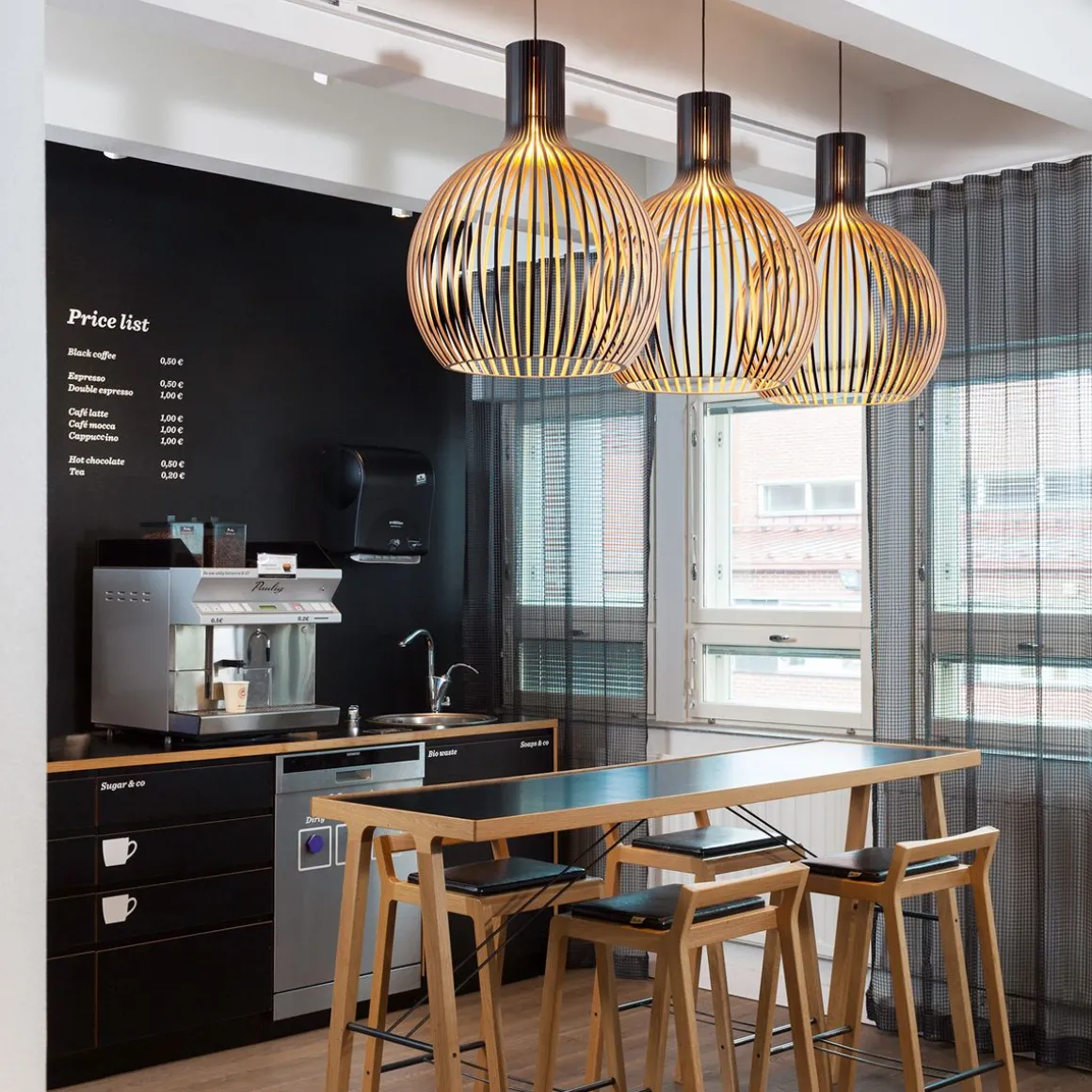 Octo est une suspension de la marque Secto design. La suspension Octo est entièrement fabriquée à la main par des artisans hautement qualifiés et certifiés de Finlande. Les lattes des abat-jours sont reliées par des anneaux réalisés en « aircraft plywood », matériau utilisé en aéronautique car hautement résistant à la chaleur. Secto Design a une démarche citoyenne sur la réduction de son empreinte écologique en s’approvisionnant localement en bois et en recyclant ses déchets comme bois de chauffage, en jouets pour les crèches ou pour les écoles de menuiserie. Cette suspension prend une forme plus arrondie telle une sphère suspendue. Quelque soit le modèle choisi, ces suspensions sont d’une élégance parfaite et apporte chaleur et naturel dans votre intérieur.