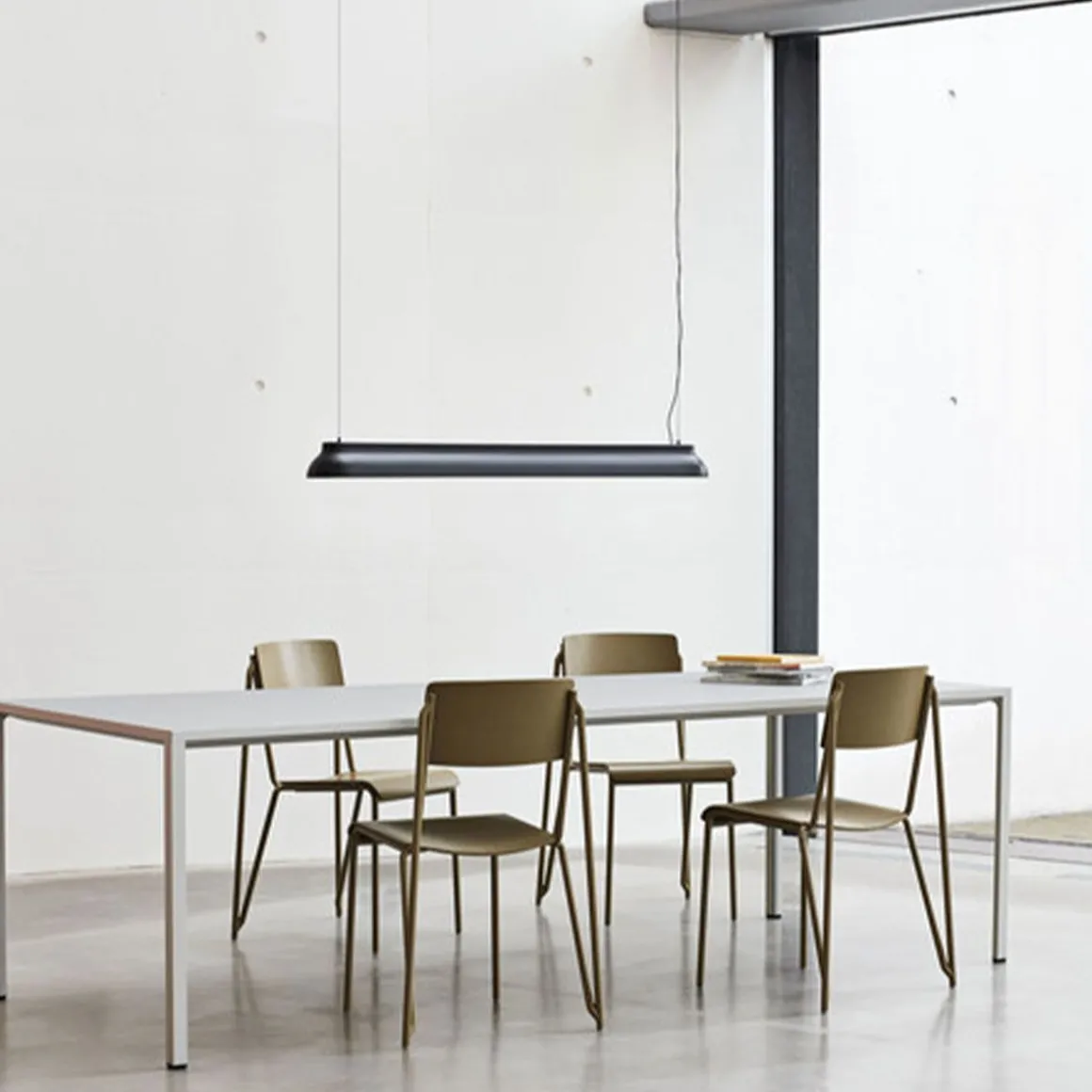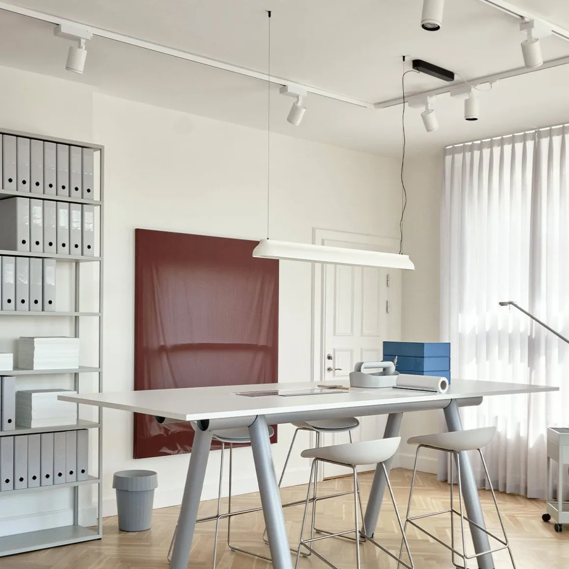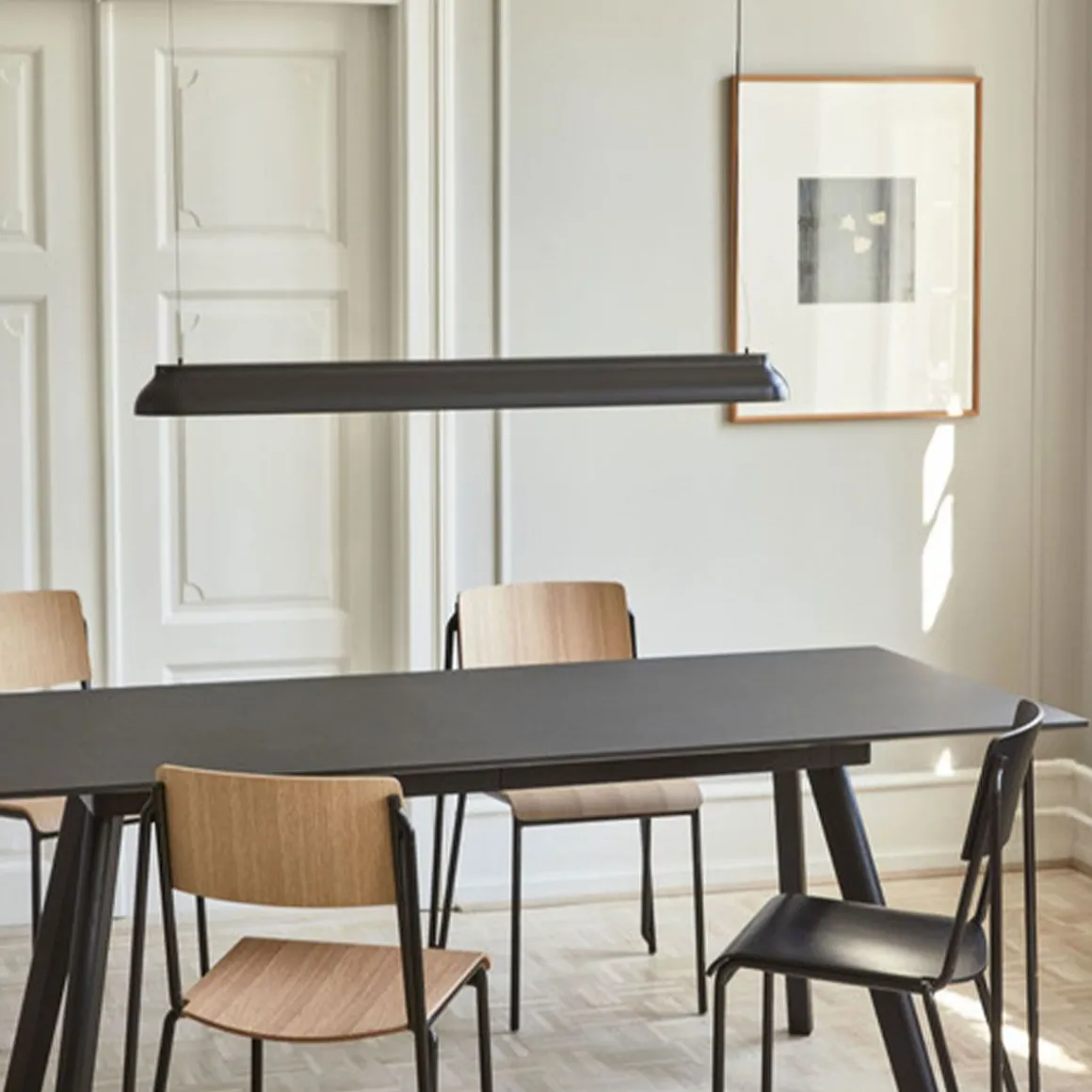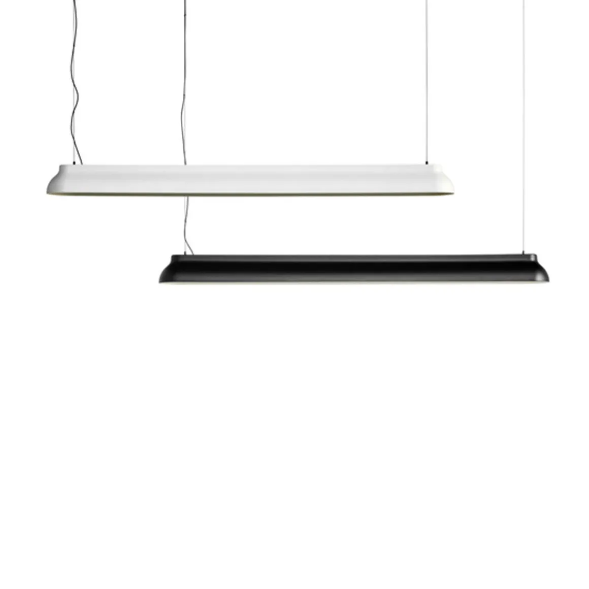 Suspension PC Linéaire de Hay. PC Linear de Pierre Charpin est le dernier membre à rejoindre la famille des lampes PC. Le nouveau design partage le même profil simple et élégant qui est présent dans le reste de la famille. L’abat-jour du PC Linear est pressé à partir d’un seul composant en aluminium avec une finition pulvérisée à l’eau. La conception linéaire est idéale pour suspendre au-dessus des tables de réunion ou de salle à manger, ainsi que pour éclairer les étagères d’exposition dans les espaces commerciaux. Le PC Linear est disponible en noir ou en blanc et convient à la fois pour un usage professionnel et domestique.