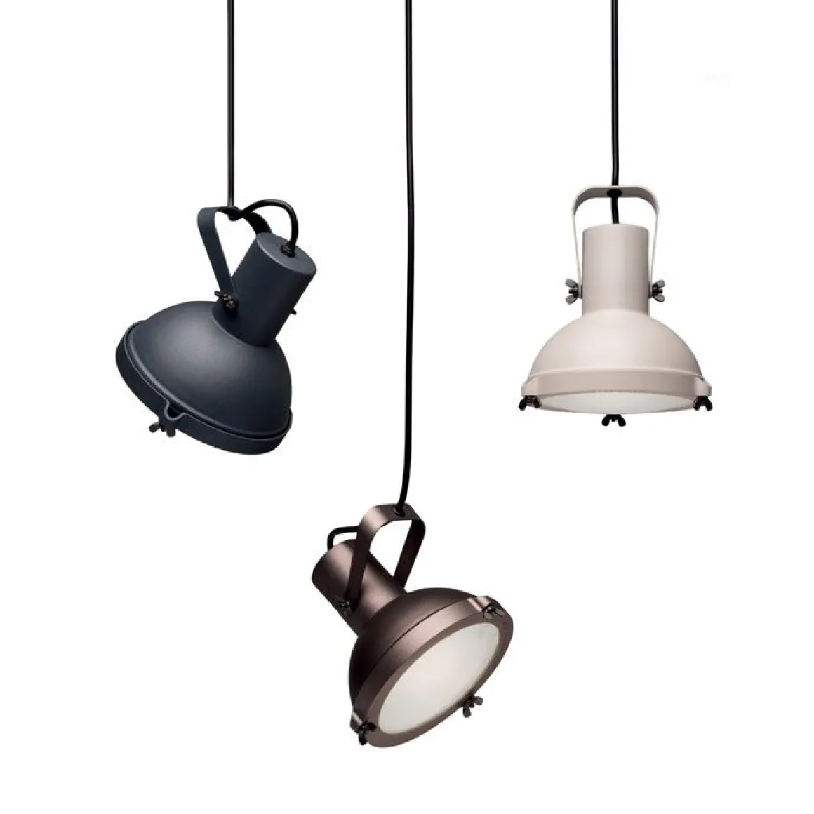 Version Mini du Projecteur 165 orientable. Disponible en applique ou suspension. Corps en aluminium, verni bleu, blanc sable ou moka. Verre diffuseur bombé et sablé à l’intérieur. Les écrous papillon de verrouillage sont chromés noir comme le reste de la visserie. La suspension projecteur 165 créé une lumière diffuse et orientable. Le culot E27 permet l’utilisation de lampes fluorescentes ou LED.