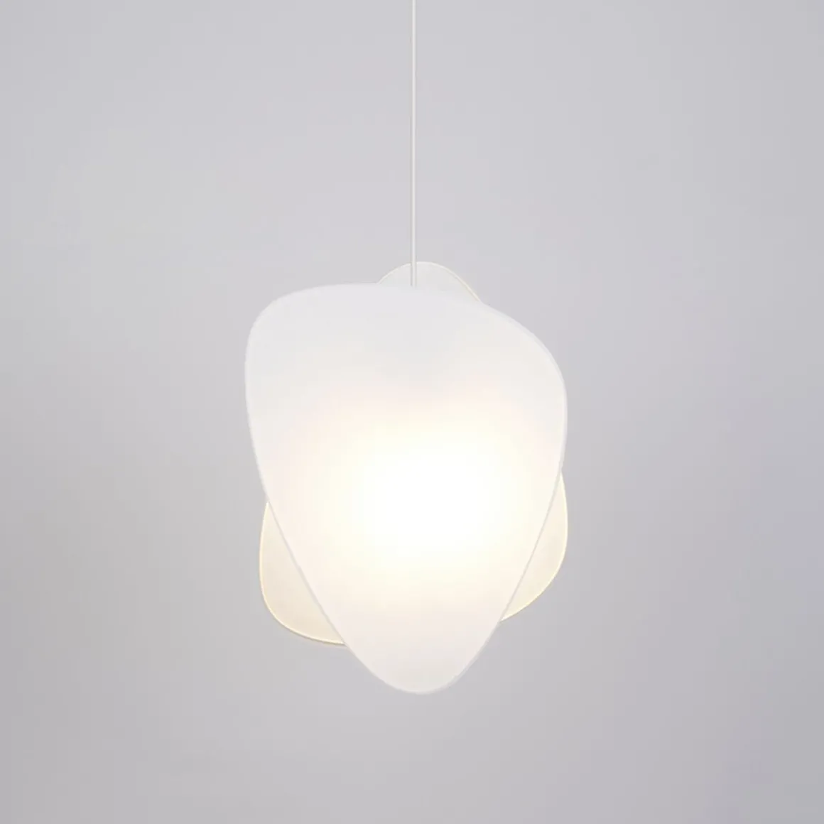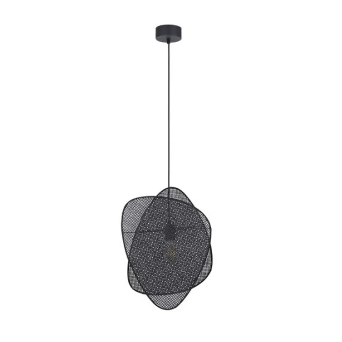 Suspension une lumière structure en métal peint, deux écrans en papier. Équipée d’une cordelière textile et d’un pavillon en métal adaptable DCL.