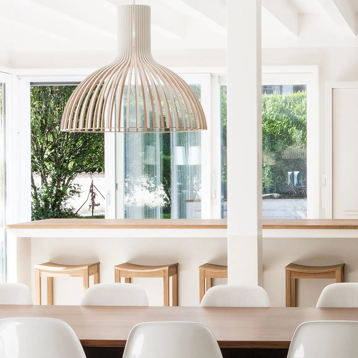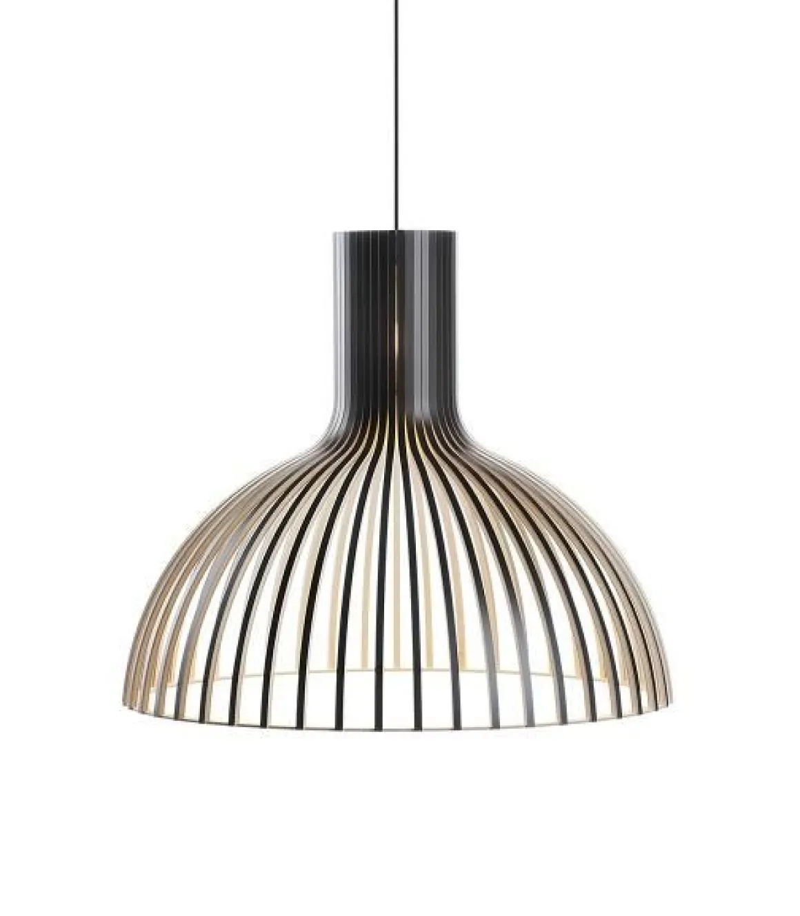 La suspension Victo, avec sa forme arrondie, est entièrement fabriqués à la main par des artisans hautement qualifiés certifiée de Finlande. Les lattes des abat-jour sont reliées par des anneaux réalisés en » aircraft plywood « , matériau utilisé en aéronautique car hautement résistant à la chaleur. Secto Design a une démarche citoyenne sur la réduction de son empreinte écologique en s’approvisionnant localement en bois et en recyclant ses déchets comme bois de chauffage, en jouets pour les crèches ou pour les écoles de menuiserie. Avec son style design et sa forme arrondie, cette suspension habille différents types de pièces. Très raffinée, elle devient un véritable élément de décoration grâce à son look tendance.